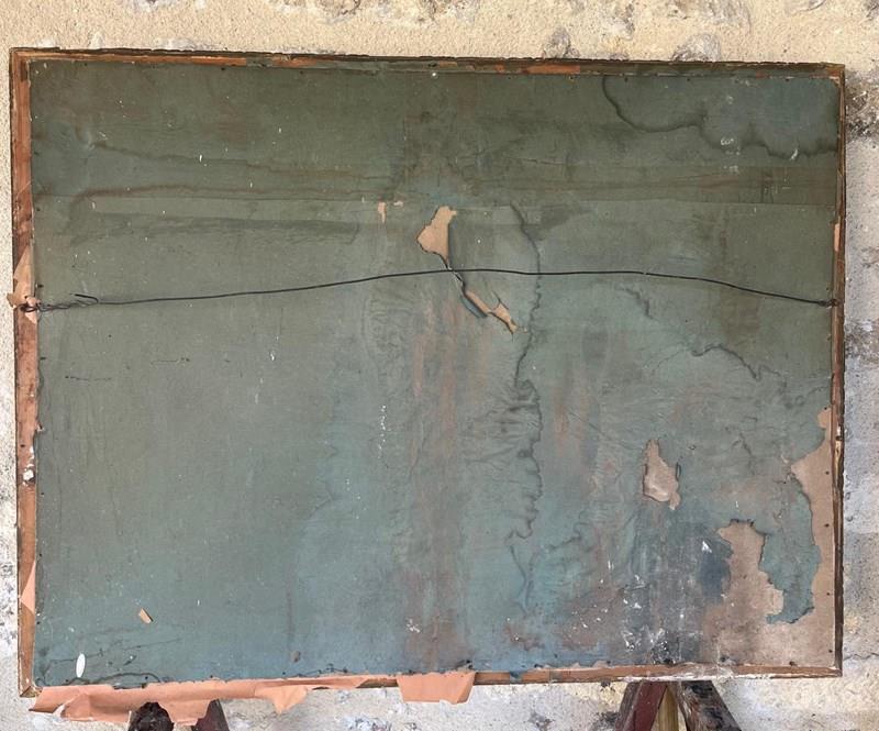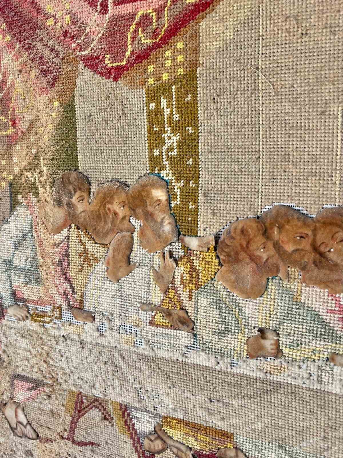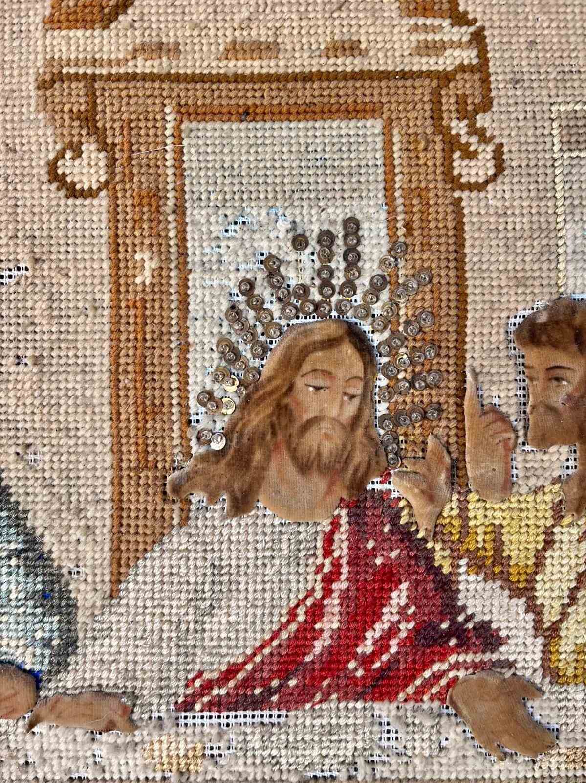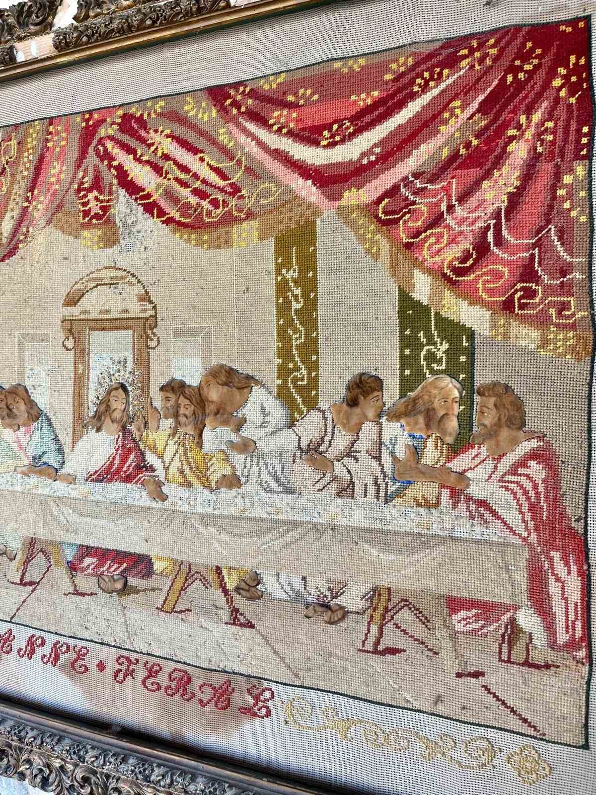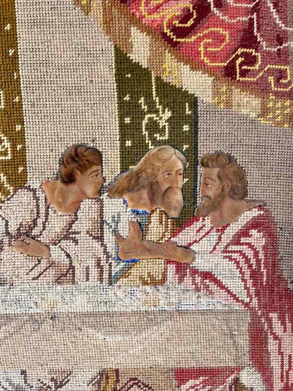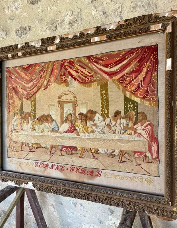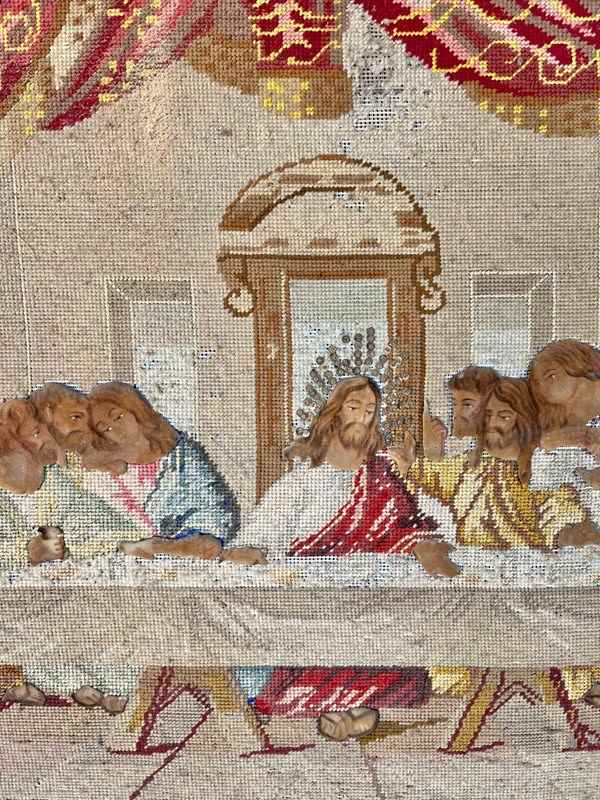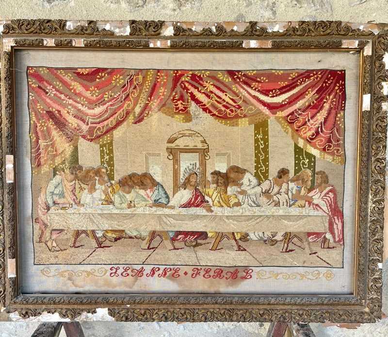 Late 18th early 19th century embroidery of the last supper with heads, hands and feet painted in canvas in old maybe original frame size 96cm by 85cm. The frame is as seen in the image.