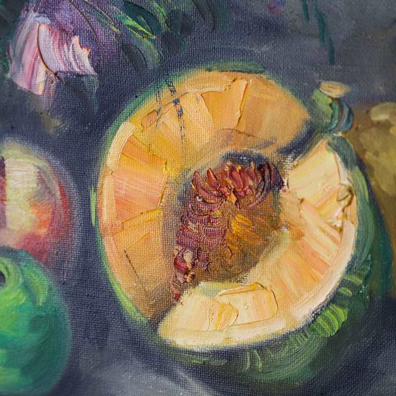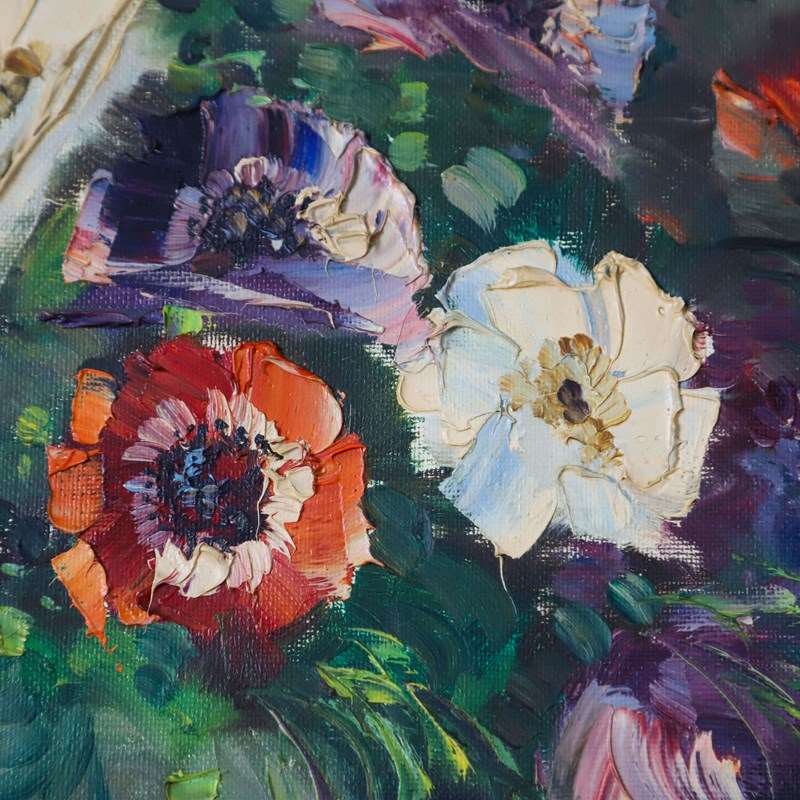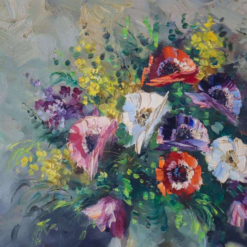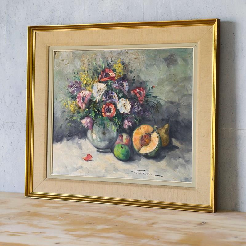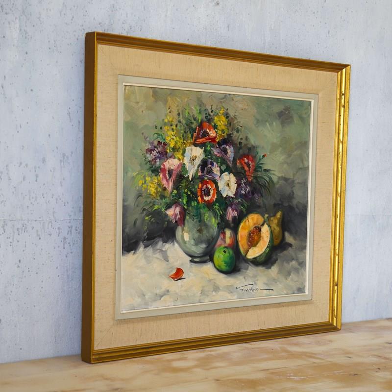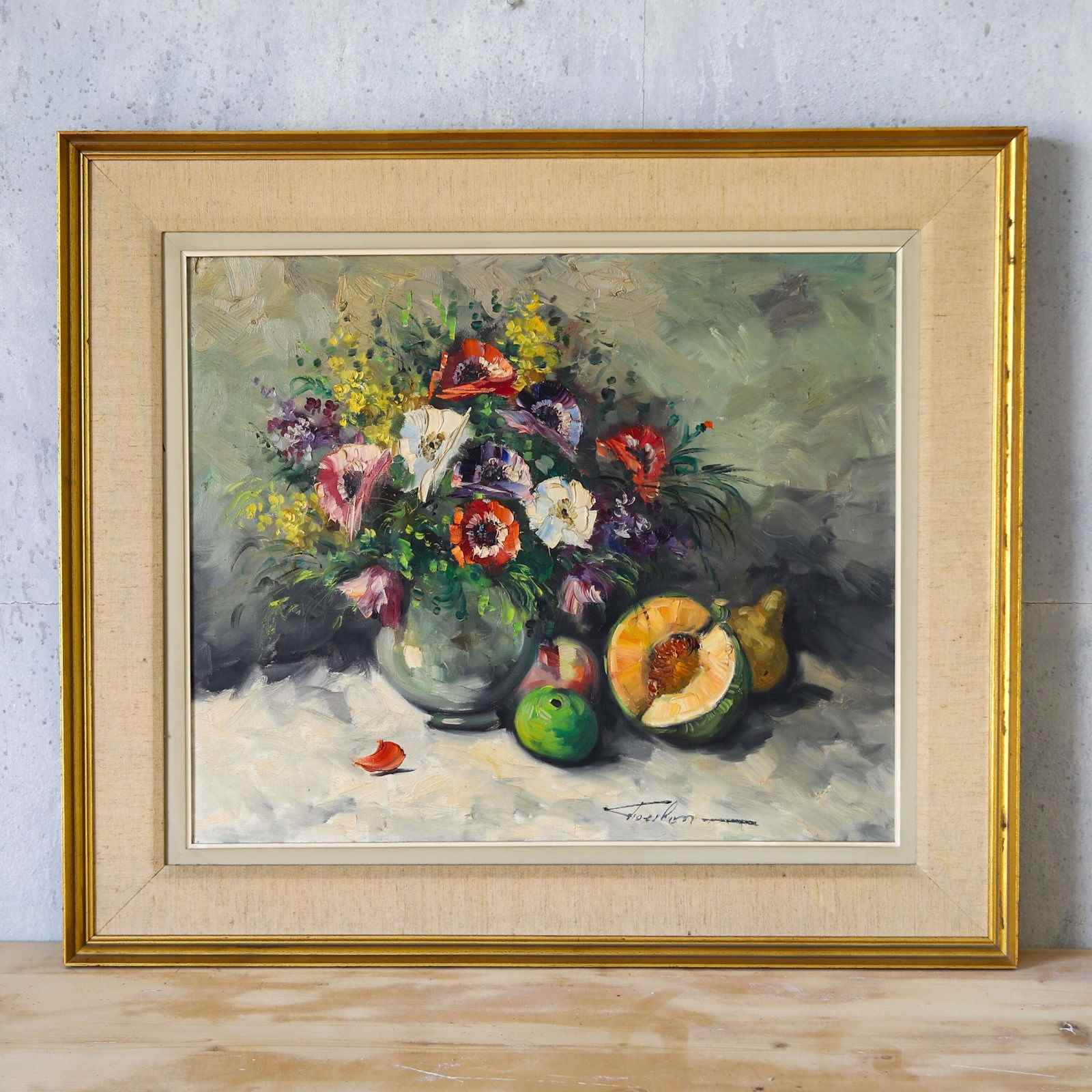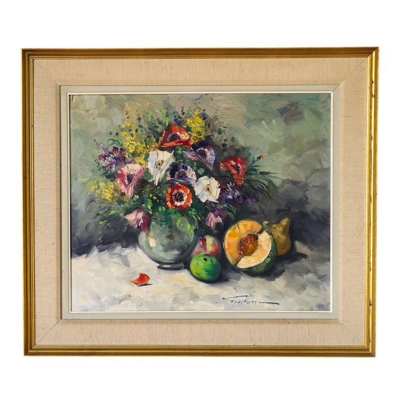 Charming English Still Life: Anemones & Fruit, 1940s-50s, Gilt Moulded Frame