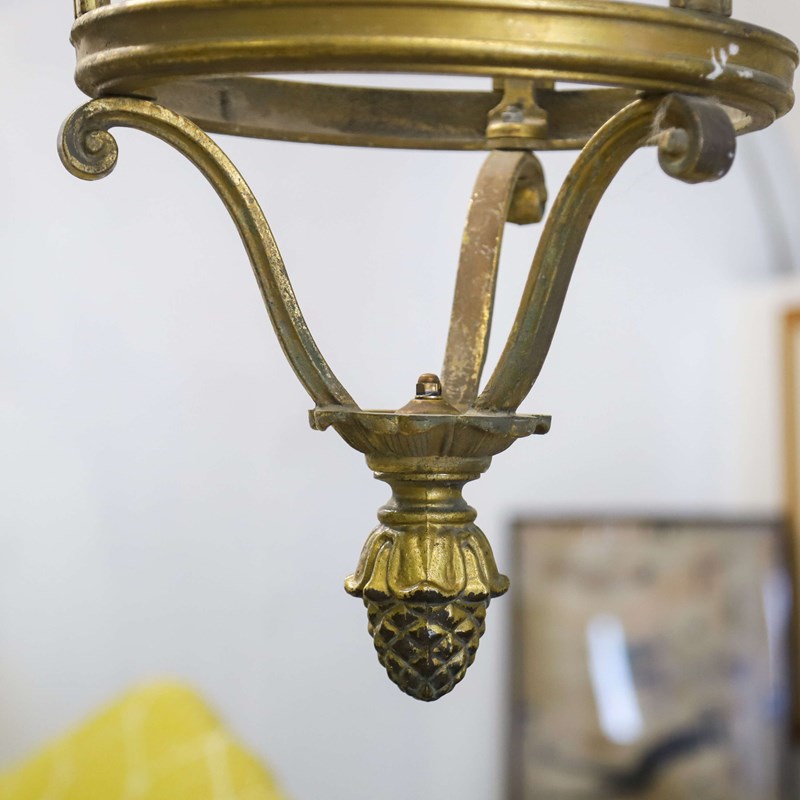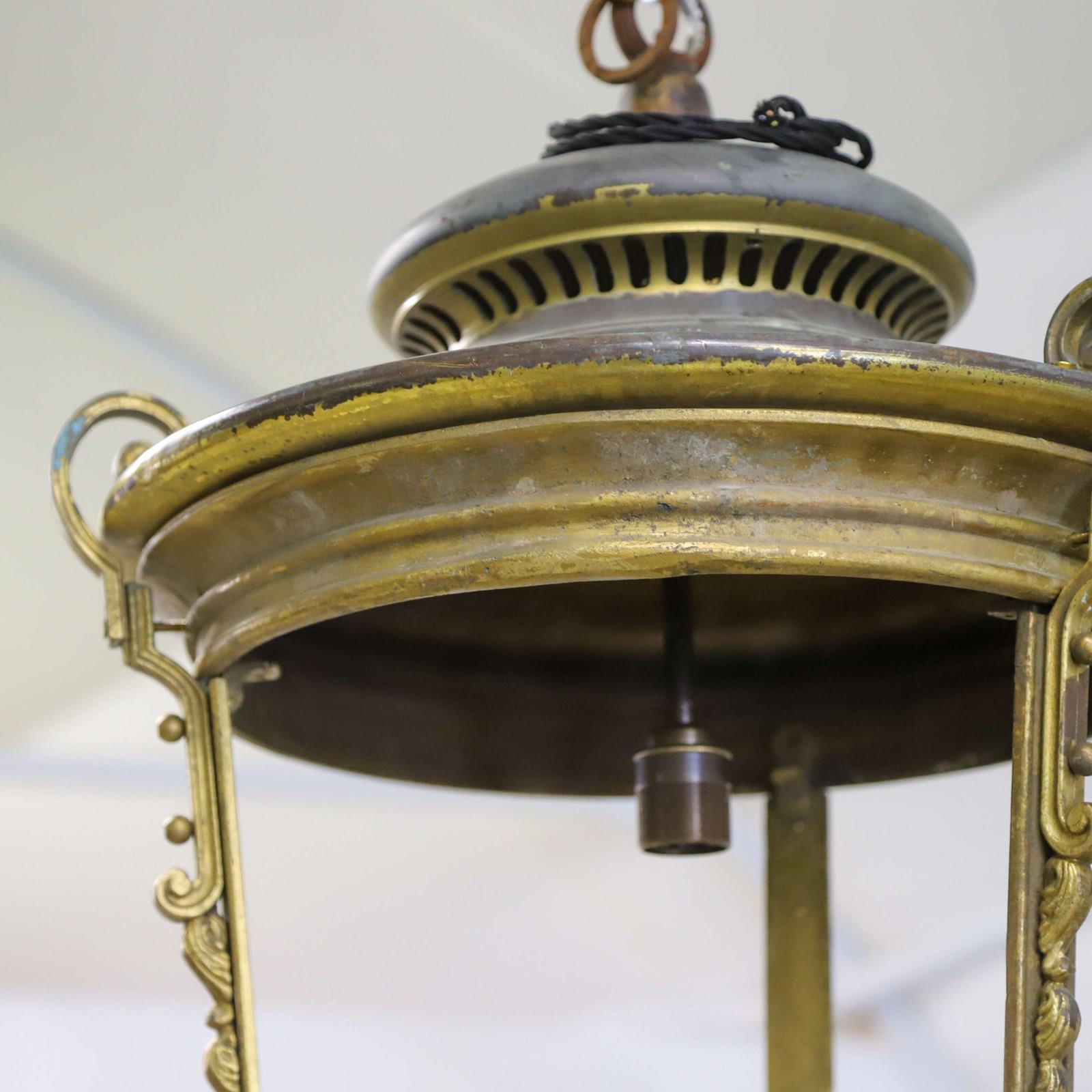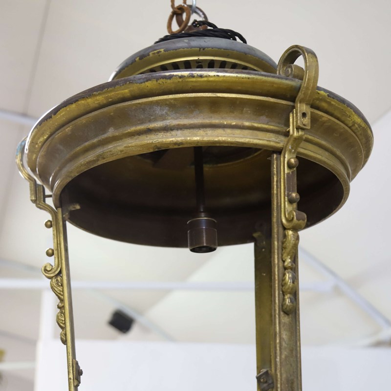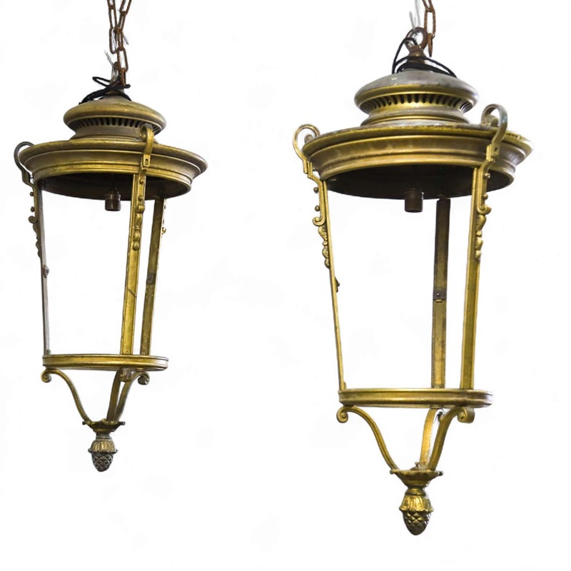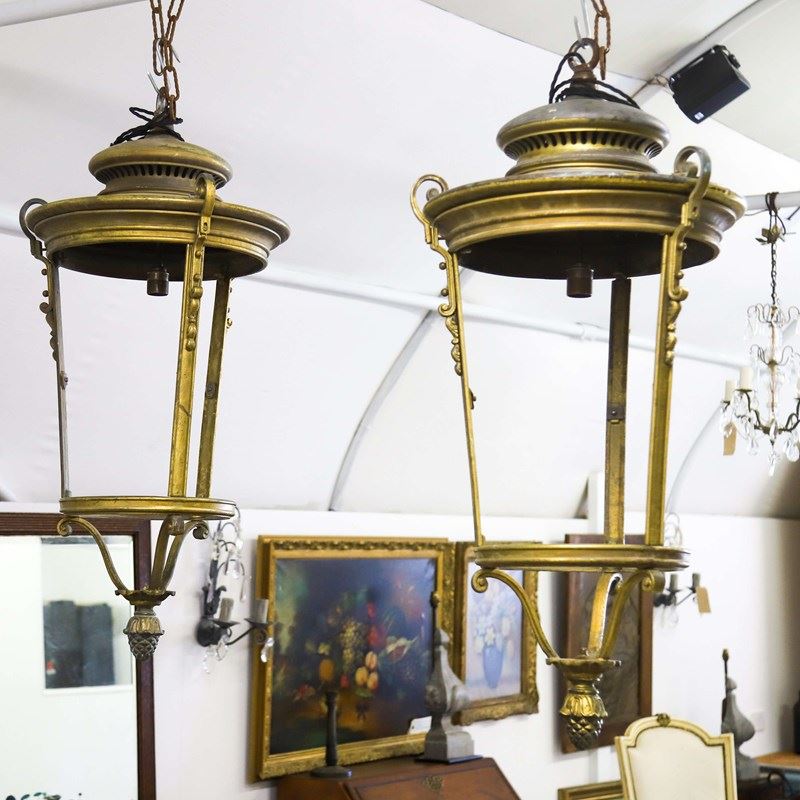 Pair of French street lanterns converted into hanging lanterns. Fantastic quality heavy duty brass and Iron. Uk compliant wiring and pat tested.Quite a statement inside or outside. In good condition - no glass