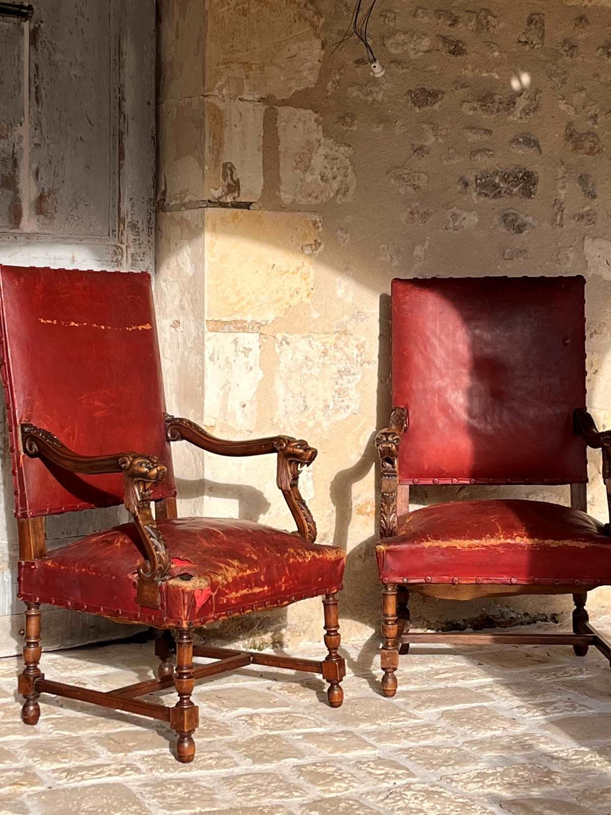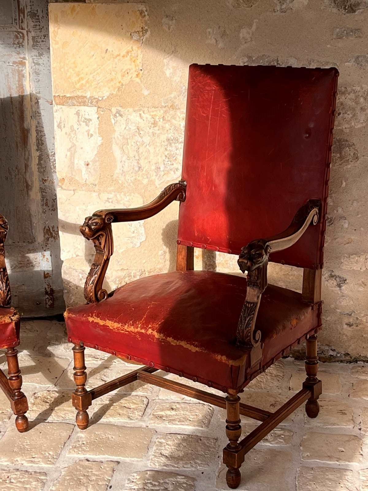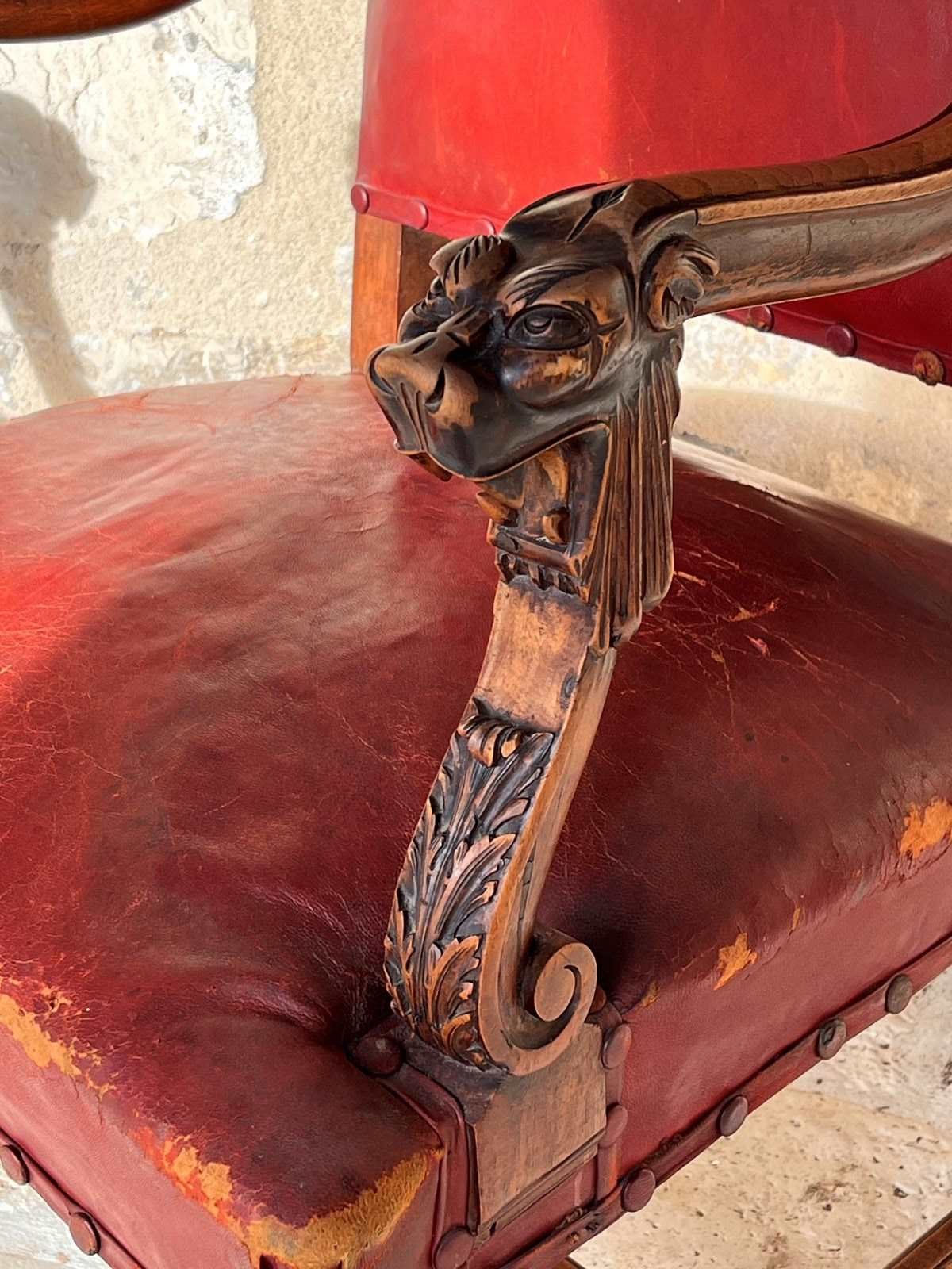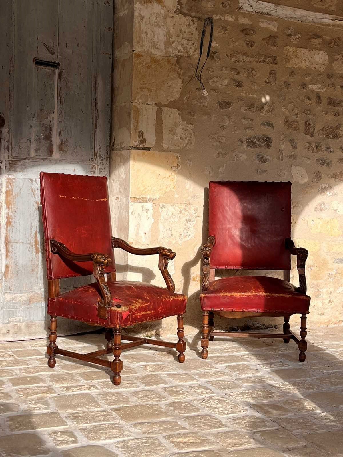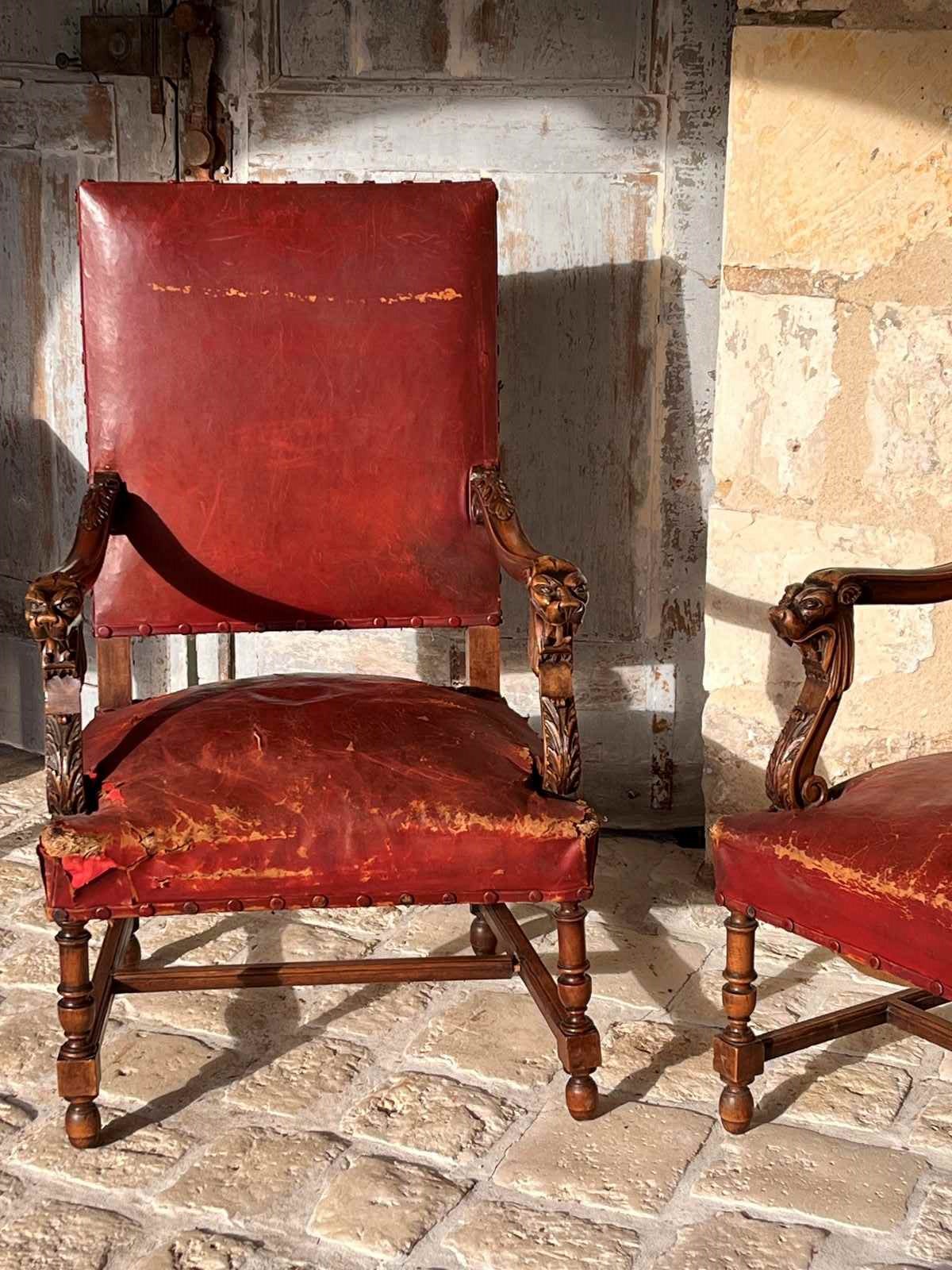 Pair of 19th century Louis XlV style fauteuils in red original burgundy red leather with covered studs. Sturdy and strong chairs. Carved lion heads and agapanthus adorn the arms. The leather is worn on one corner of one of the chairs exposing the original horse hair upholstery