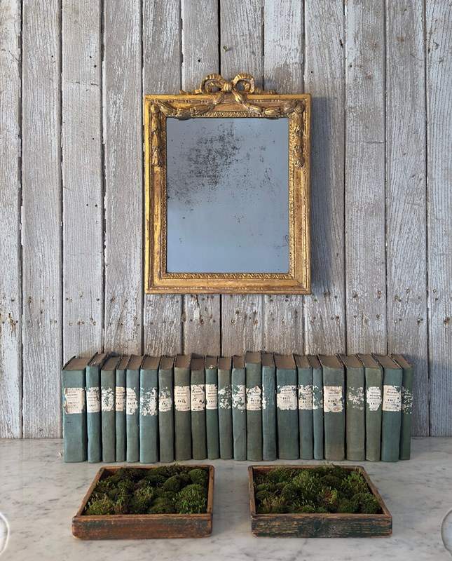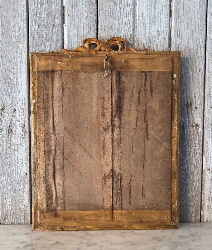The mirror retains its original hand-silvered glass, now naturally aged with attractive foxing and patina. Retains original wooden panel back consistent with its circa 1780 - 1820 origin.