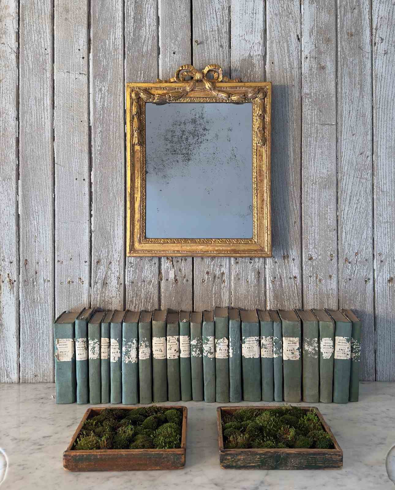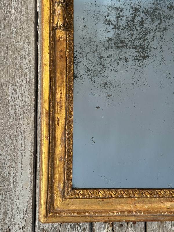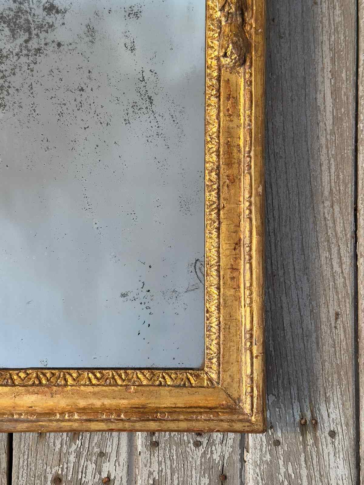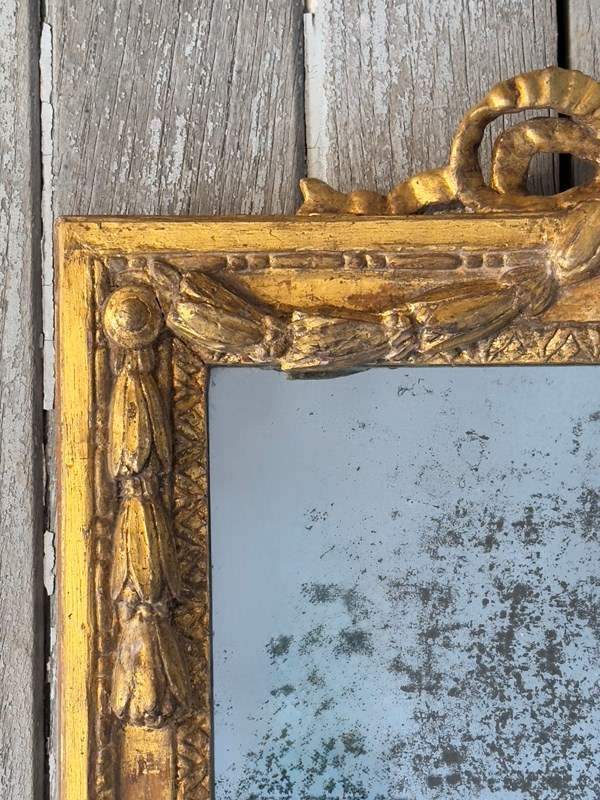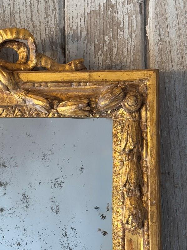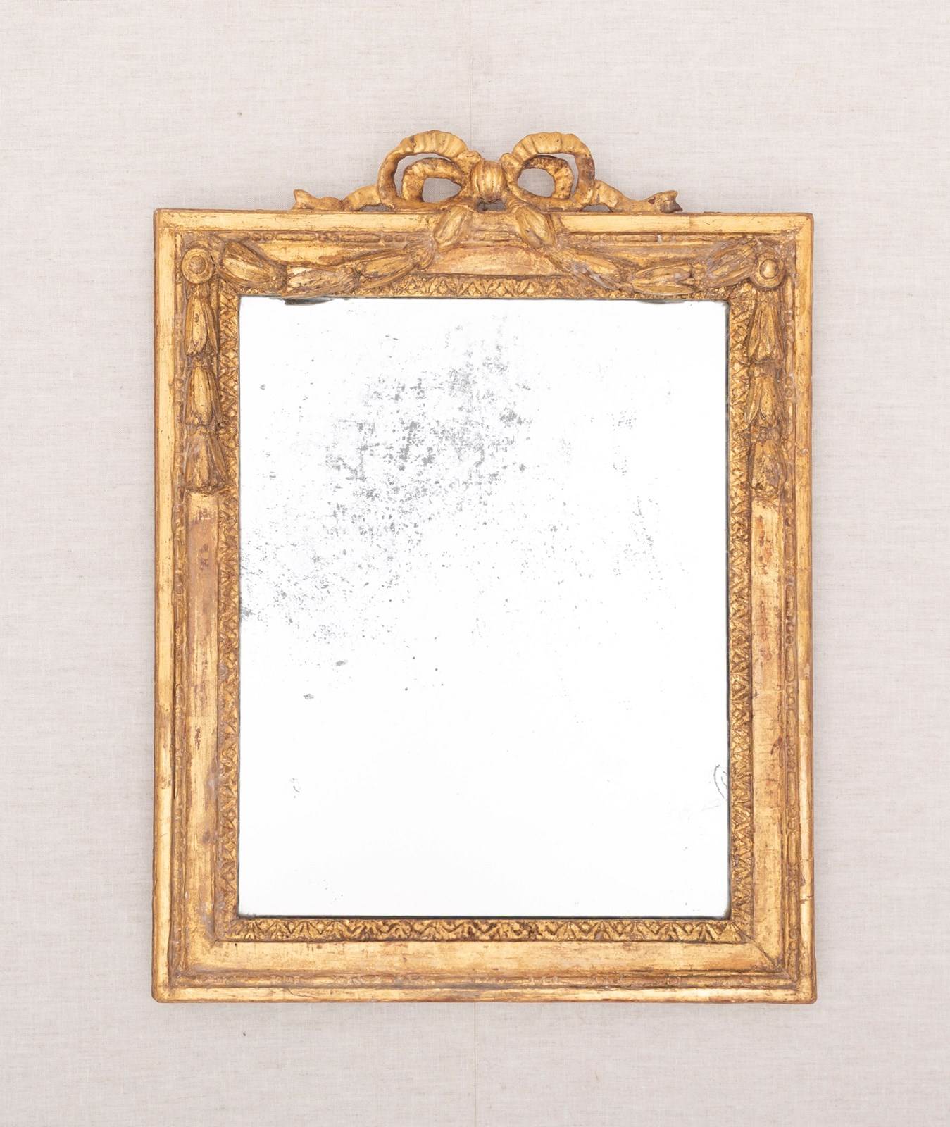 An exquisite 19th-century French Louis XVI-style mirror, featuring a beautifully carved ribbon bow crest and intricate floral garland detailing. Crafted from wood and gesso with original gilt finish, this mirror brings classic French sophistication to any interior.