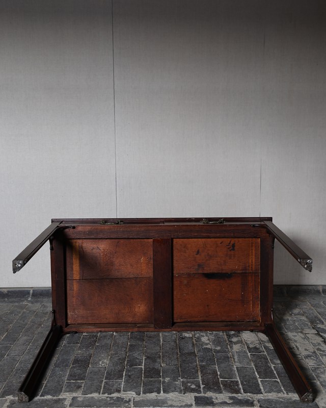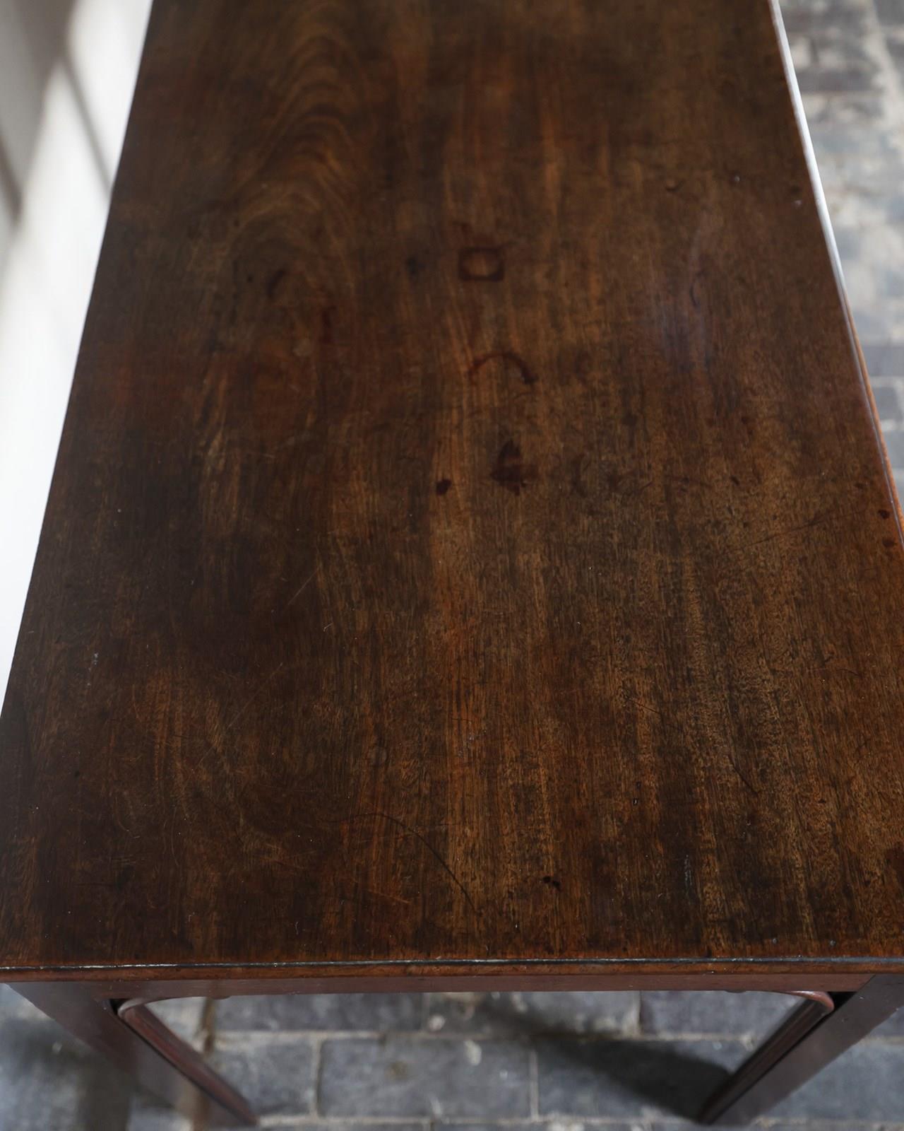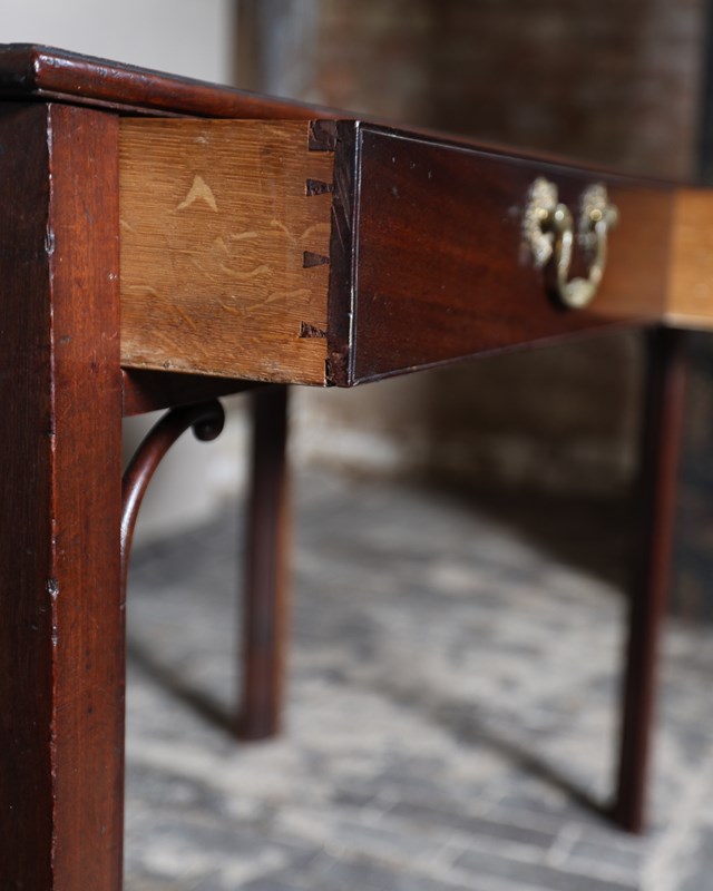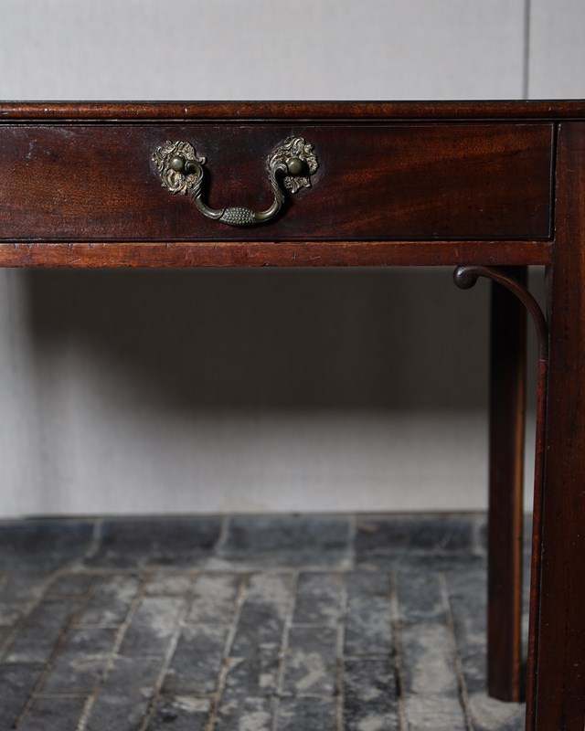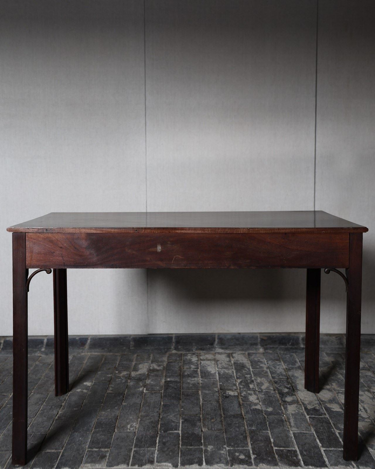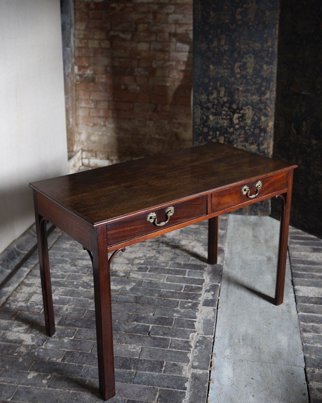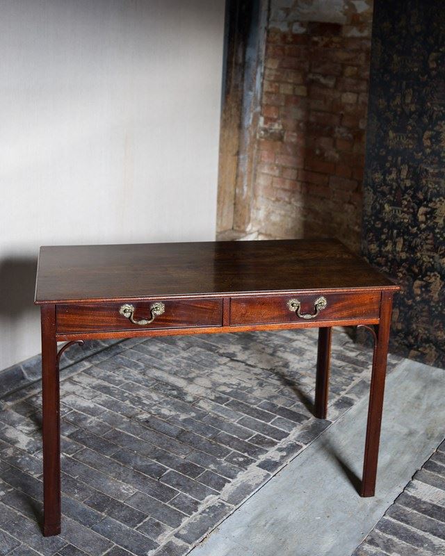 Mahogany writing table with two oak lined drawers and original gilt brass handles. Patinated original surface. Circa 1780.