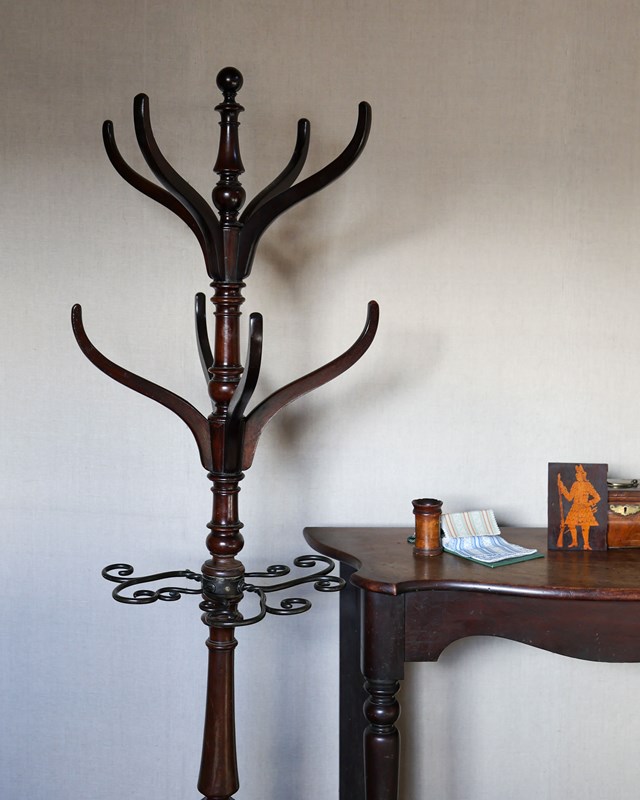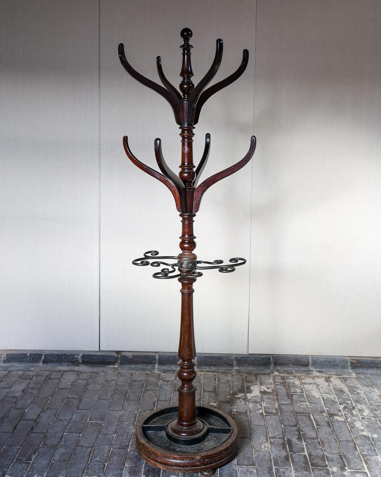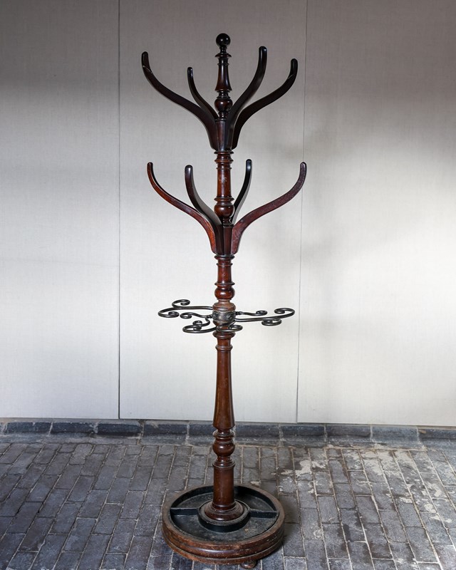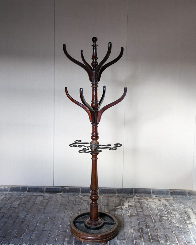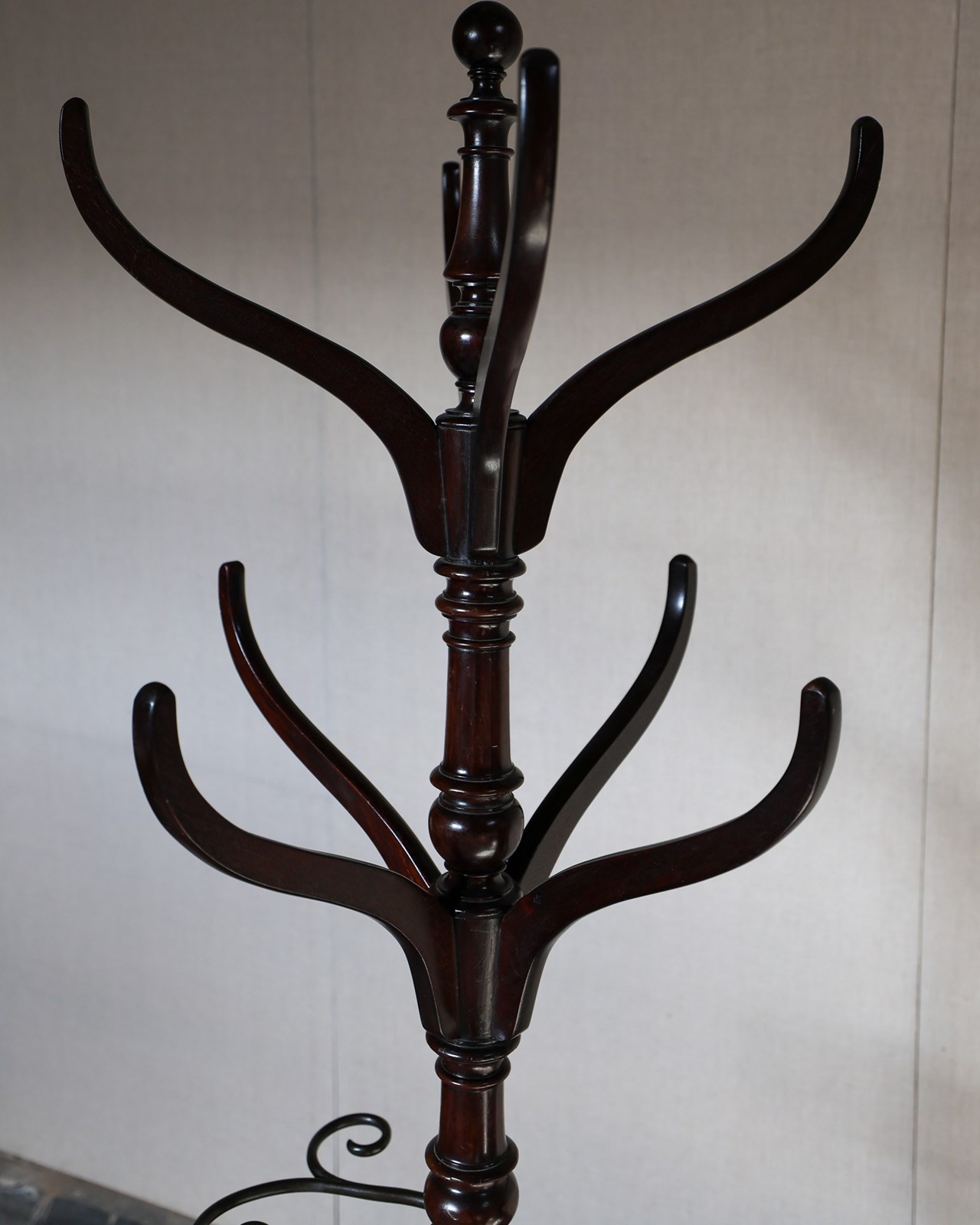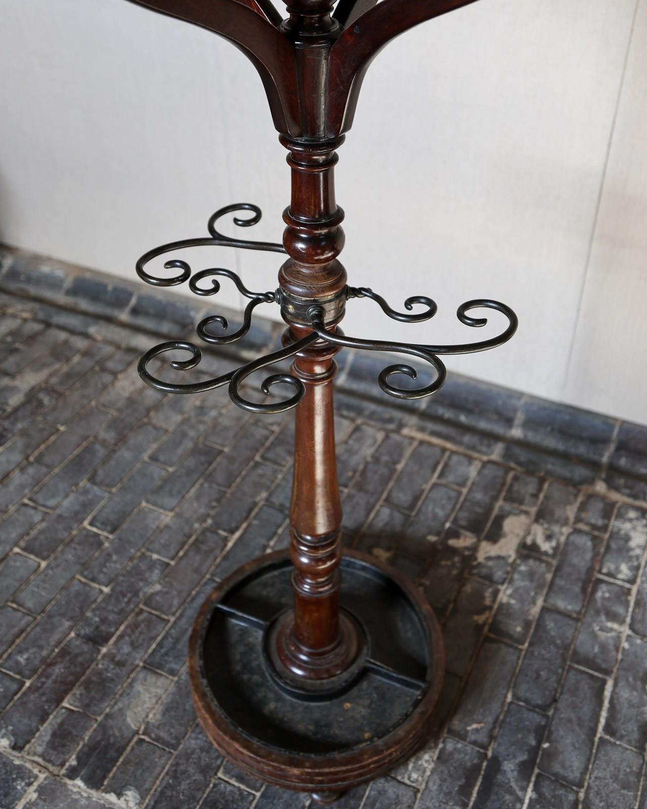Mahogany coat and stick circular stand. Brass stick and umbrella holders have two loses to one side but otherwise stand is in good order.