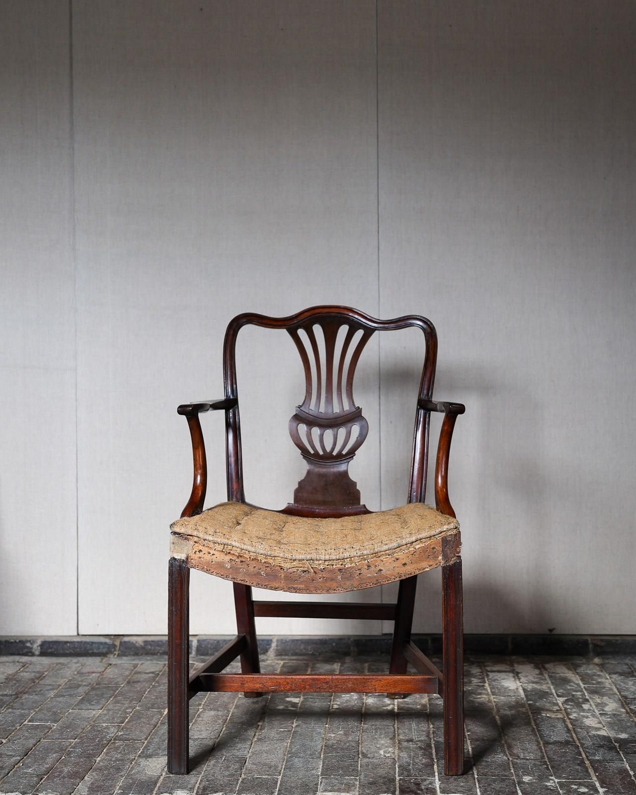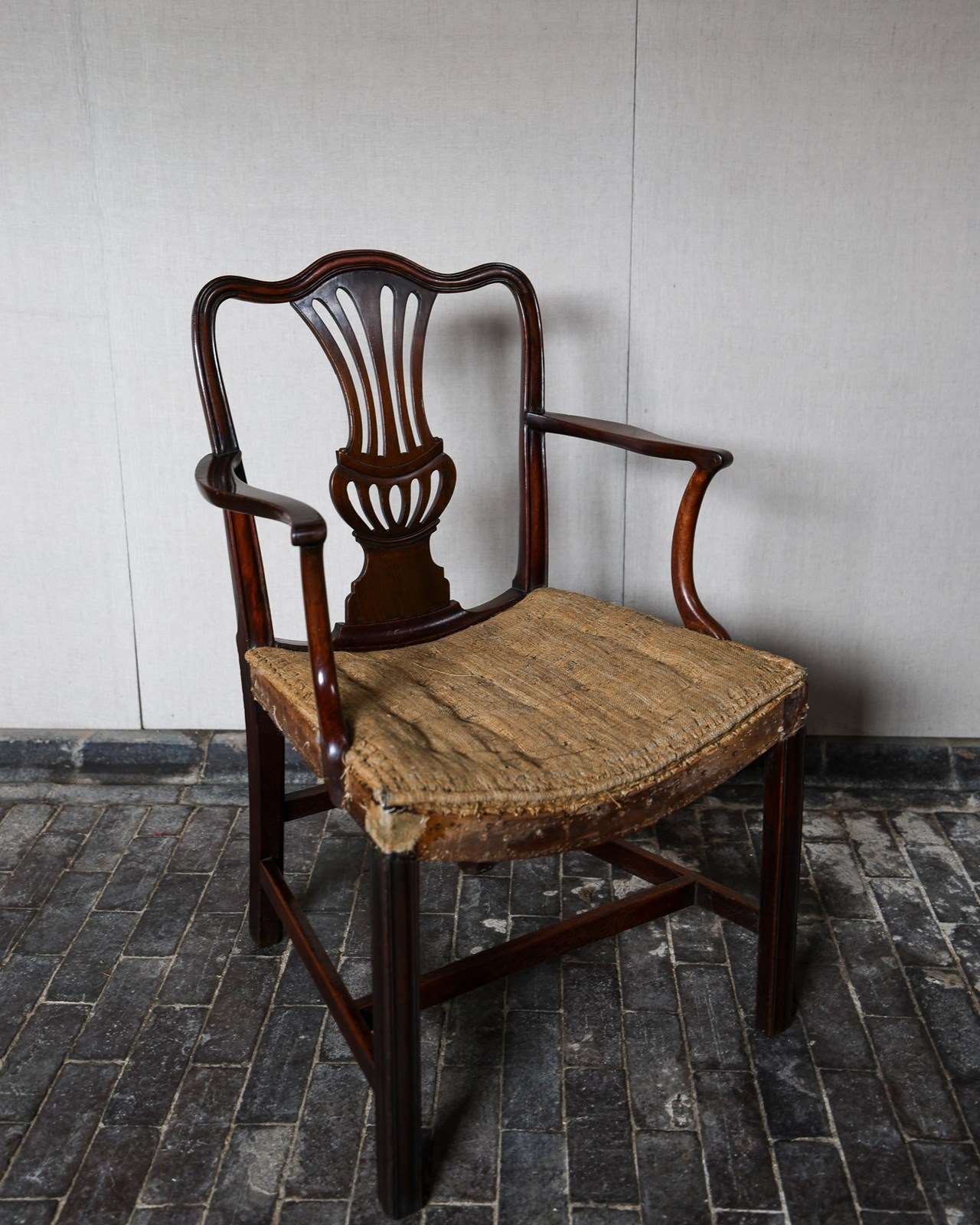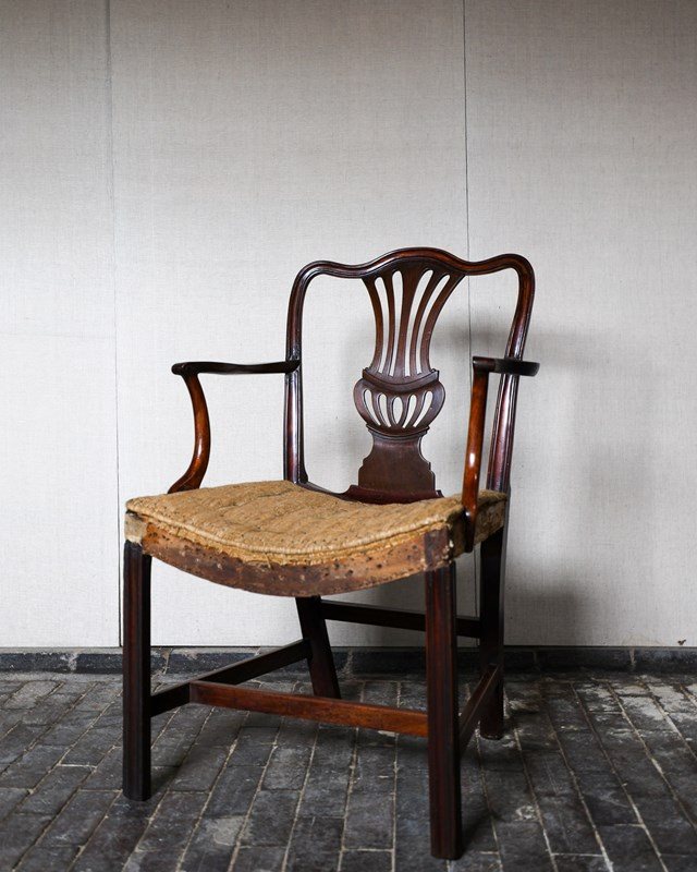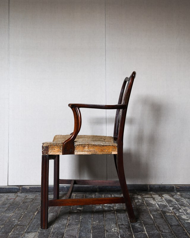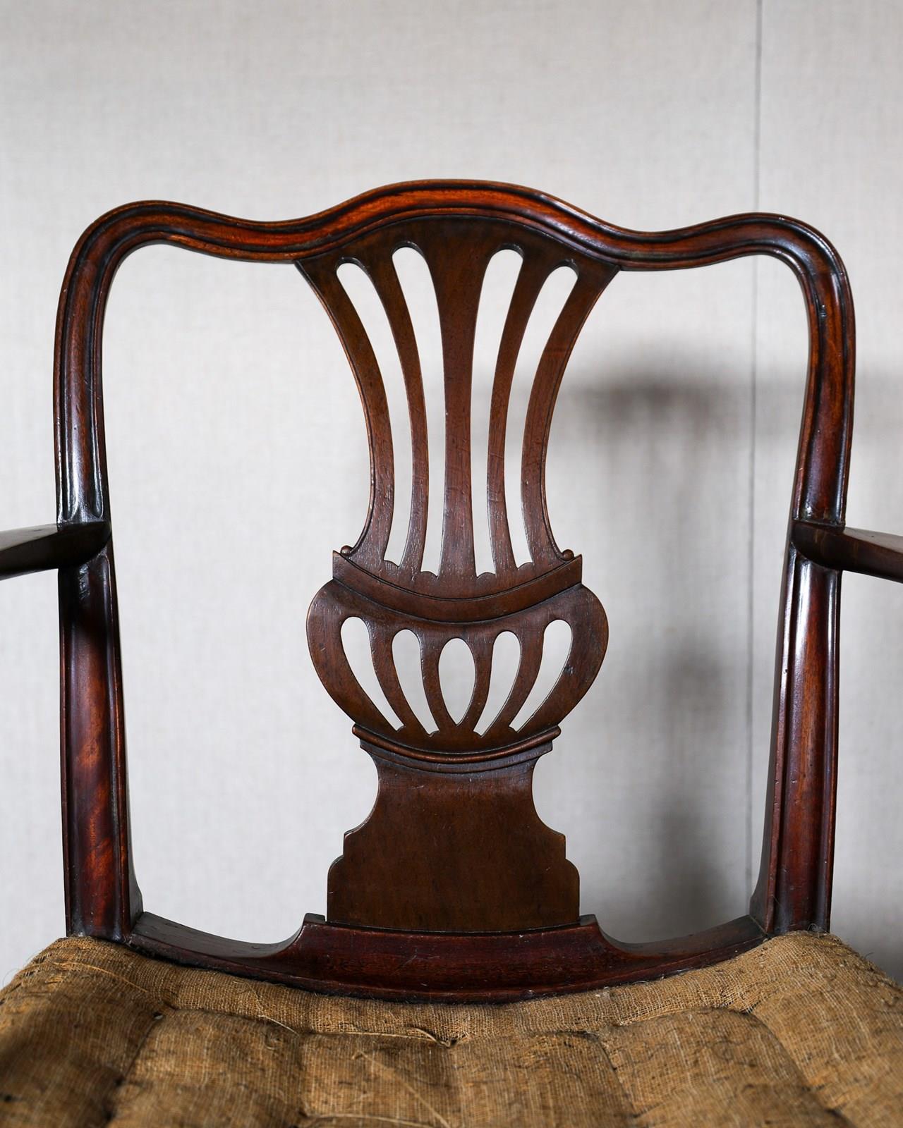 George III mahogany armchair of impressive grand scale, pierced back plate, elegant scrolled arms raised above scratch moulded supports and joined by stretchers. Circa 1790.