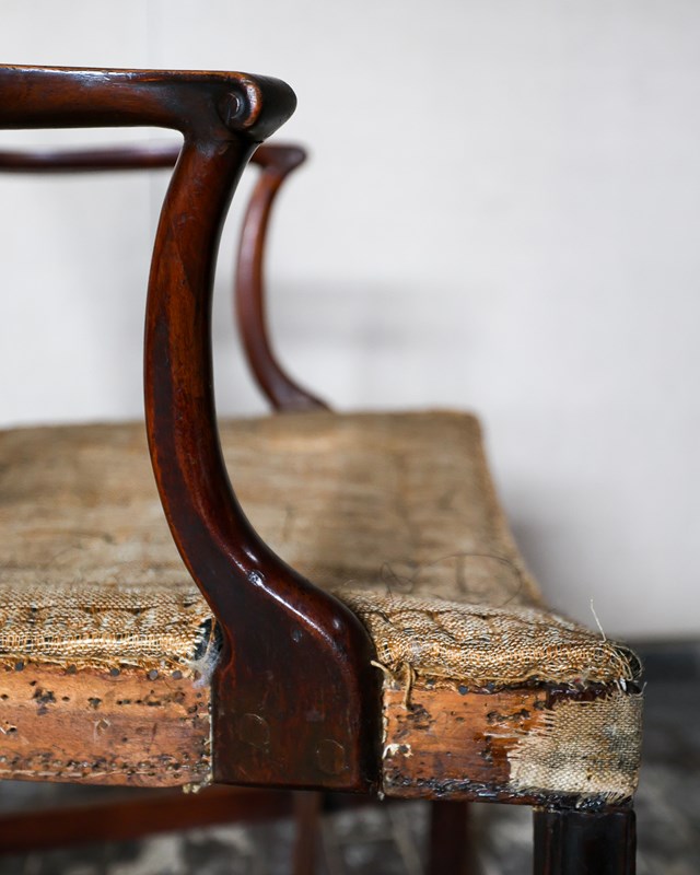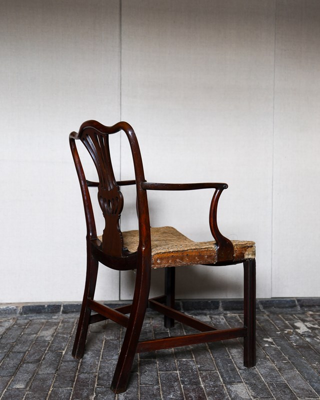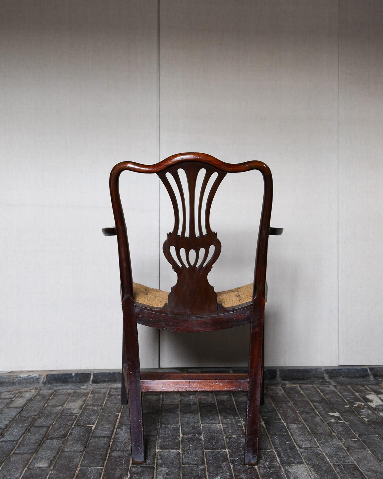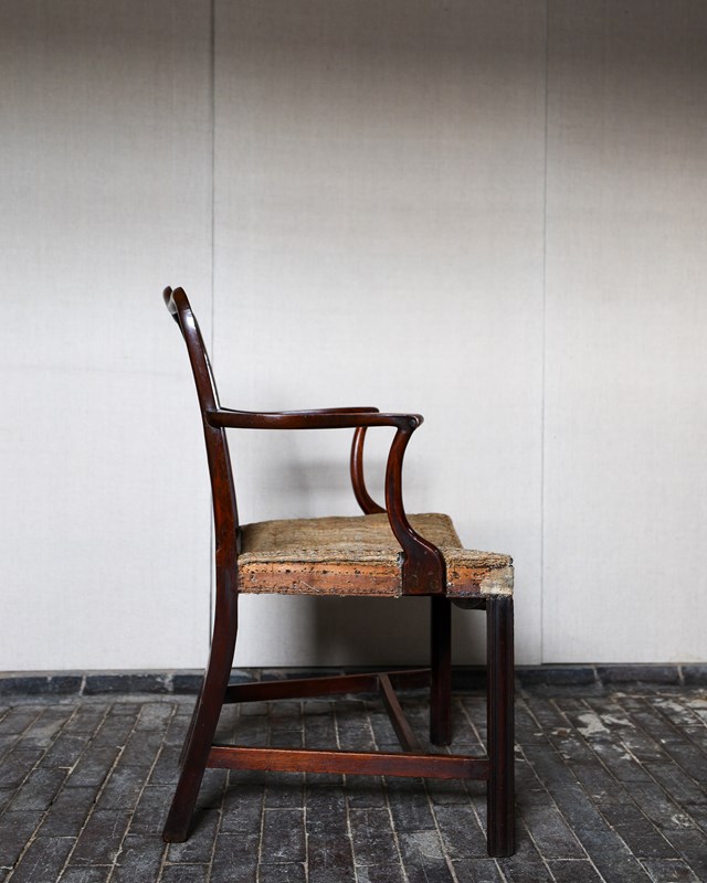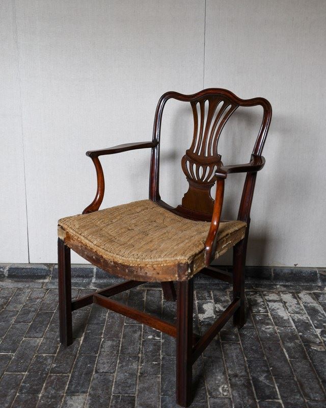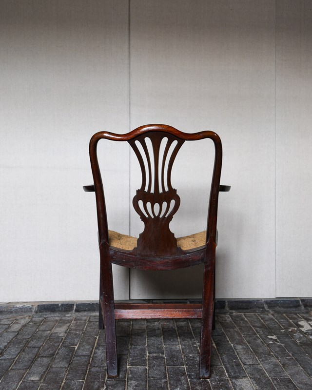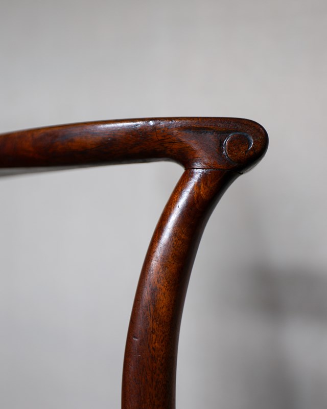 George III mahogany armchair of impressive grand scale, pierced back plate, elegant scrolled arms raised above scratch moulded supports and joined by stretchers. Circa 1790.