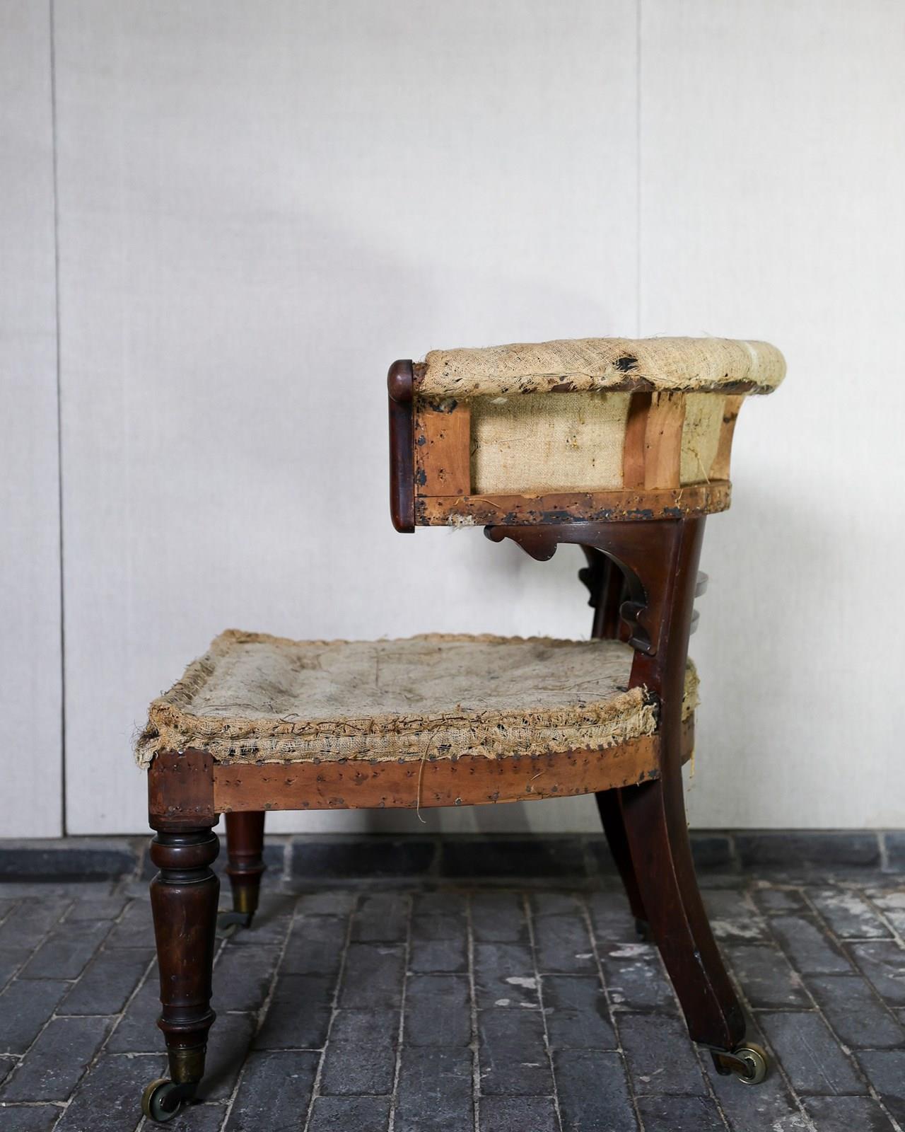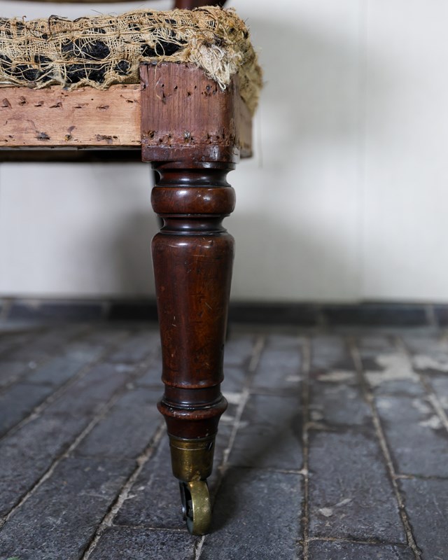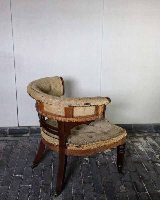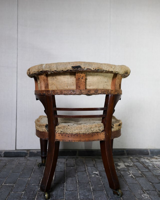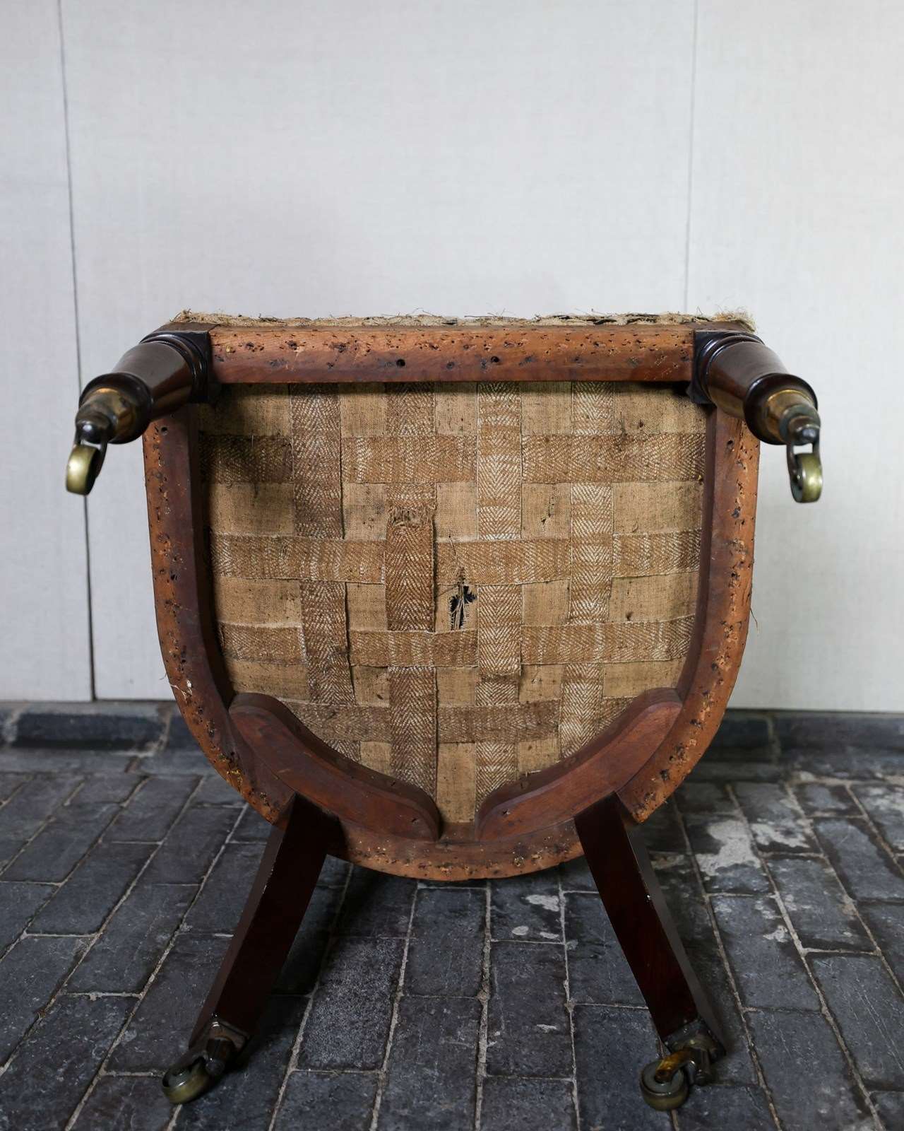 Early 19th Century horse-shoe back mahogany desk chair. Attributed to Holland & Son's with journey mans stamp H.M to underside. Requires 3 meters of fabric.