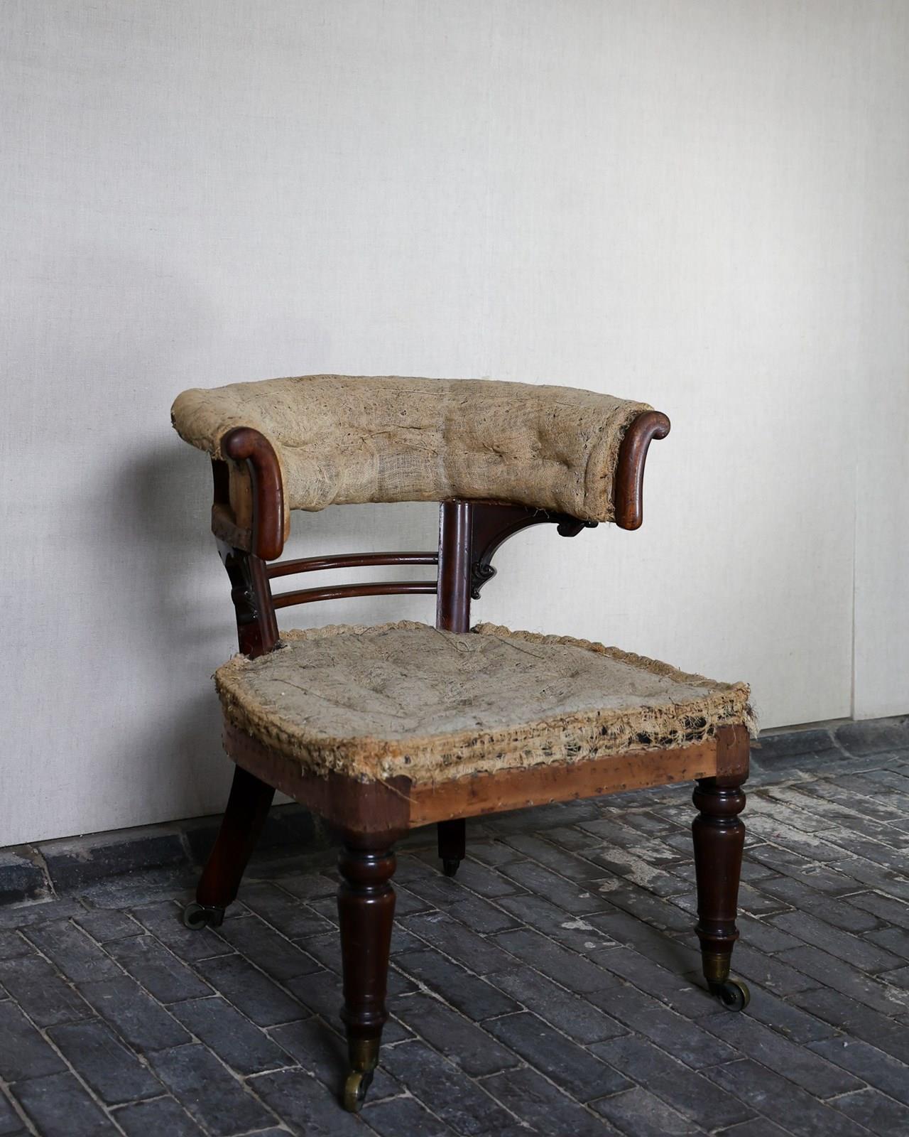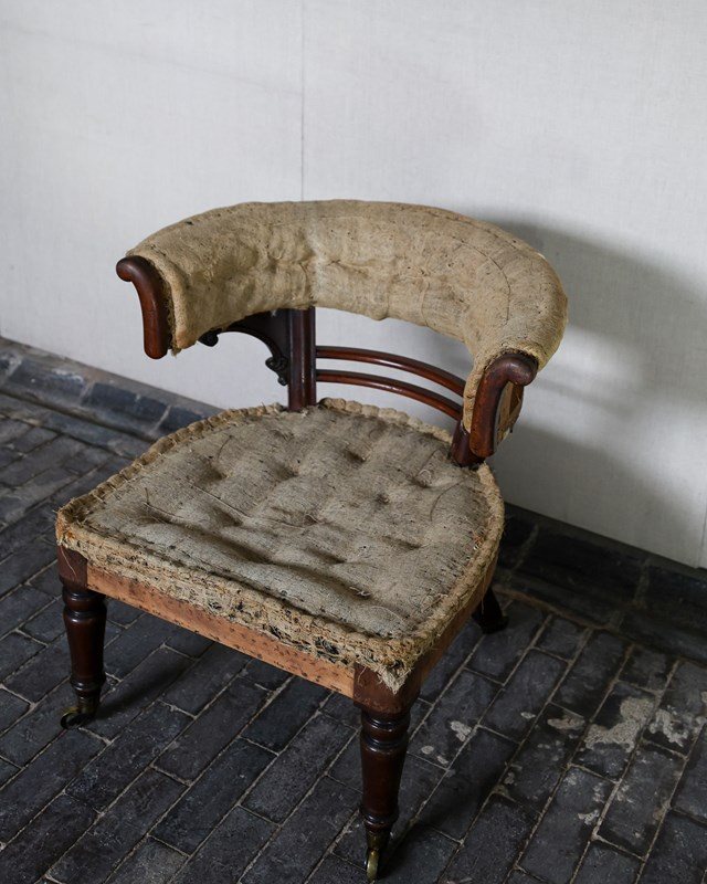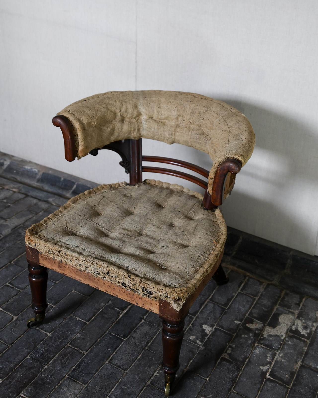 Early 19th Century horse-shoe back mahogany desk chair. Attributed to Holland & Son's with journey mans stamp H.M to underside. Requires 3 meters of fabric.