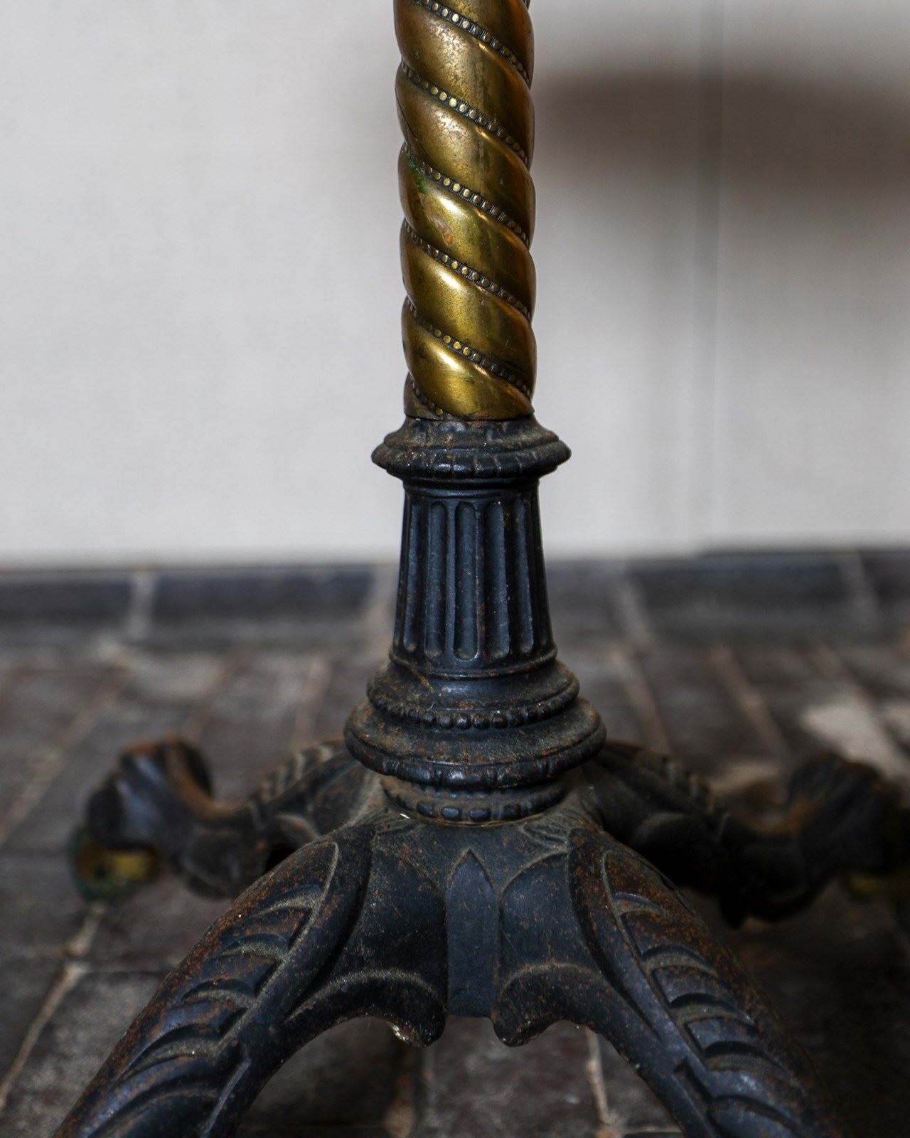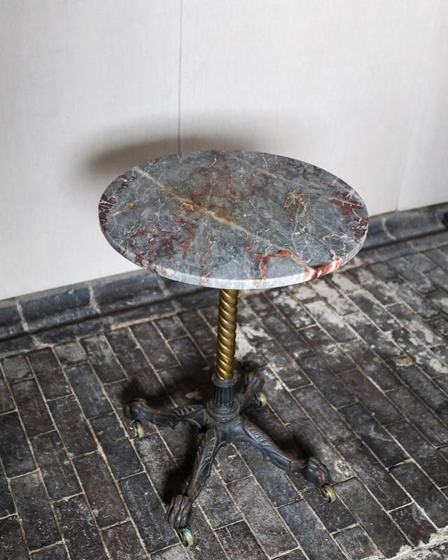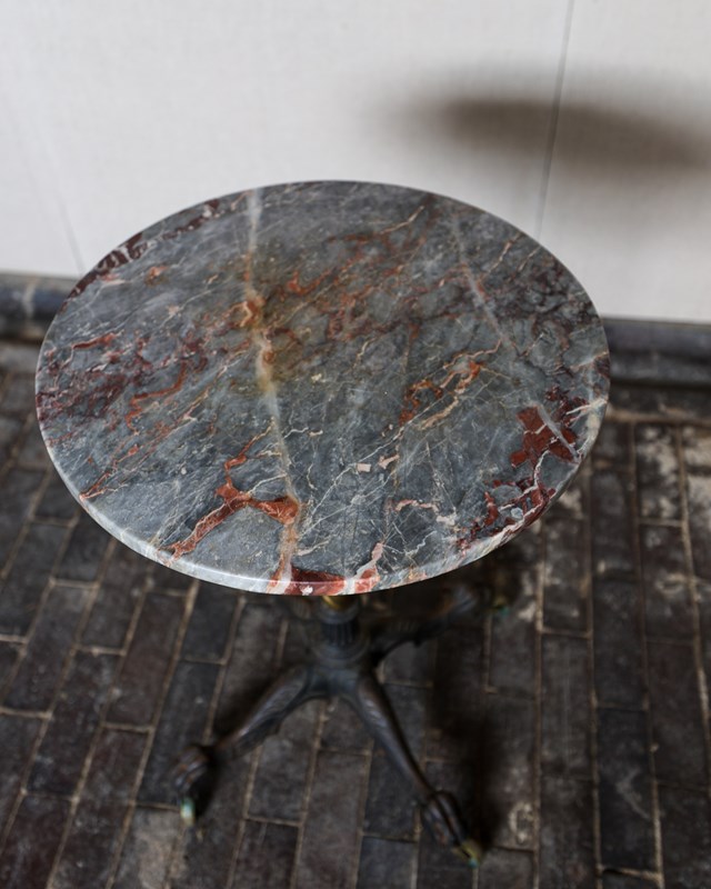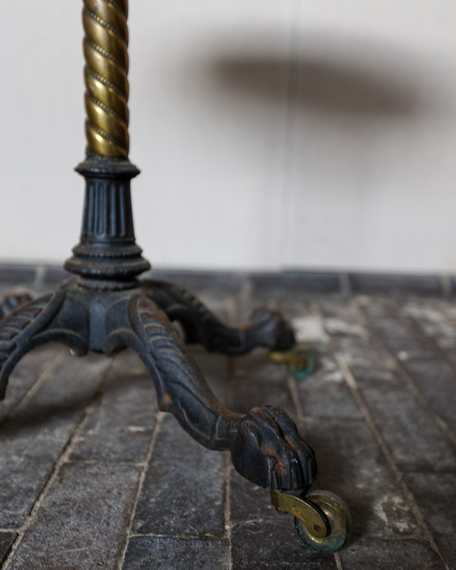 Marble topped cast-iron quadruped base with paw feet and brass castors. Dimensions: Top diameter 21” Height 28”
