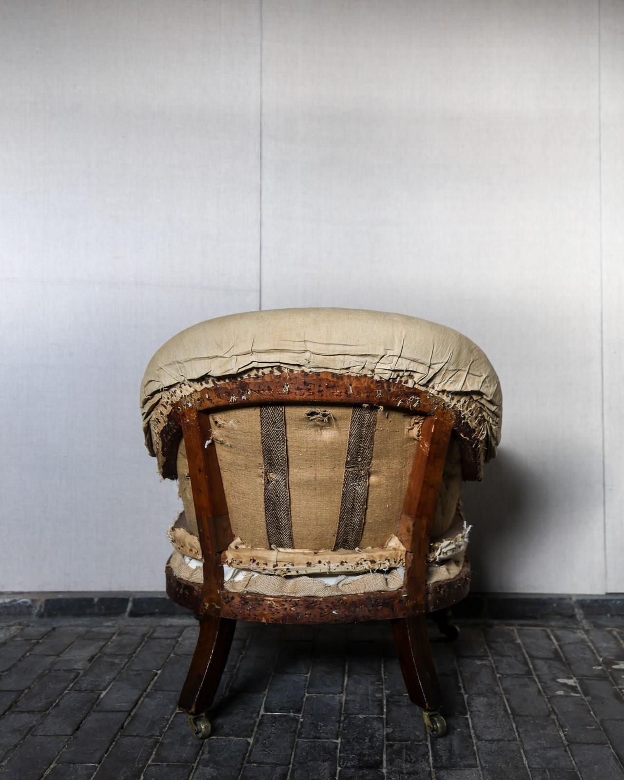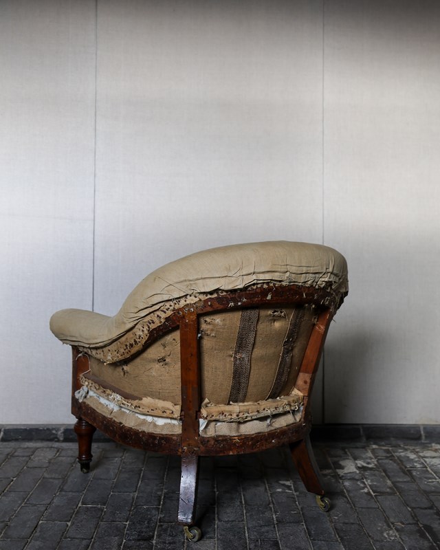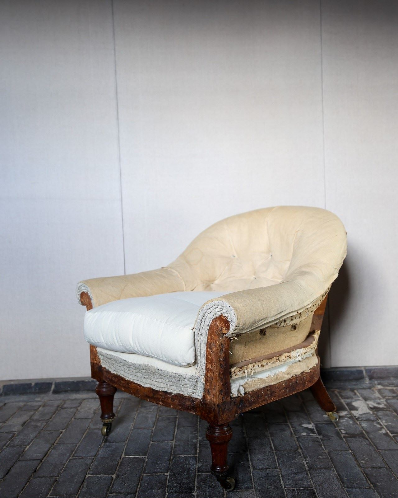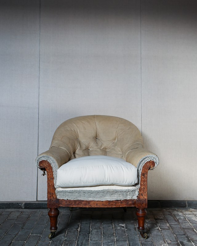 Tub armchair on turned walnut legs by Holland & Sons. Circa 1870. Retaining its original linen covered horsehair stuffed upholstery to back and arms. Sprung seat with down seat pad. Including finishing £2400 plus 5 meters.