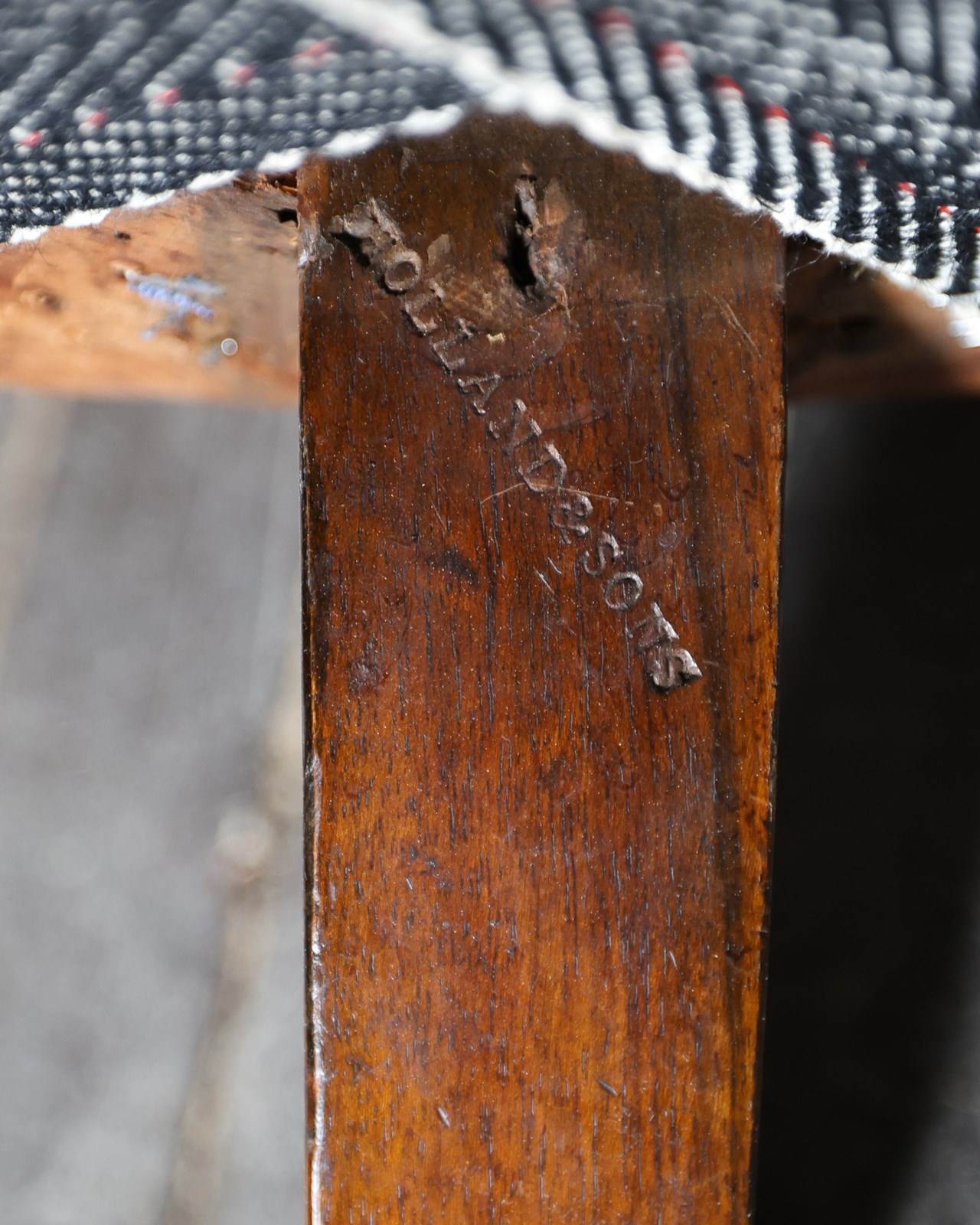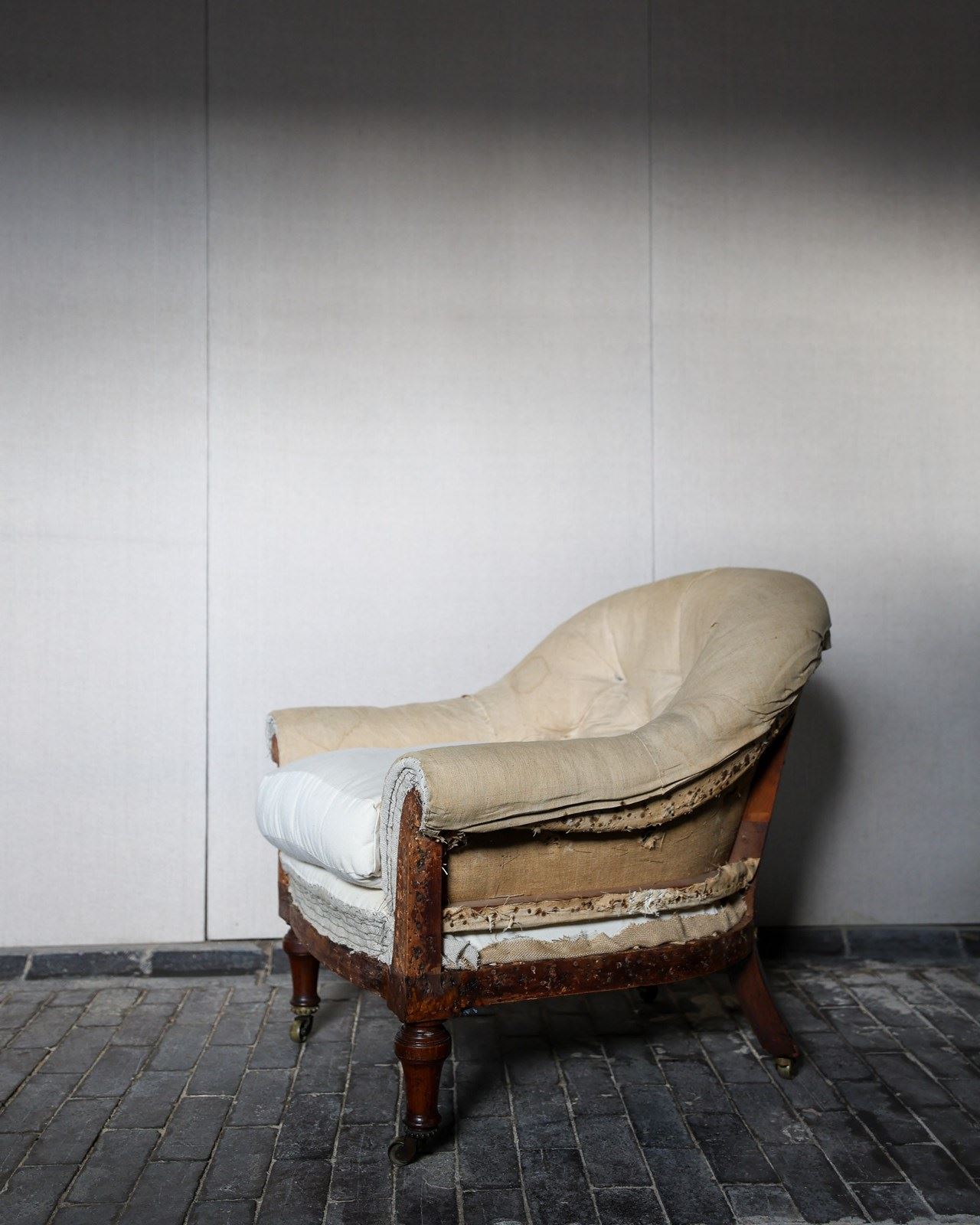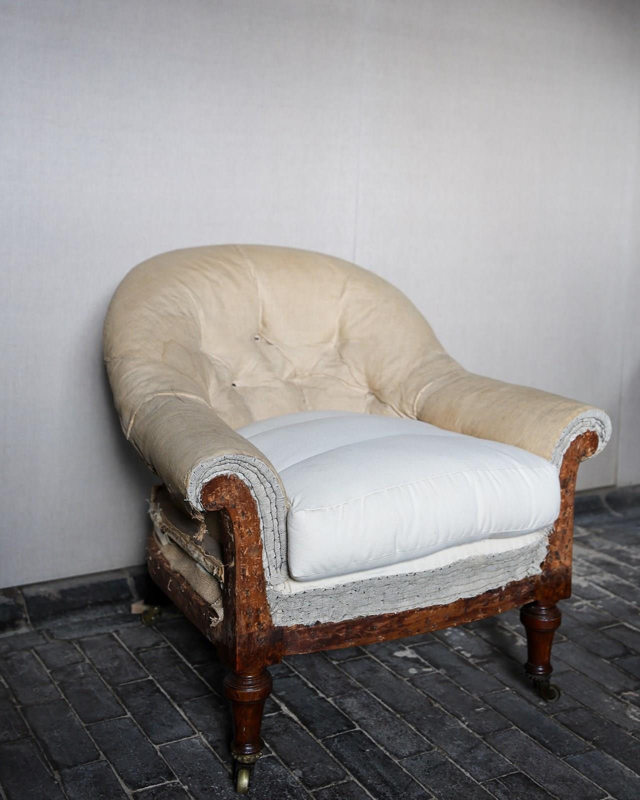 Tub armchair on turned walnut legs by Holland & Sons. Circa 1870. Retaining its original linen covered horsehair stuffed upholstery to back and arms. Sprung seat with down seat pad. Including finishing £2400 plus 5 meters.