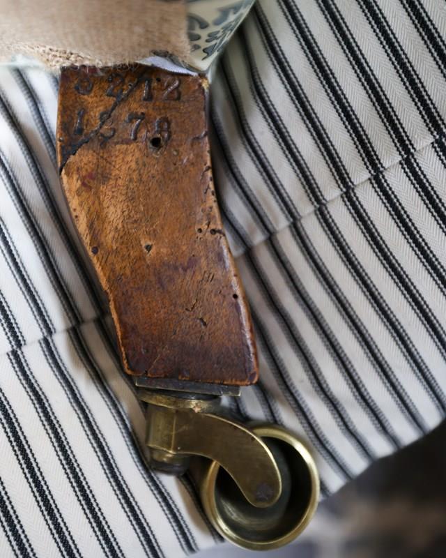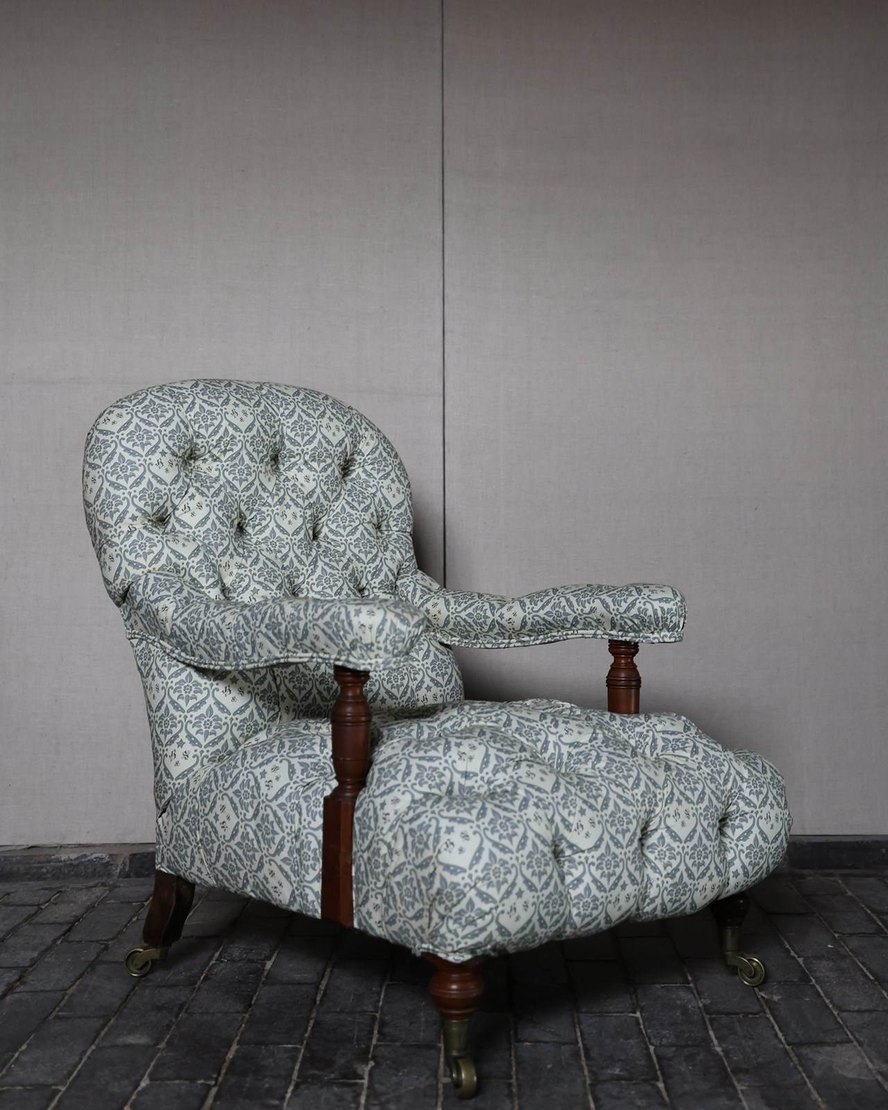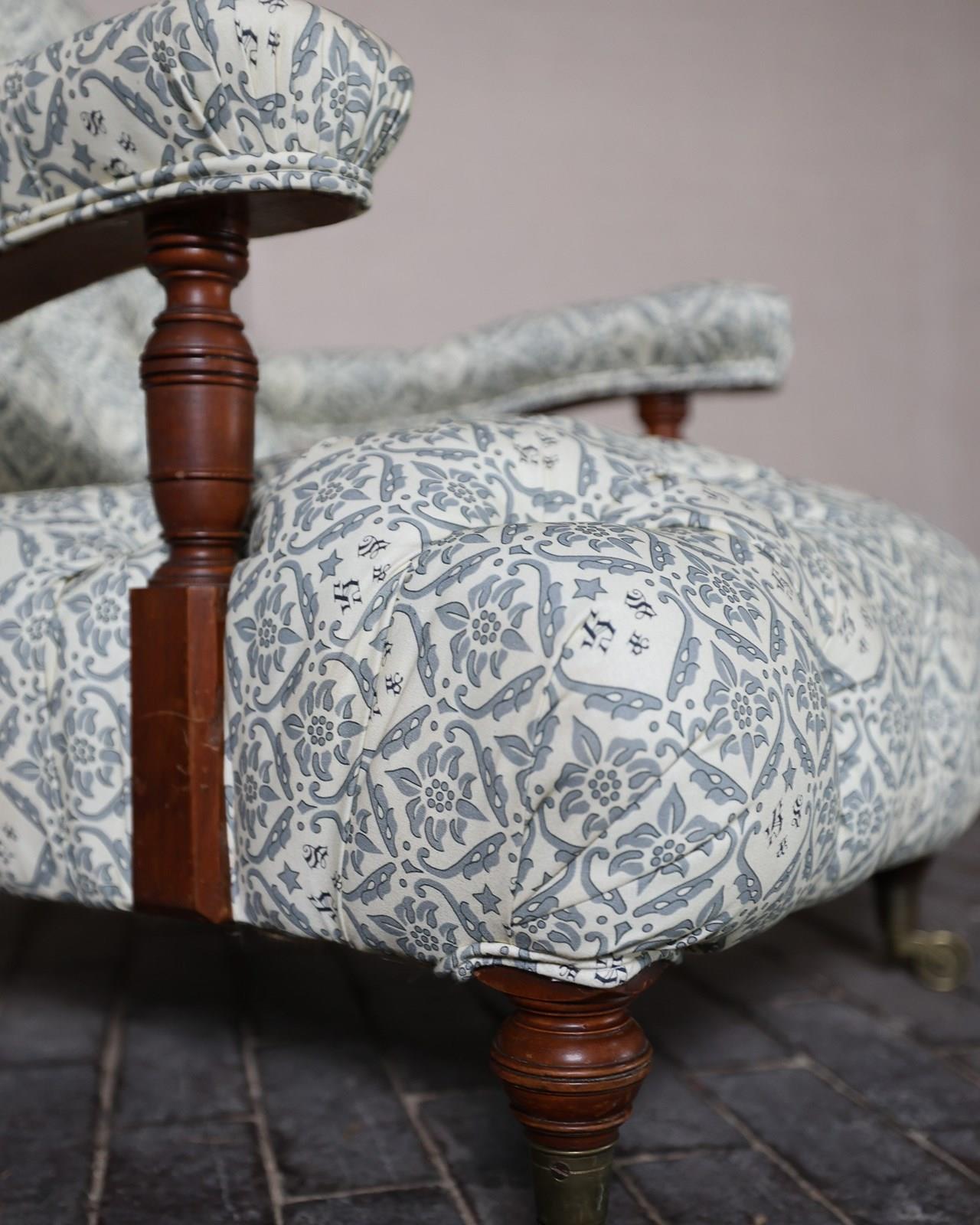 Howard & Sons walnut open armchair on turned supports, brass caps and castors. Copes castors and double serial number to back leg. Newly covered in to H&S ticking. £2900.