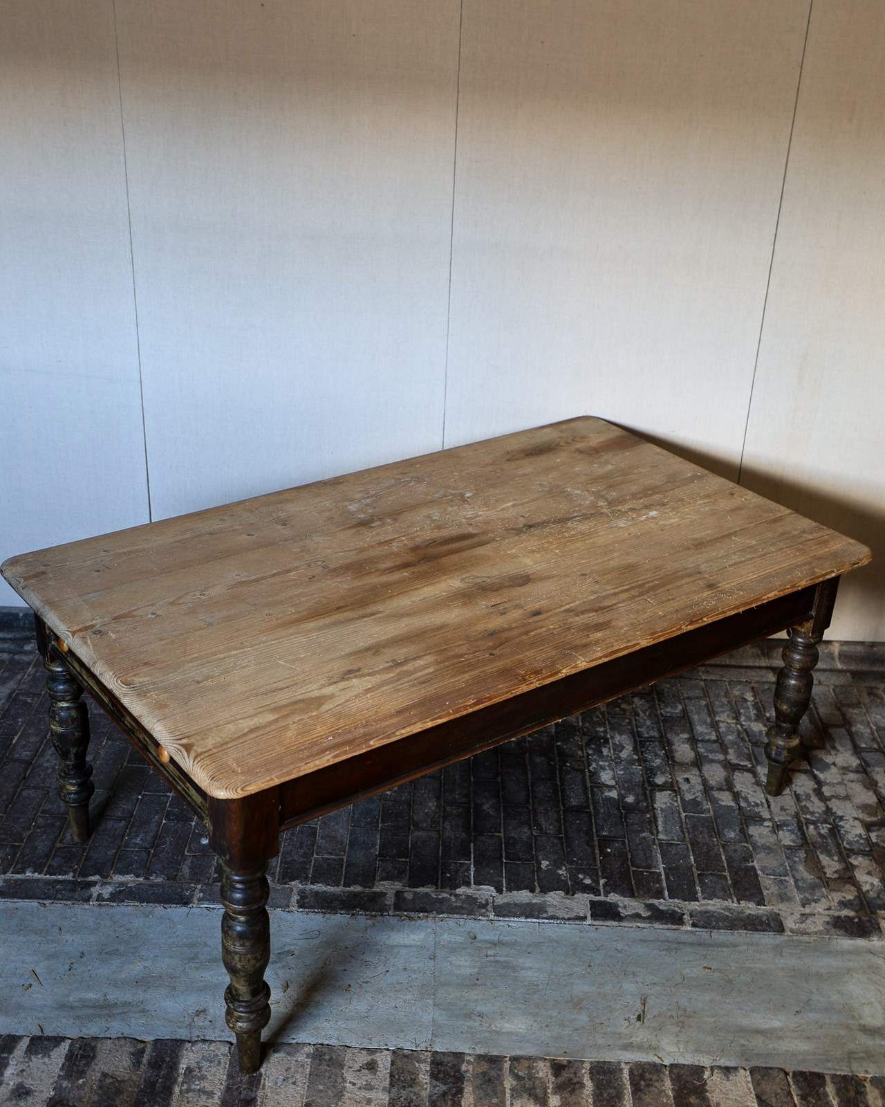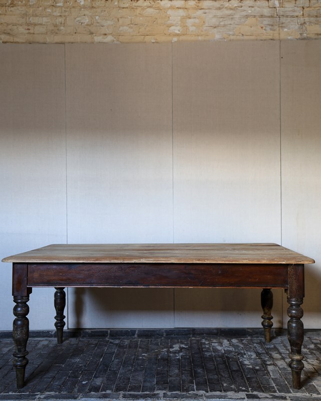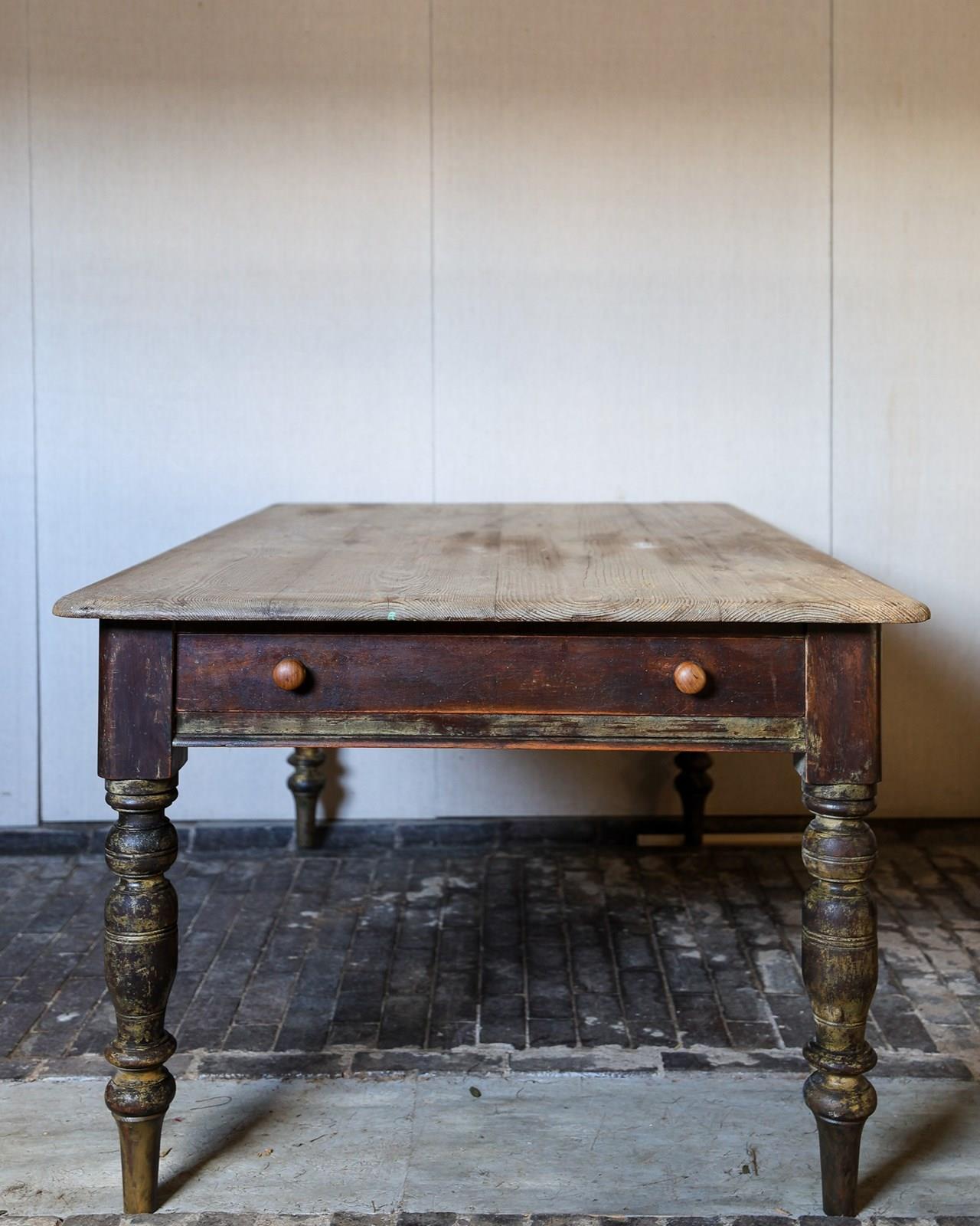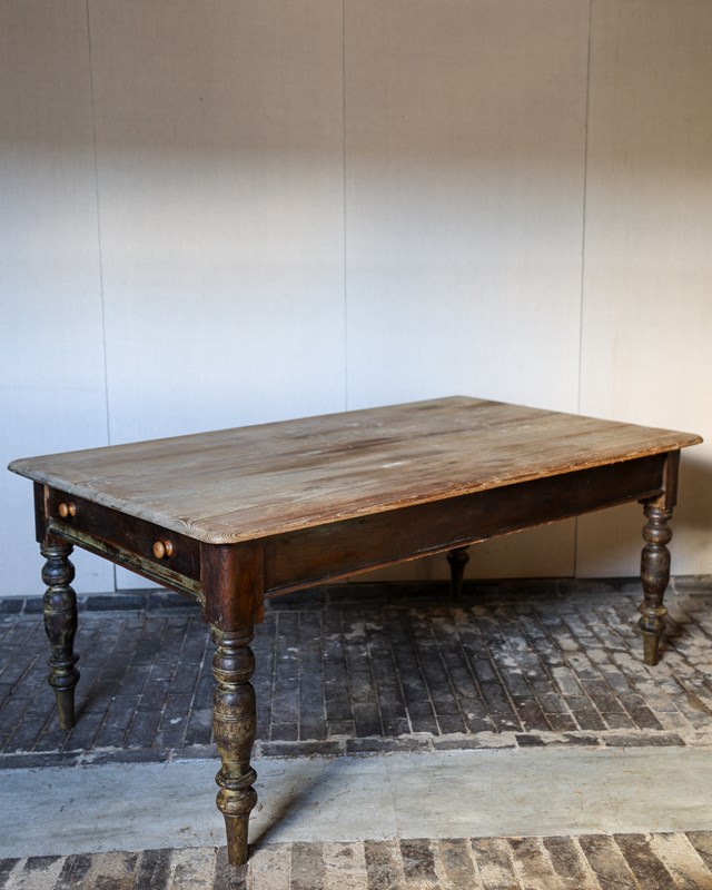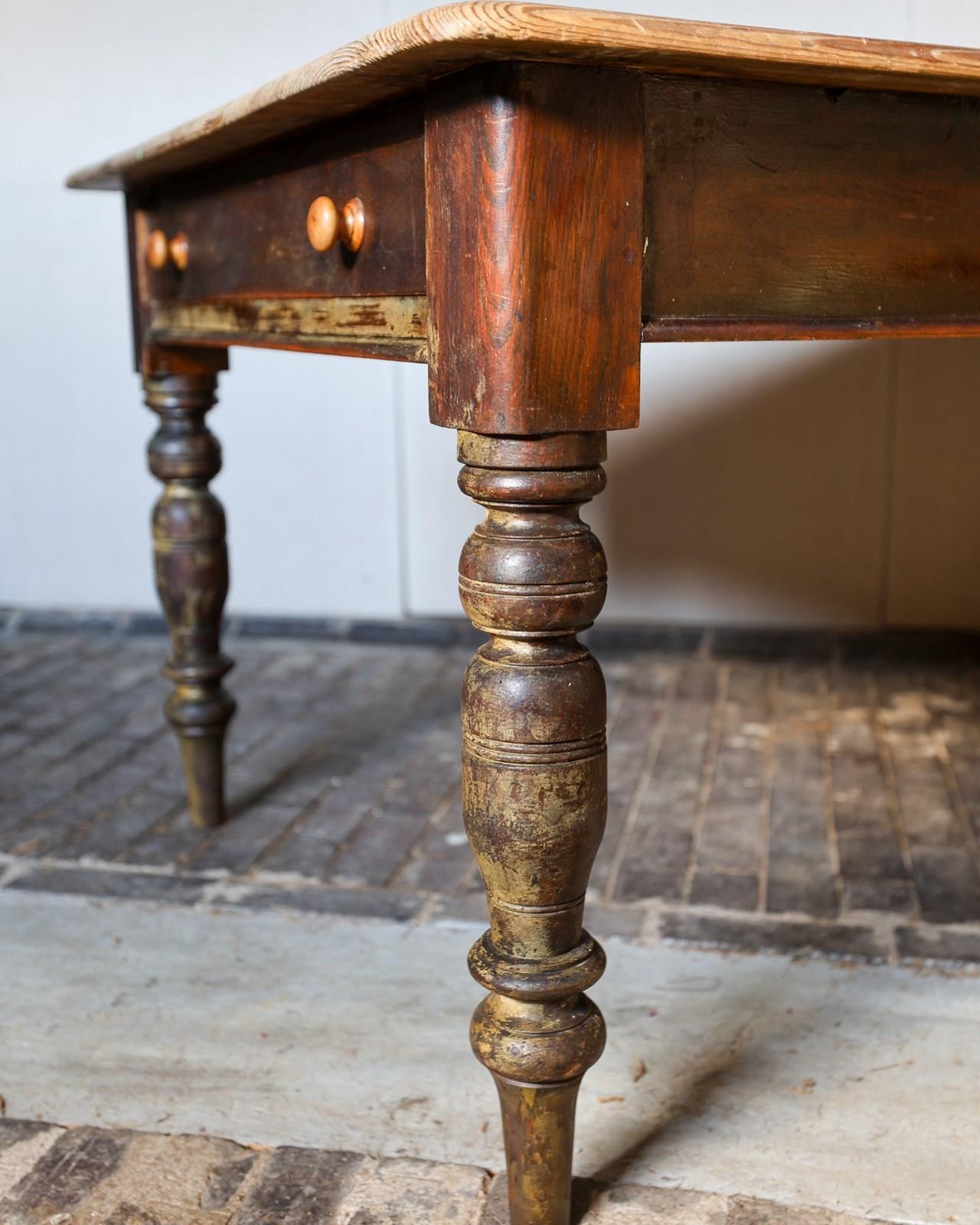 Six feet wide scrub-down pine kitchen table, original brown painted base and on turned legs. Single drawer with turned knobs. Circa 1860. £2200