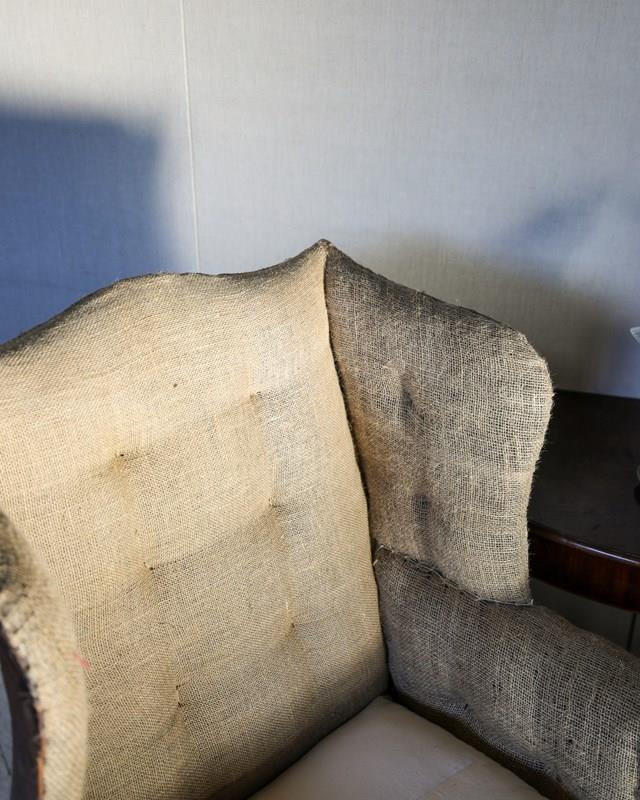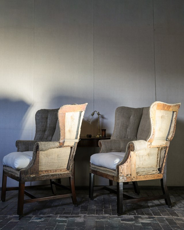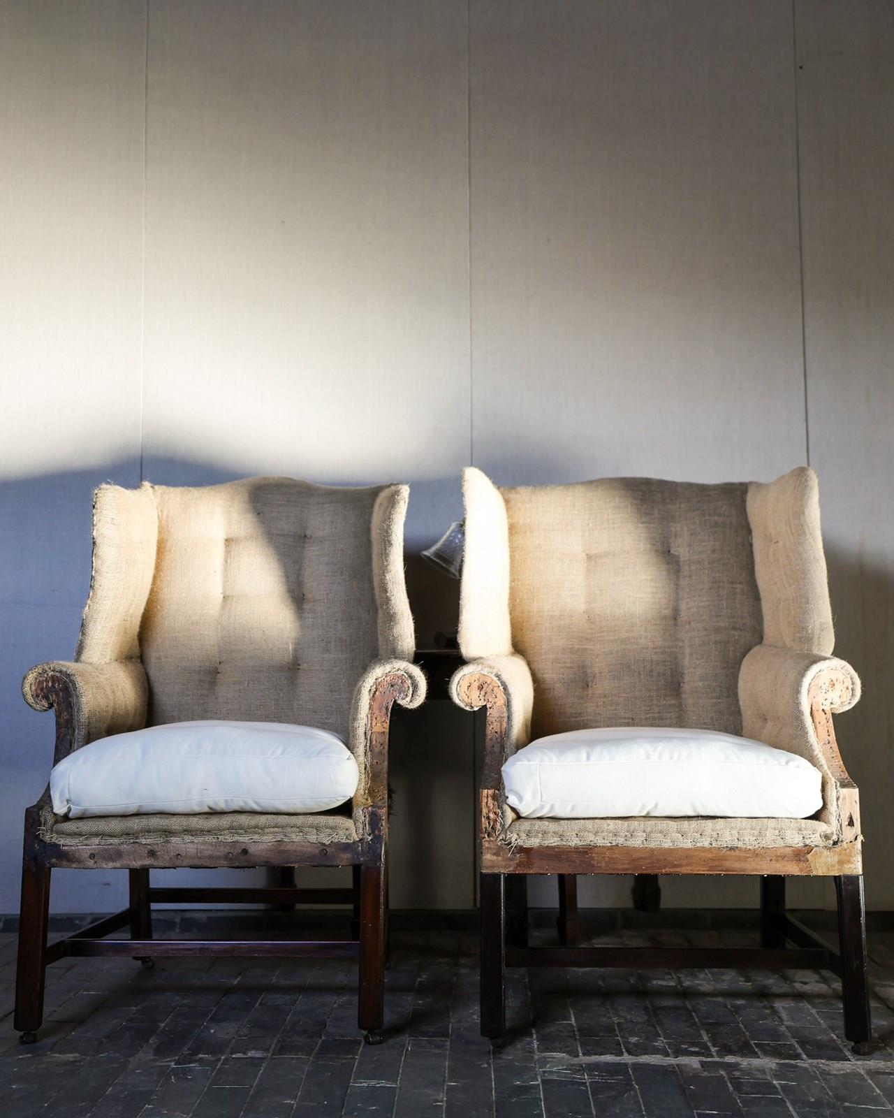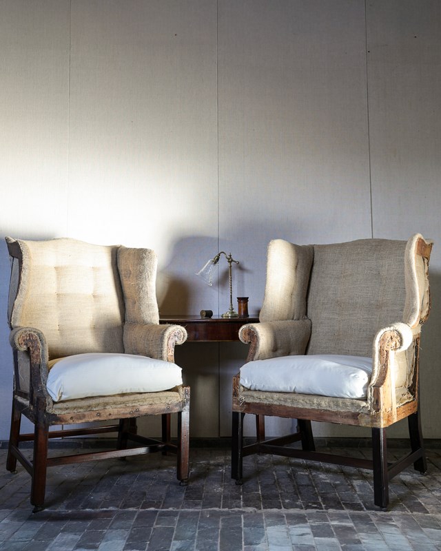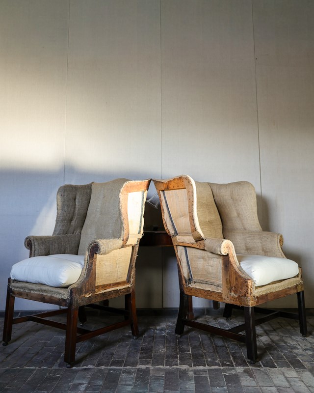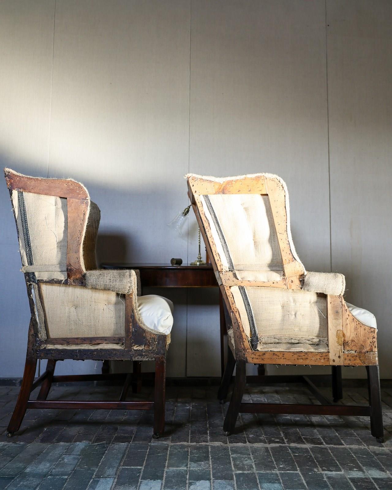 Pair of well matched mid 18th century wingback armchairs on square moulded mahogany legs joined by cross stretchers supported on brass and leather barrel castors. Circa 1760. Upholstered up to hessian with horsehair stuffing, small sprung seats with down seat pads. Including finishing £13,000 plus 12 meters of material.