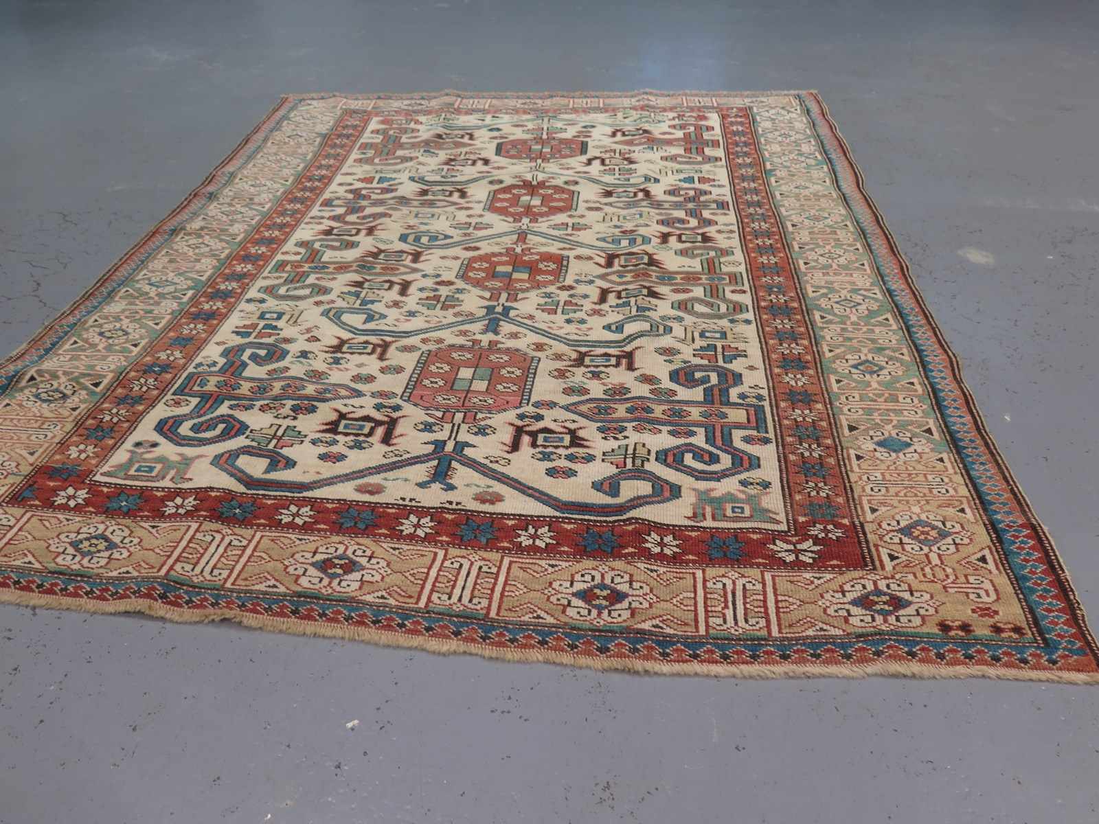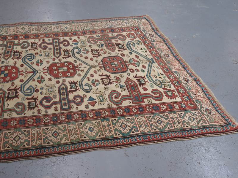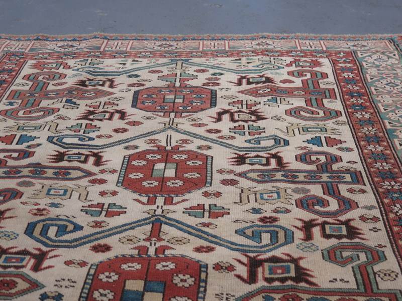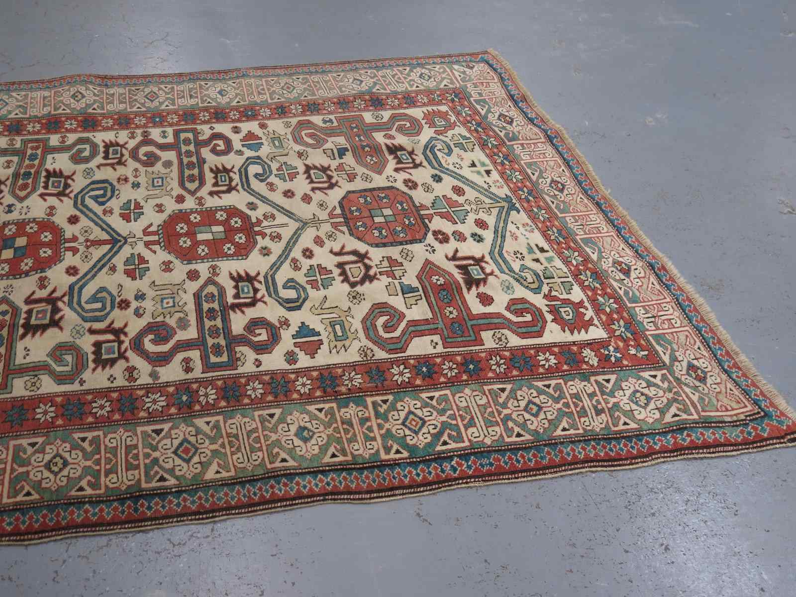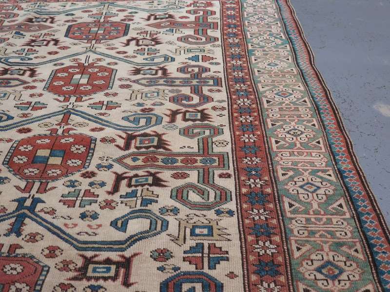This high-grade example, which we believe dates to the first half of the 20th Century, showcases wonderful craftsmanship and high-grade wool, lending a crisp clarity to its bold, graphic design. It employs a series of hooked ram's horn motifs across a rare ivory field, in vegetable-dyed tones including cornflower blue, muted bottle green, and red ochre, framed by a wide, decorative border - a striking, open composition, especially given its smaller format.