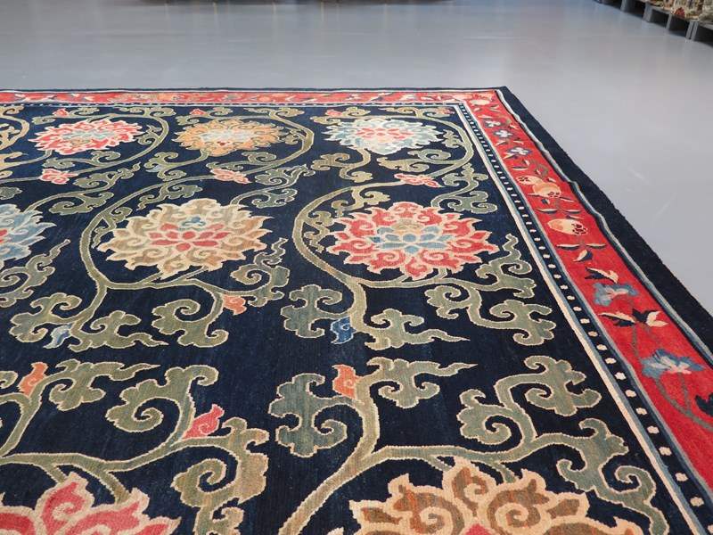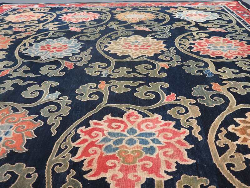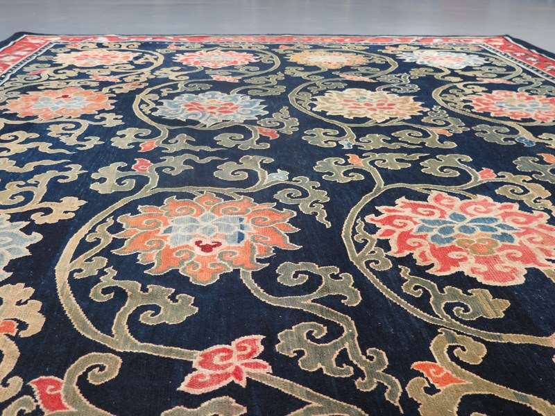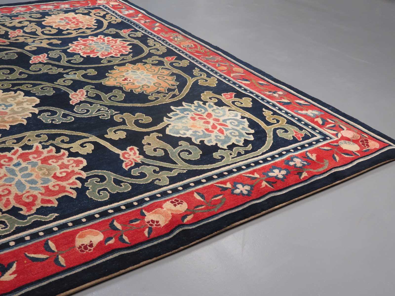 A unique and elegant Tibetan carpet in a rare room-size format – likely commissioned at the time for a member of the nobility, as most Tibetan pieces of the period were woven in a small rug format. The midnight blue field provides a great contrast to the striking design, with each drawing in the central field creatively repeated in various colour combinations, and framed by a simple red border. The charming array of hues in its palette are all vegetable-dyed, and have taken on a soft patina with age which adds great depth and character.