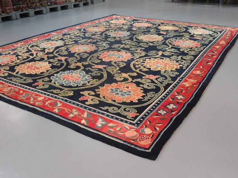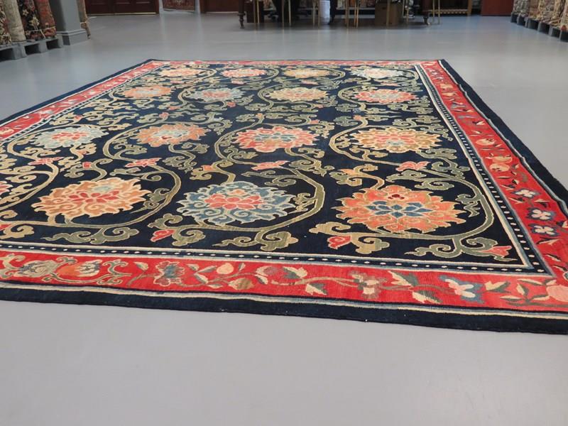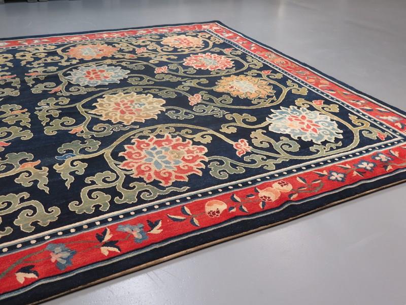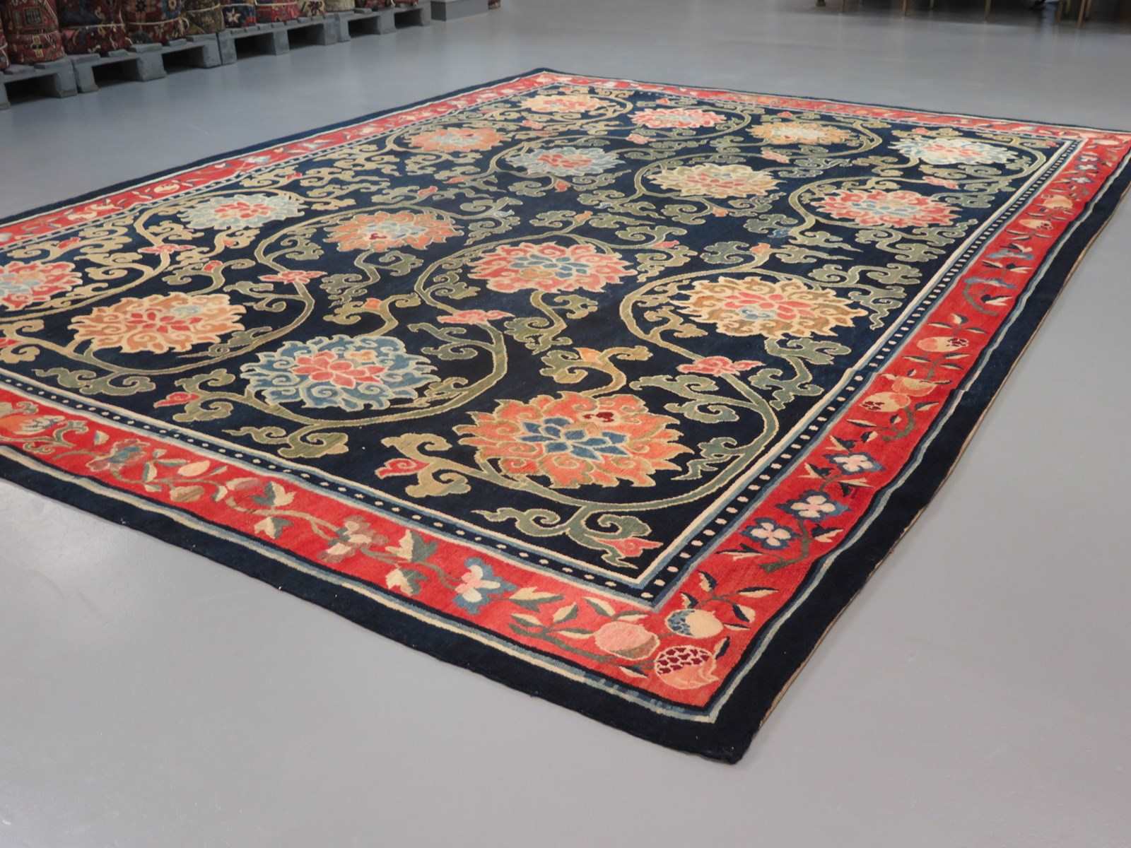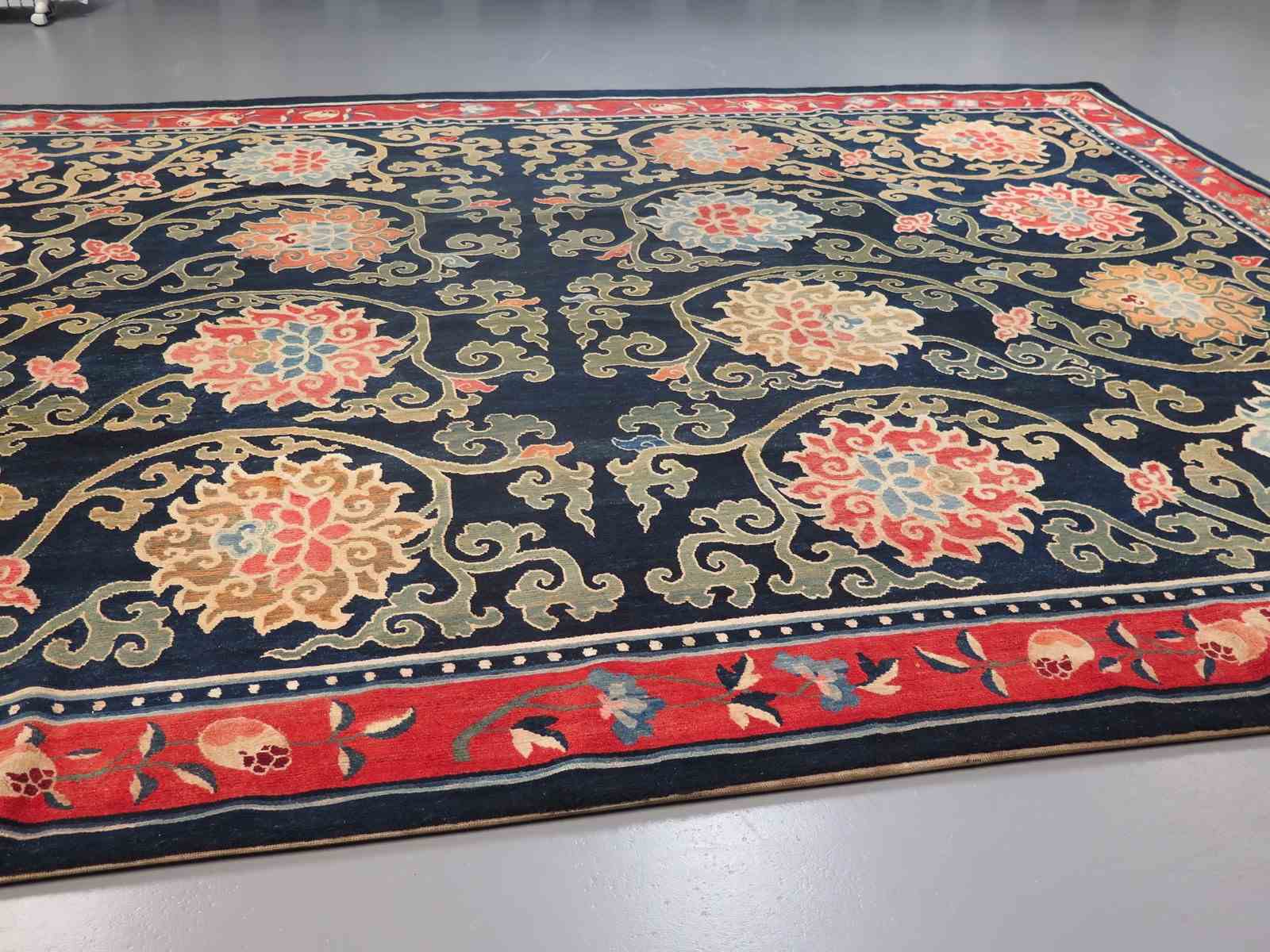 A unique and elegant Tibetan carpet in a rare room-size format – likely commissioned at the time for a member of the nobility, as most Tibetan pieces of the period were woven in a small rug format. The midnight blue field provides a great contrast to the striking design, with each drawing in the central field creatively repeated in various colour combinations, and framed by a simple red border. The charming array of hues in its palette are all vegetable-dyed, and have taken on a soft patina with age which adds great depth and character.