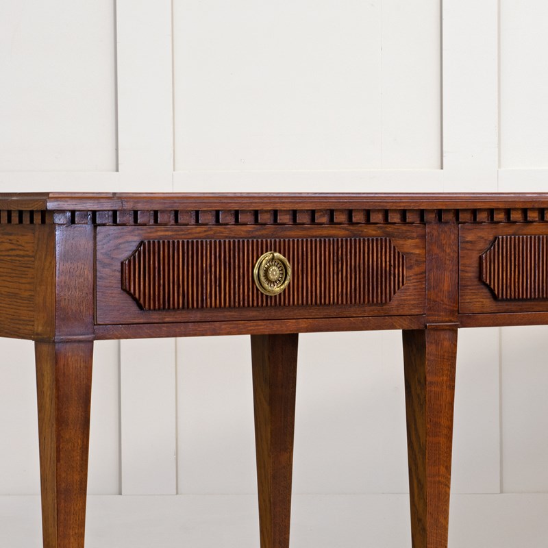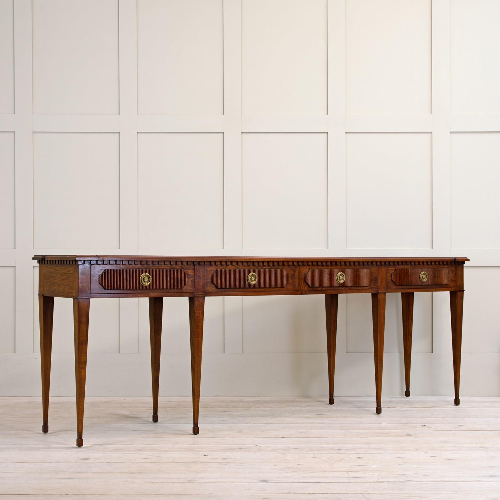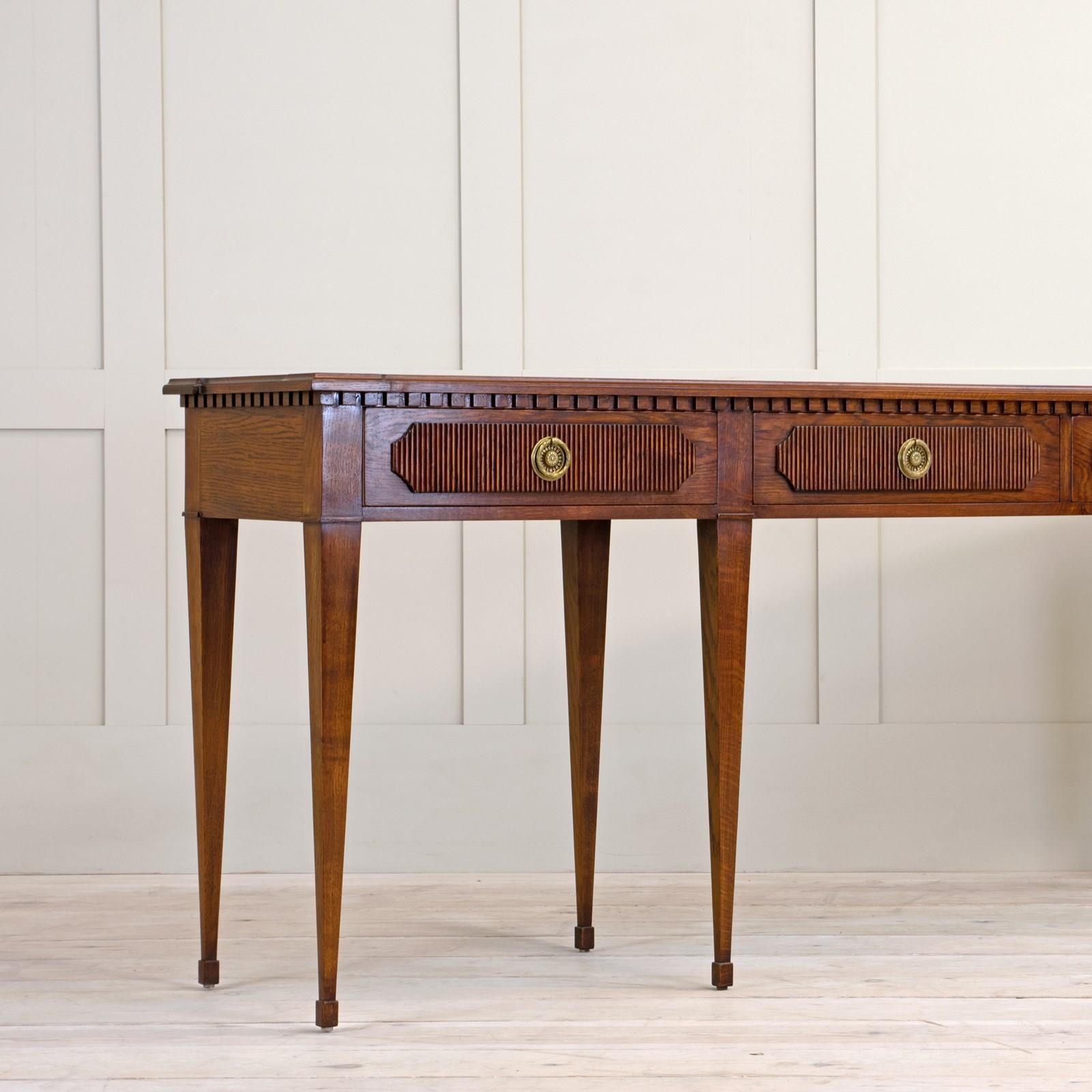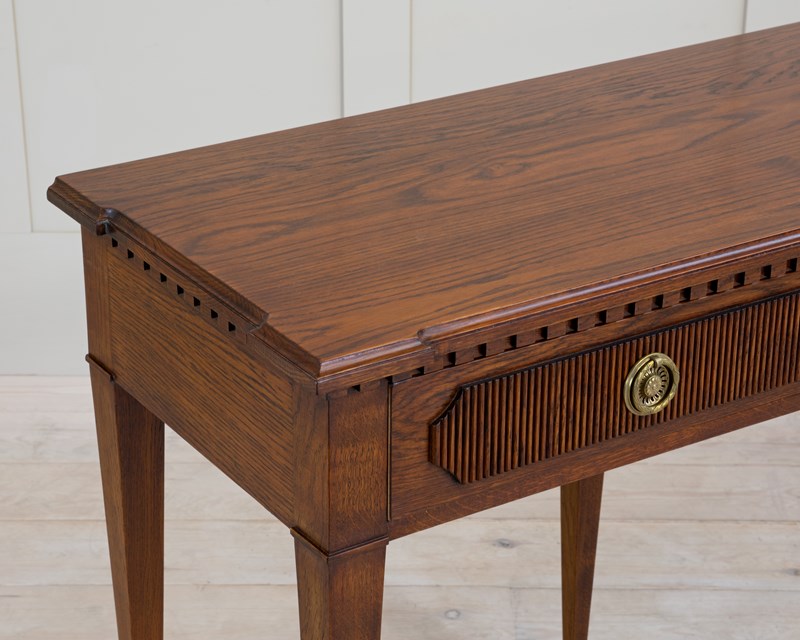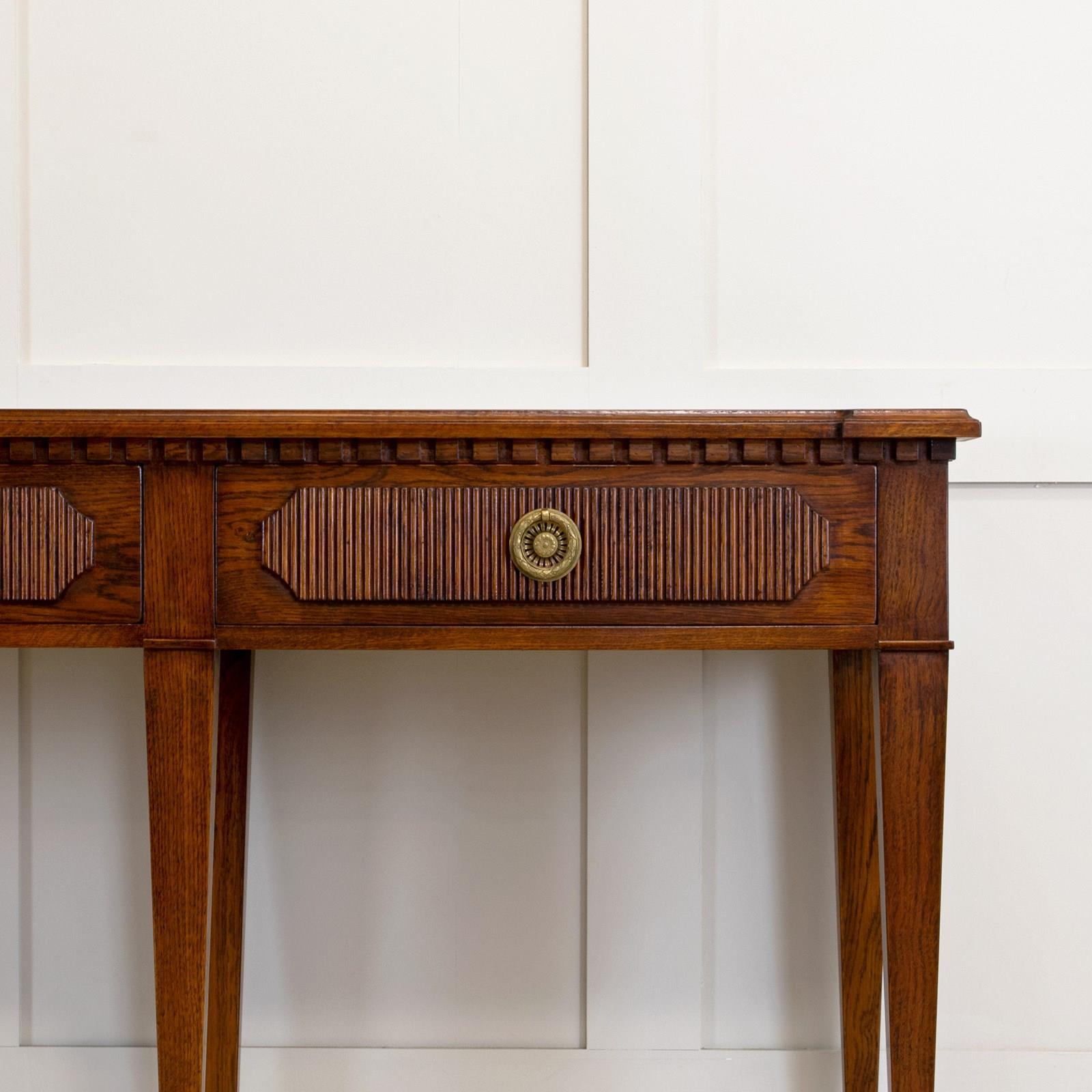 Our striking 'Freja' oak console table measures an impressive 7ft 6" (230cm) across, and would make a wonderful addition to an entrance hall, or reception room. Hand crafted from solid oak it features; a top with decorative shaped corners & dentil tooth frieze, over four drawers with vertical reeding & scalloped corners, hand cut dovetail joints, and stands on elegant square tapered Gustavian legs. Lost-wax 'Cire Perdue' precison cast solid brass pull handles. Please note that we can make this console table in smaller custom sizes. Available in four oak finishes; Limed oak, North Country oak, Chelsea oak, or Belgravia oak. Other oak colour finishes available upon request. These consoles can also be specified with solid marble tops.