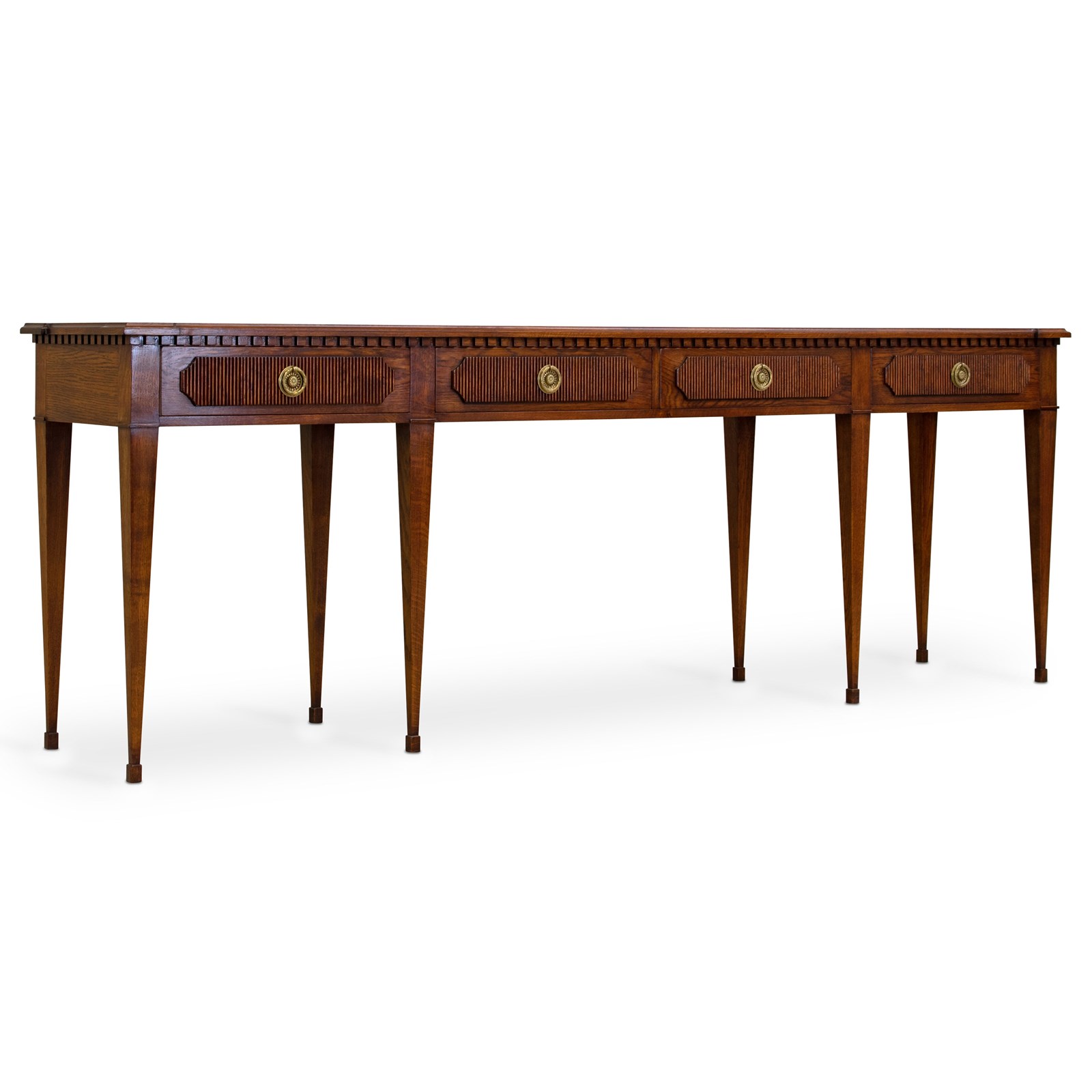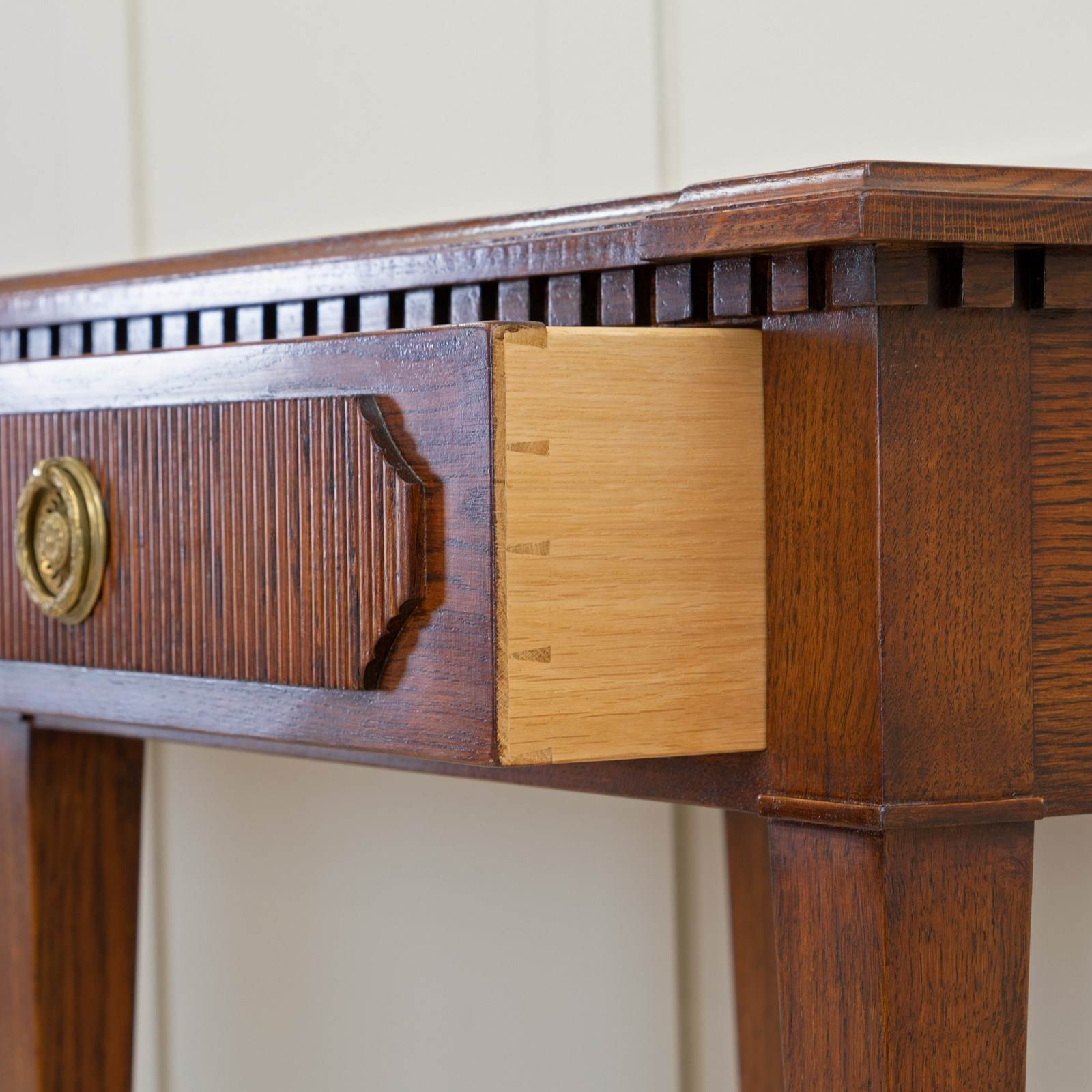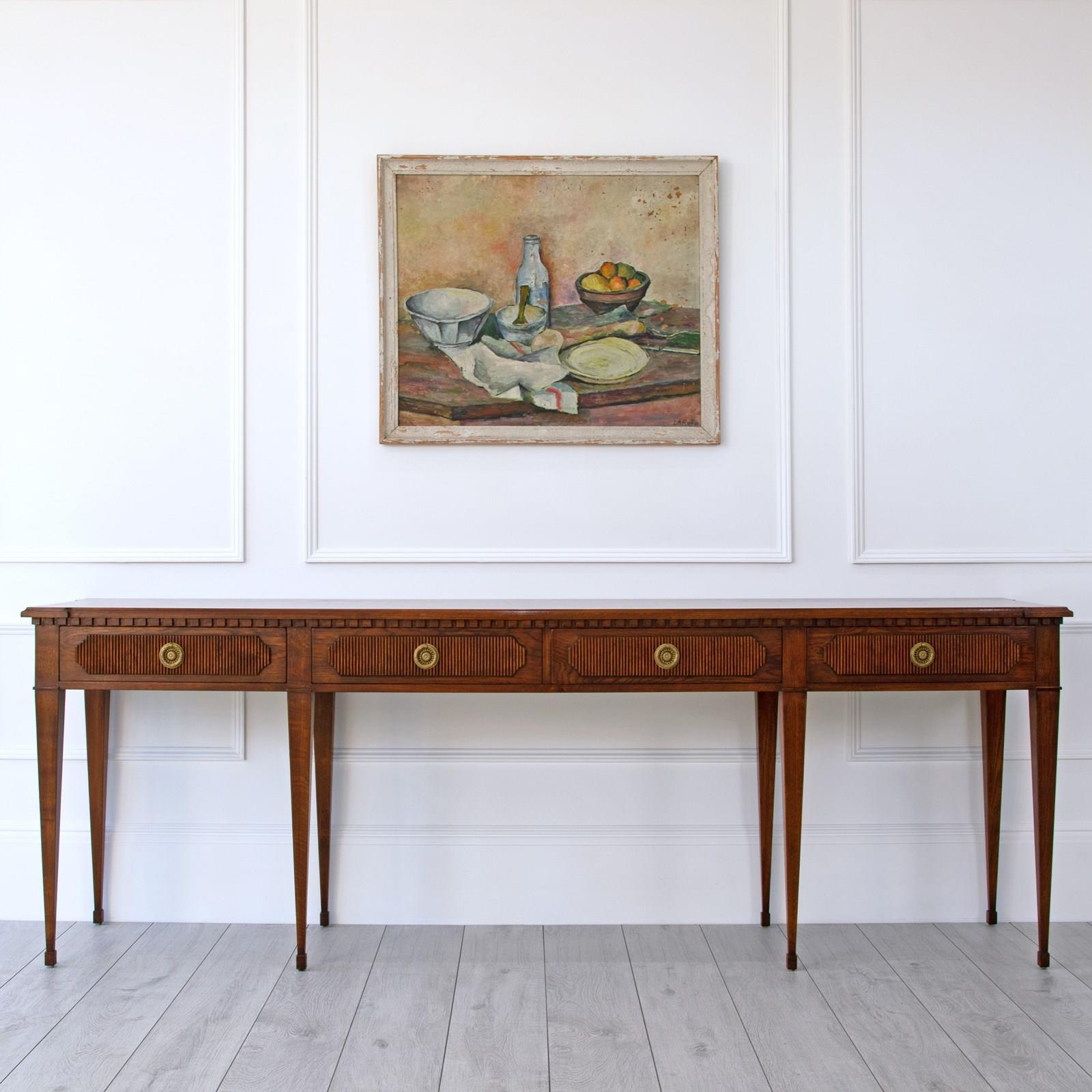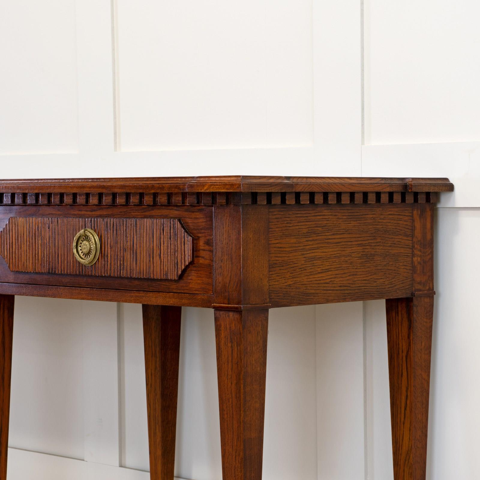 Our striking 'Freja' oak console table measures an impressive 7ft 6" (230cm) across, and would make a wonderful addition to an entrance hall, or reception room. Hand crafted from solid oak it features; a top with decorative shaped corners & dentil tooth frieze, over four drawers with vertical reeding & scalloped corners, hand cut dovetail joints, and stands on elegant square tapered Gustavian legs. Lost-wax 'Cire Perdue' precison cast solid brass pull handles. Please note that we can make this console table in smaller custom sizes. Available in four oak finishes; Limed oak, North Country oak, Chelsea oak, or Belgravia oak. Other oak colour finishes available upon request. These consoles can also be specified with solid marble tops.