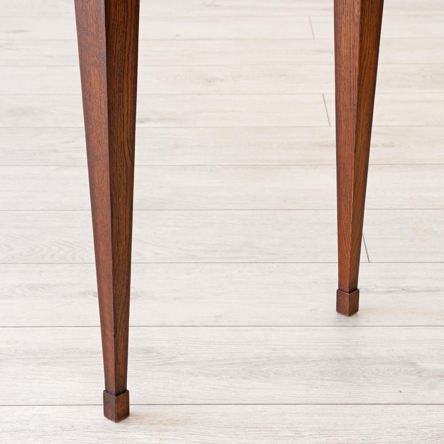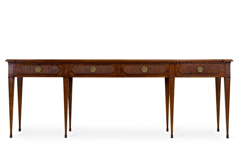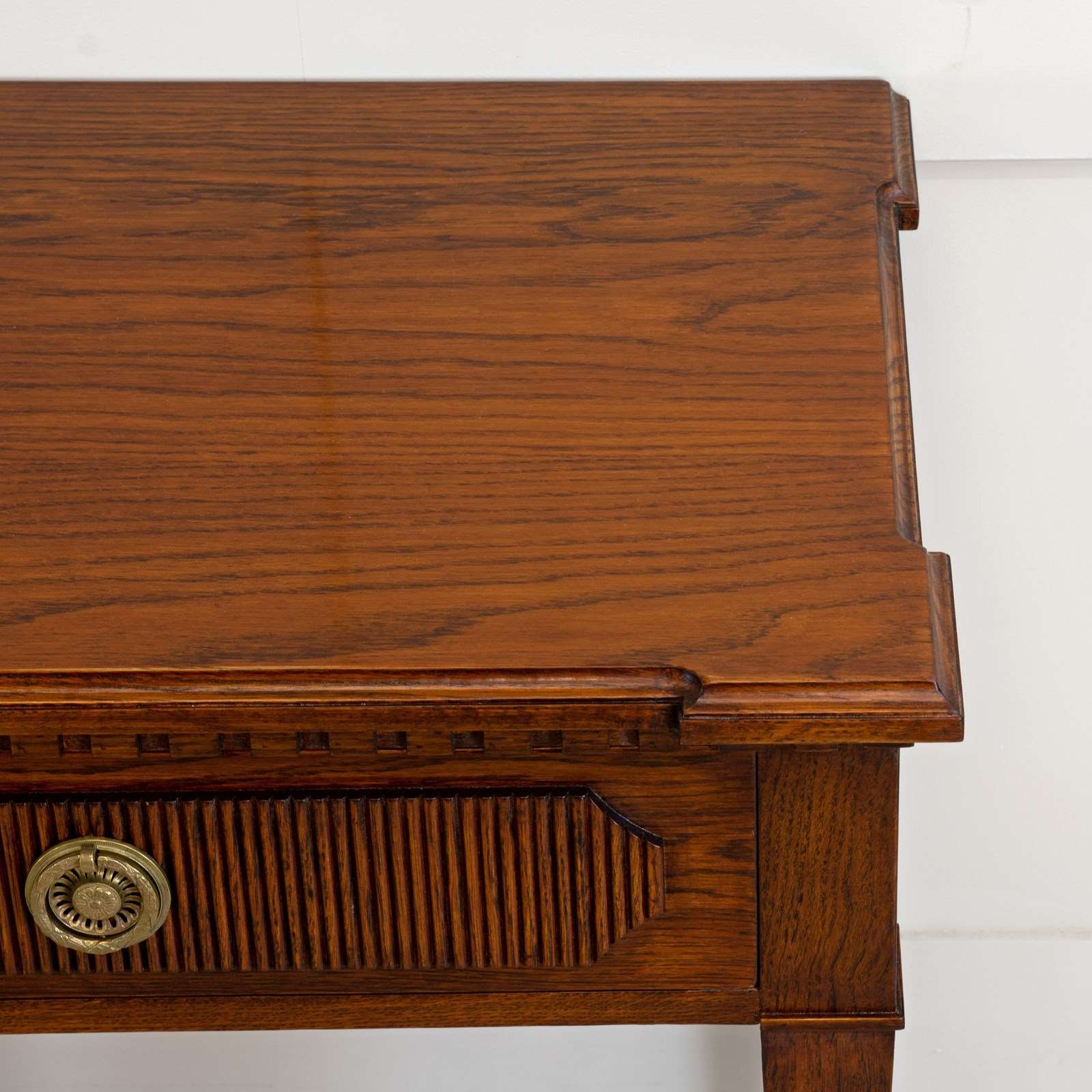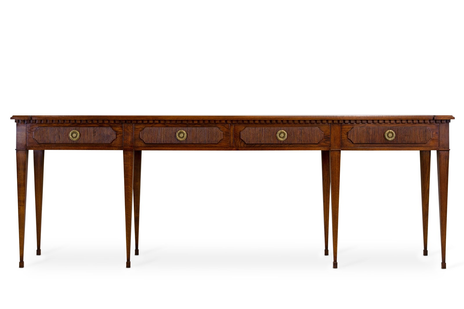 Our striking 'Freja' oak console table measures an impressive 7ft 6" (230cm) across, and would make a wonderful addition to an entrance hall, or reception room. Hand crafted from solid oak it features; a top with decorative shaped corners & dentil tooth frieze, over four drawers with vertical reeding & scalloped corners, hand cut dovetail joints, and stands on elegant square tapered Gustavian legs. Lost-wax 'Cire Perdue' precison cast solid brass pull handles. Please note that we can make this console table in smaller custom sizes. Available in four oak finishes; Limed oak, North Country oak, Chelsea oak, or Belgravia oak. Other oak colour finishes available upon request. These consoles can also be specified with solid marble tops.