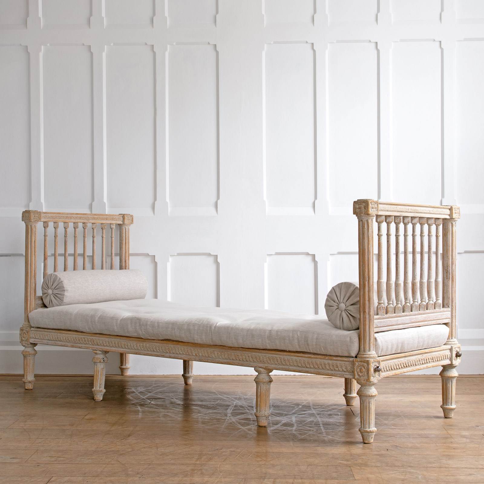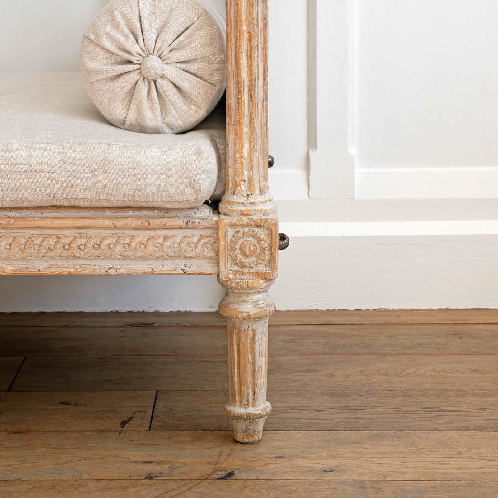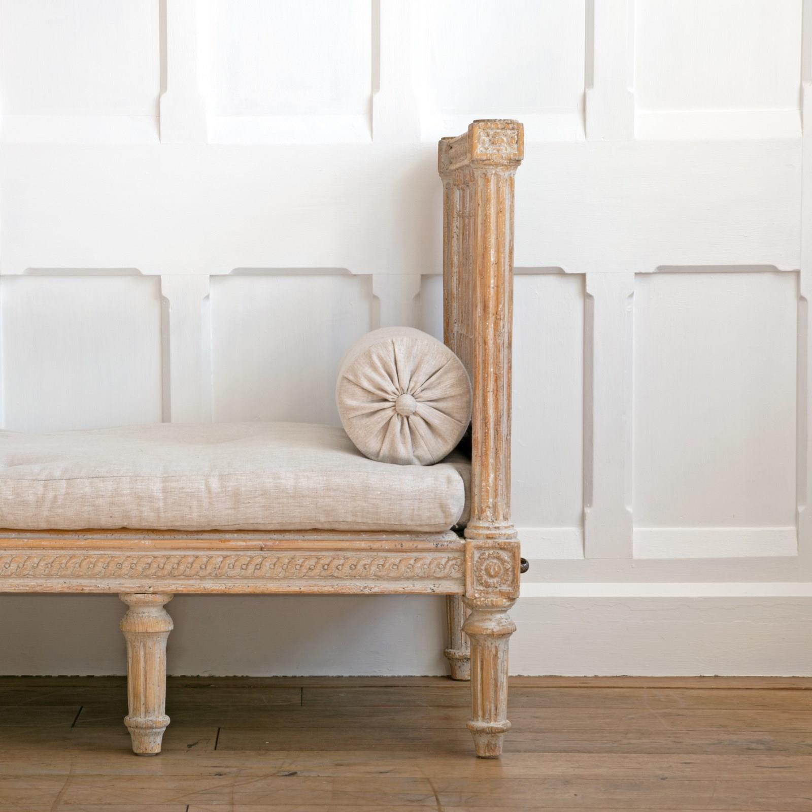 An exquisite and very rare 18th century Gustavian period daybed richly carved on all four sides, and therefore equally at home placed in the middle of the room, as against a wall or foot of the bed. This gorgeous statement piece has been newly re-upholstered in natural linen and has matching cylindrical bolsters. Swedish circa 1780.