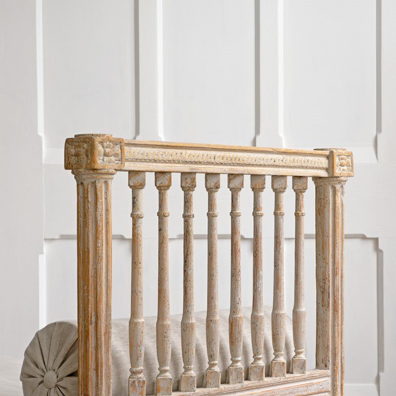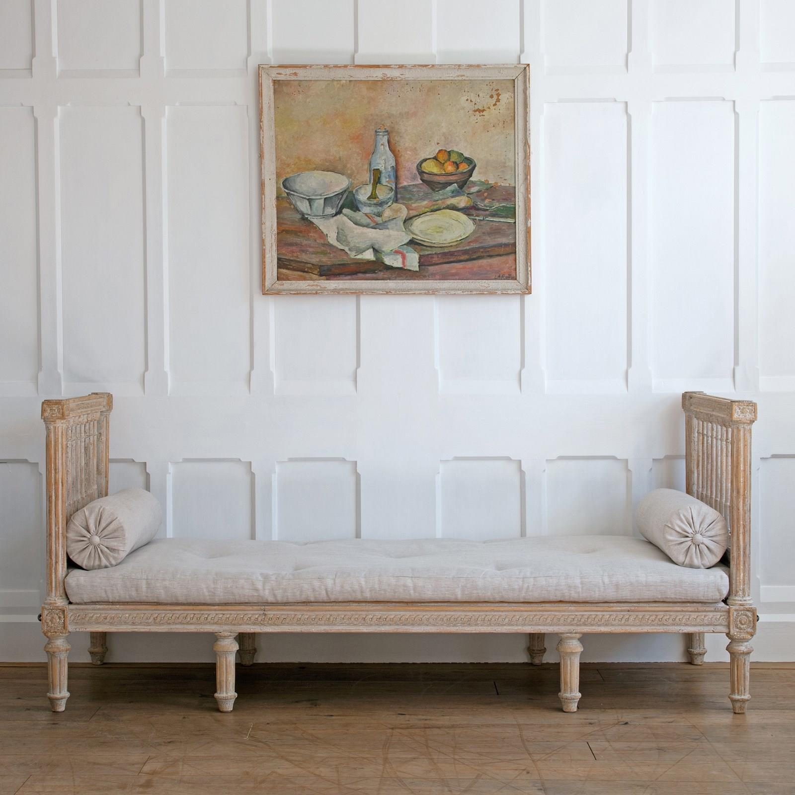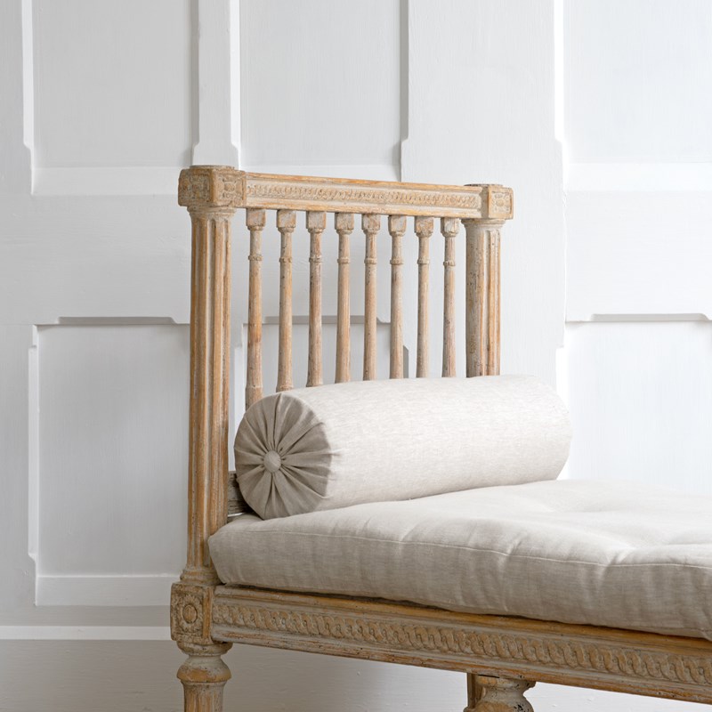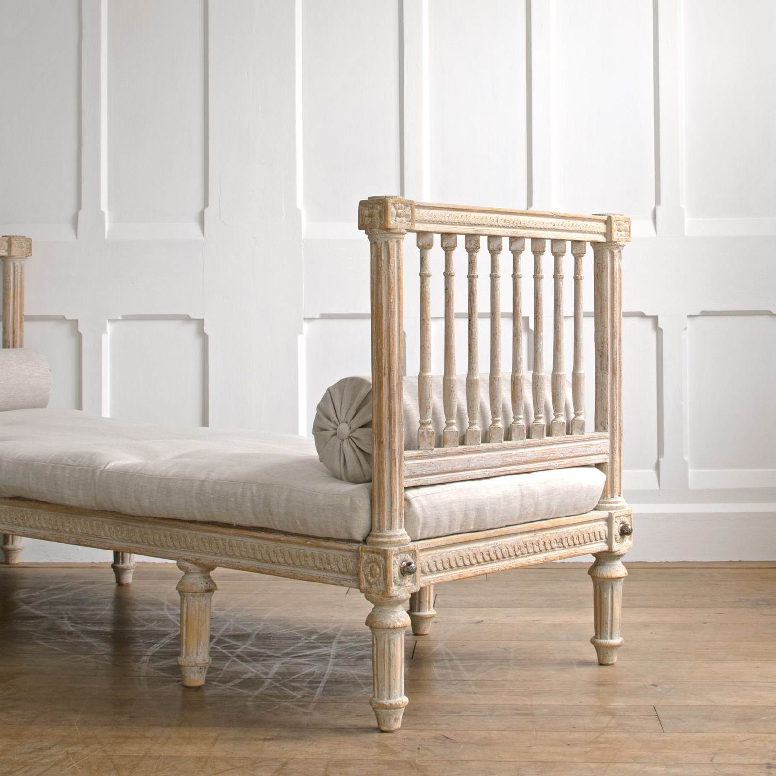 An exquisite and very rare 18th century Gustavian period daybed richly carved on all four sides, and therefore equally at home placed in the middle of the room, as against a wall or foot of the bed. This gorgeous statement piece has been newly re-upholstered in natural linen and has matching cylindrical bolsters. Swedish circa 1780.