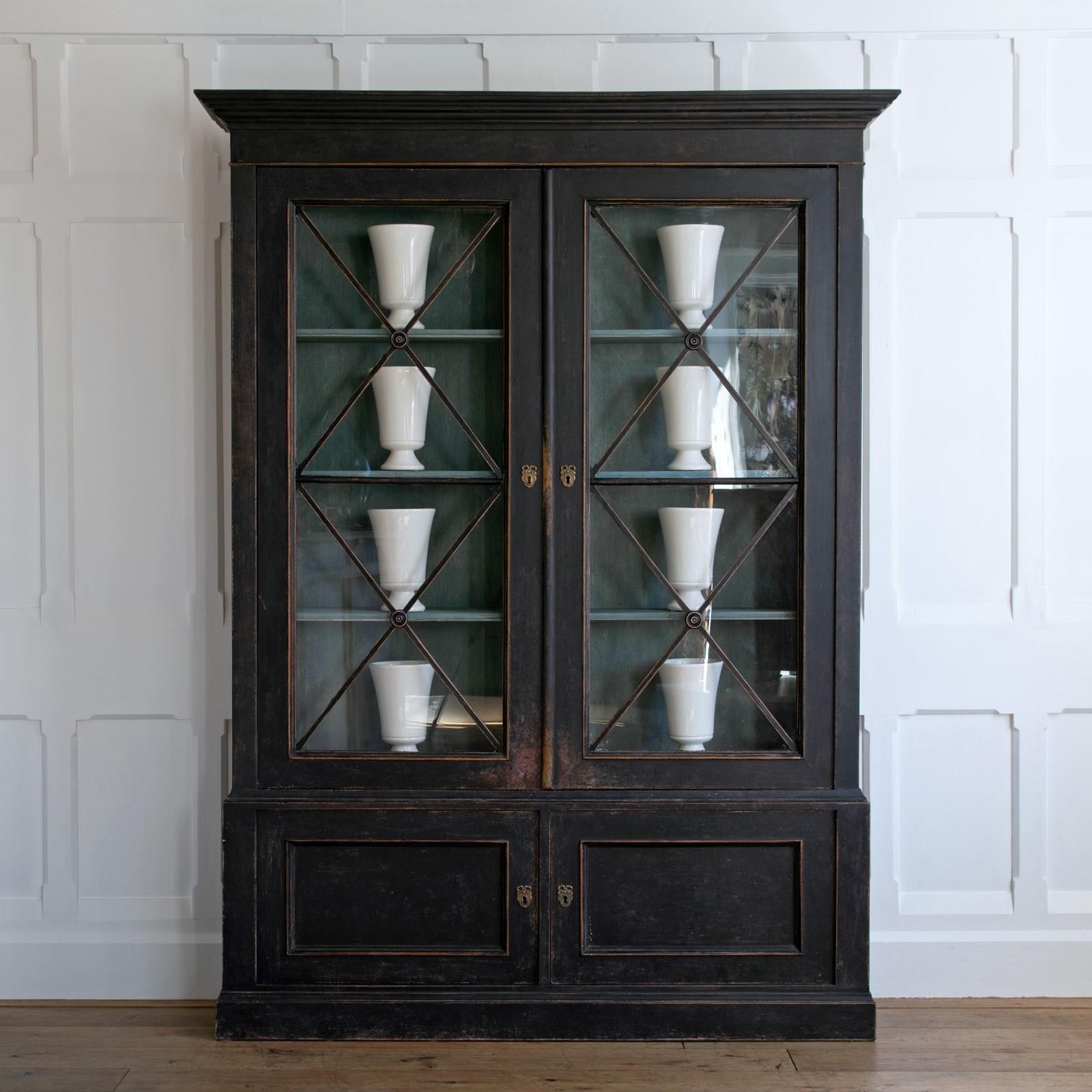 A striking late 19th century Gustavian style glass vitrine display cabinet or bookcase retaining the original, height adjustable shelving system. A handome piece of furniture that would make a statement in any room. Swedish circa 1890 to 1900.