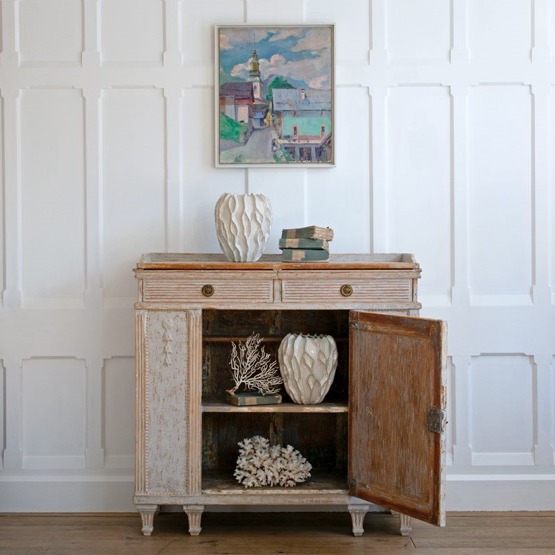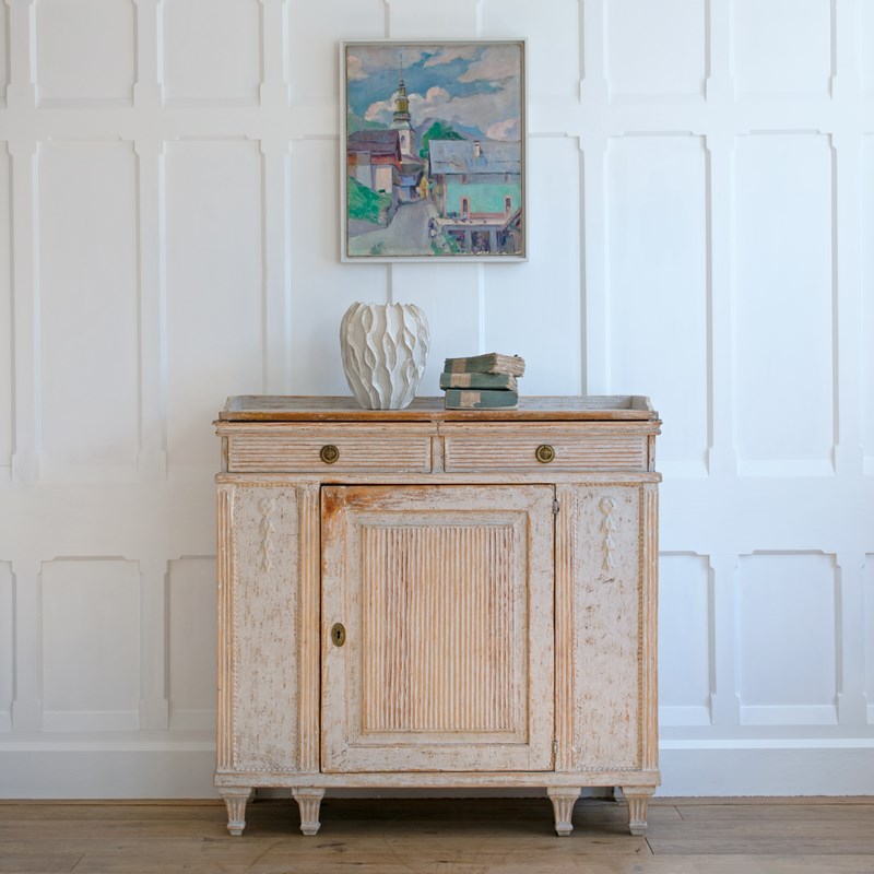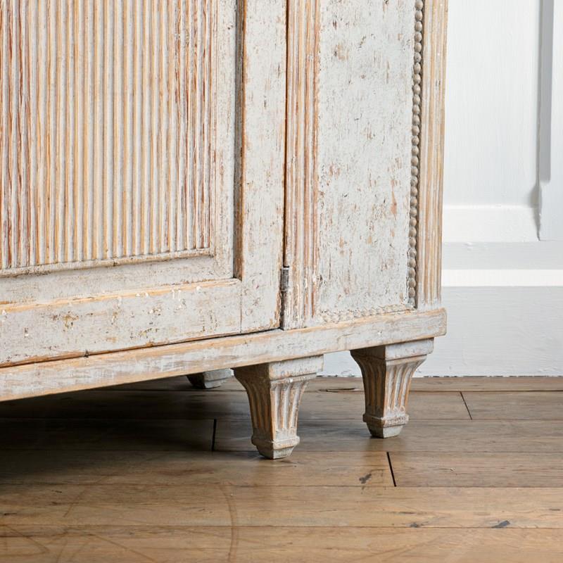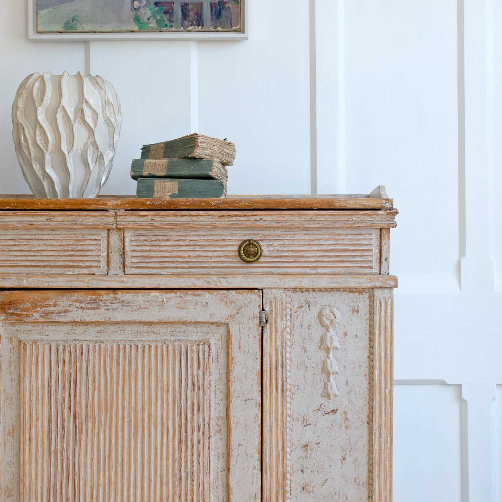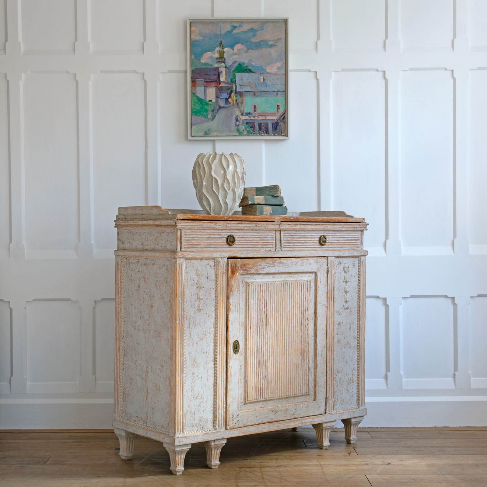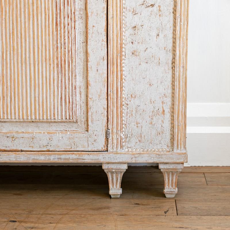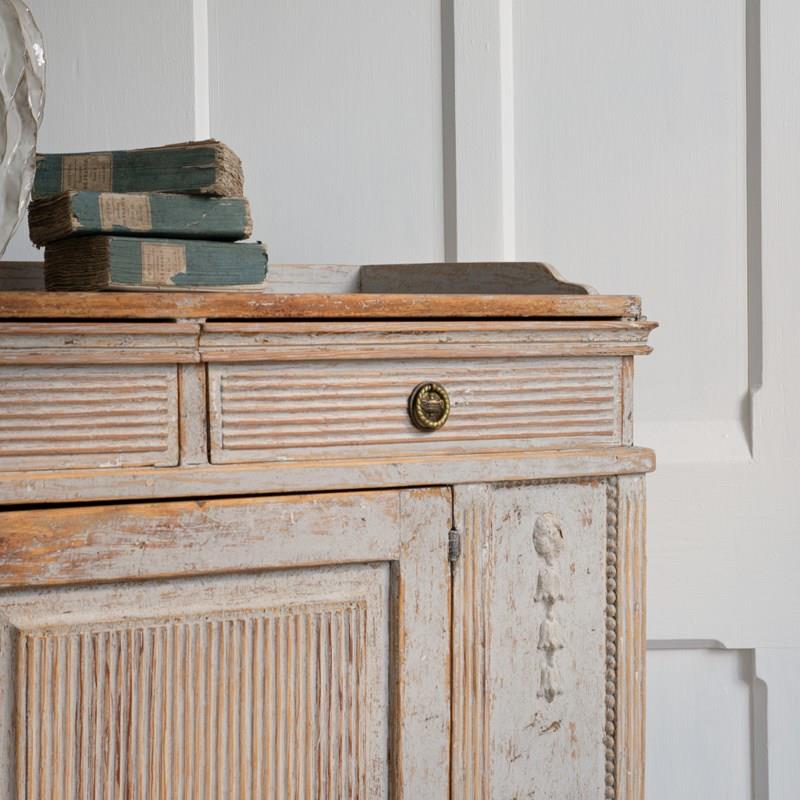 An exceptional 18th century Gustavian period buffet with a shaped balustrade top, and richly decorated with horizontal fluted drawers, beaded borders set between triple fluted columns with decorative hand carved florette & leaf drop appliques, and raised on shaped square tapeered & fluted feet. Internally the sideboard retains its original time-worn paint. Swedish circa 1790.