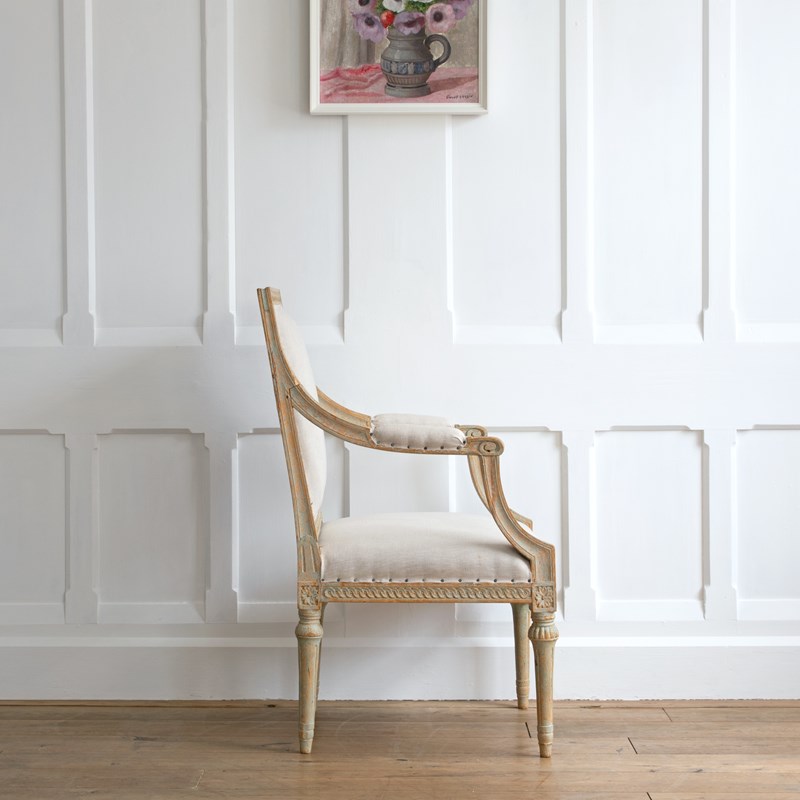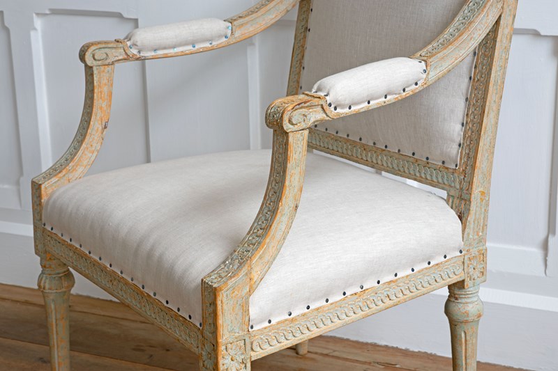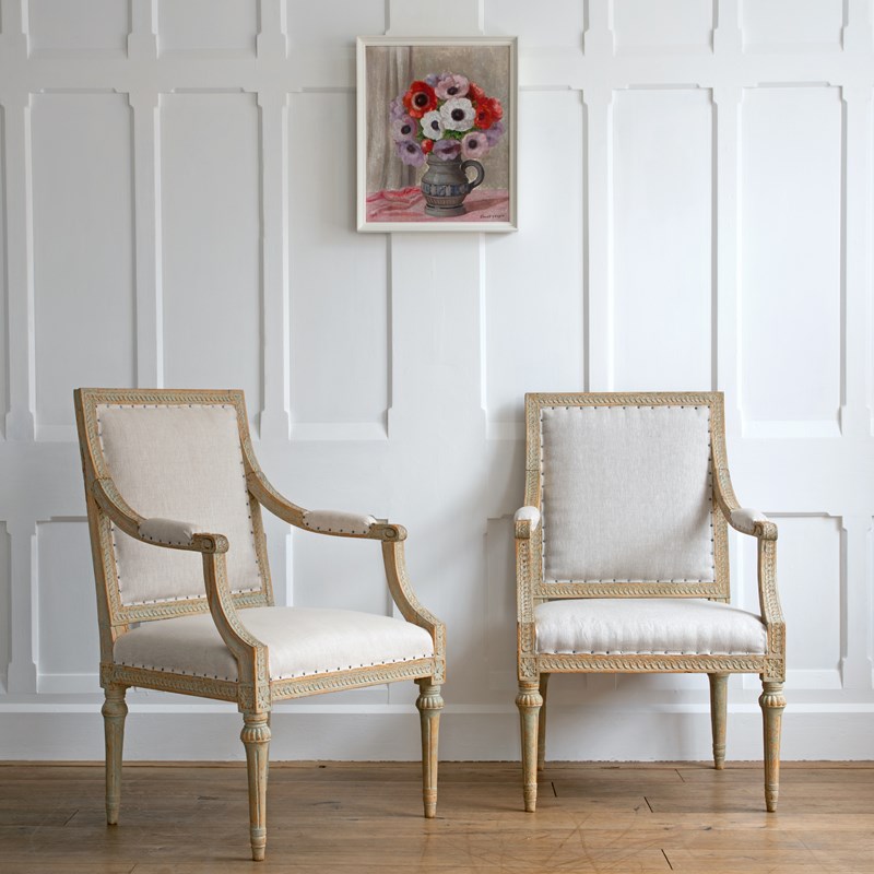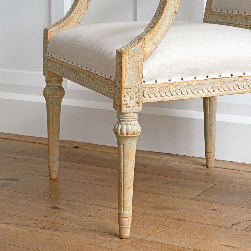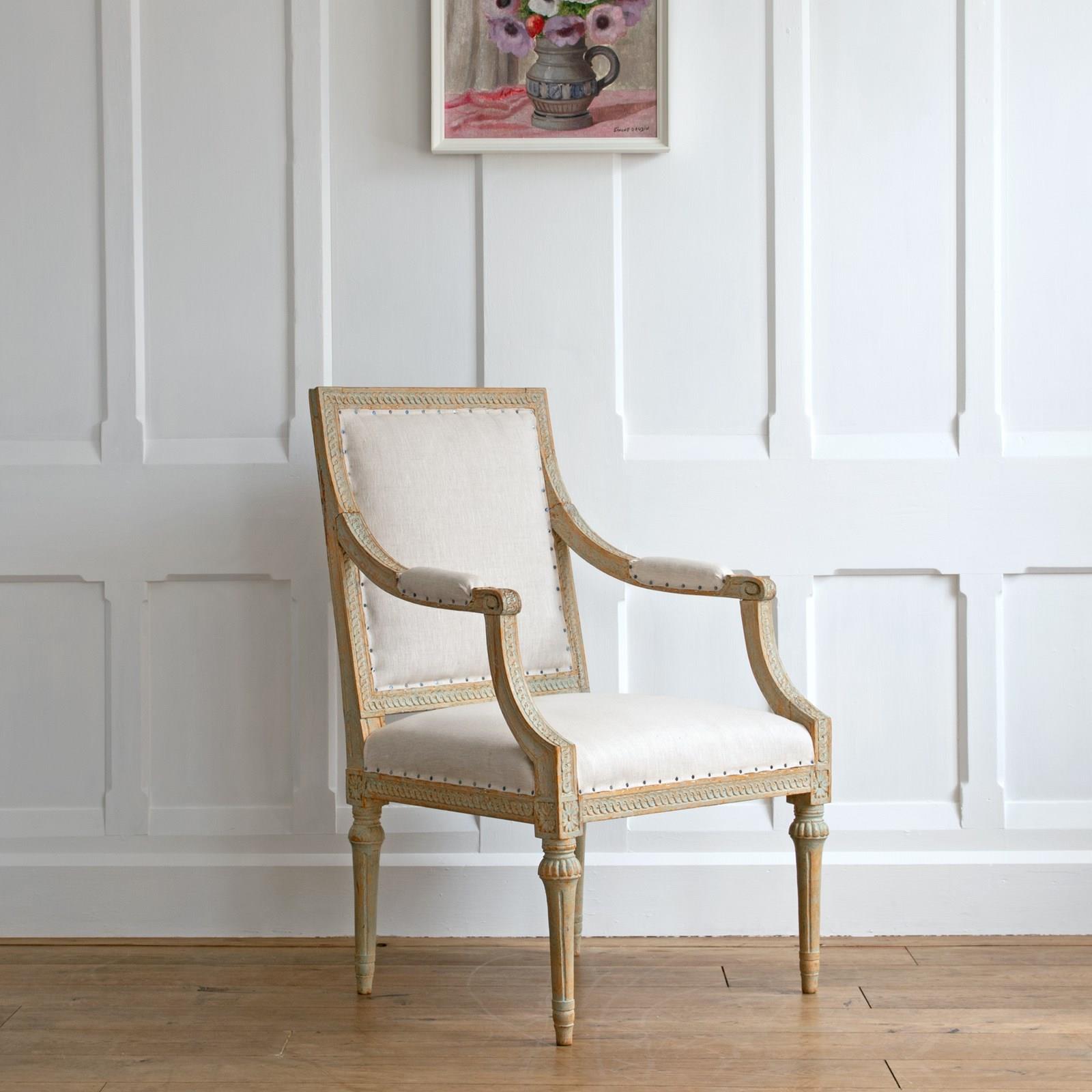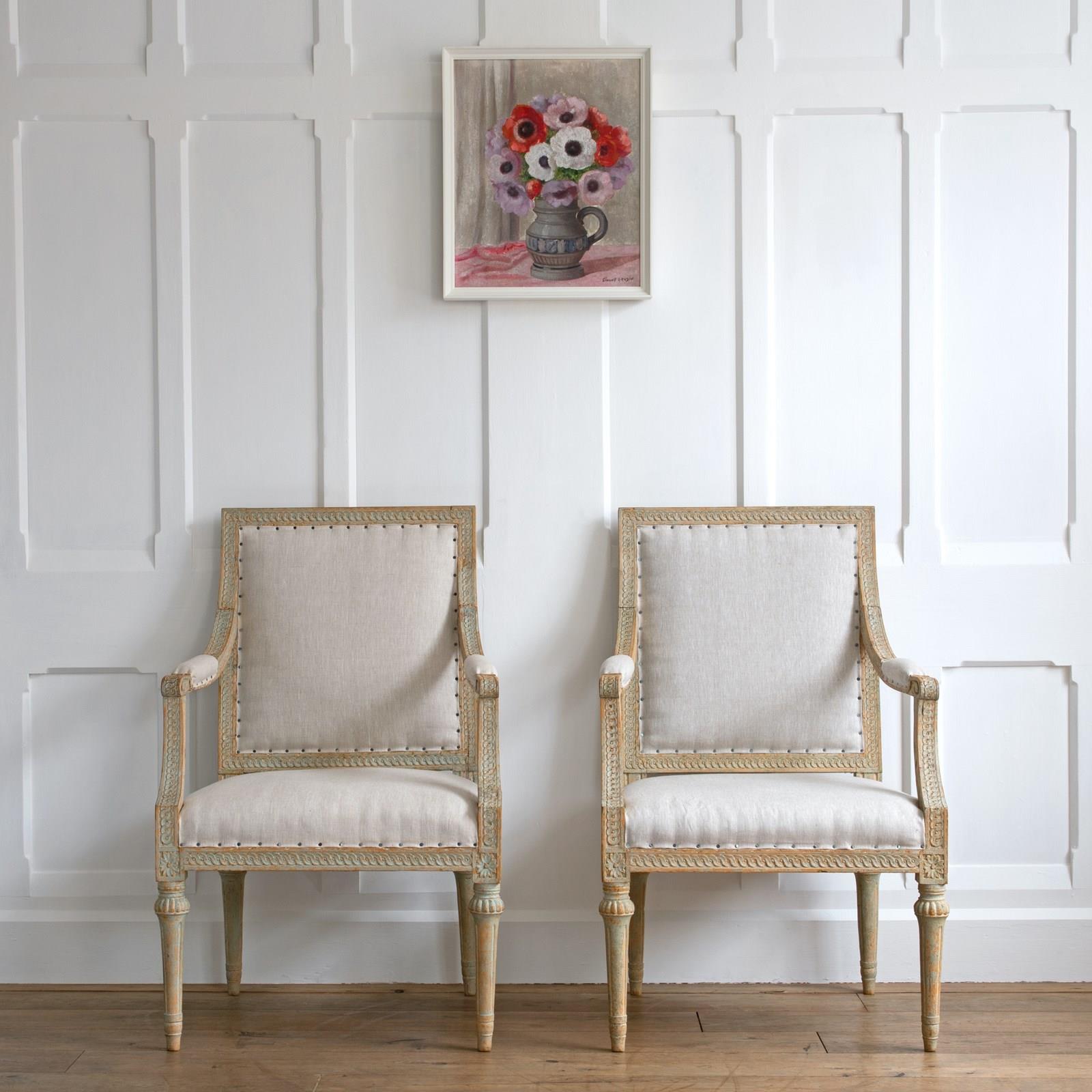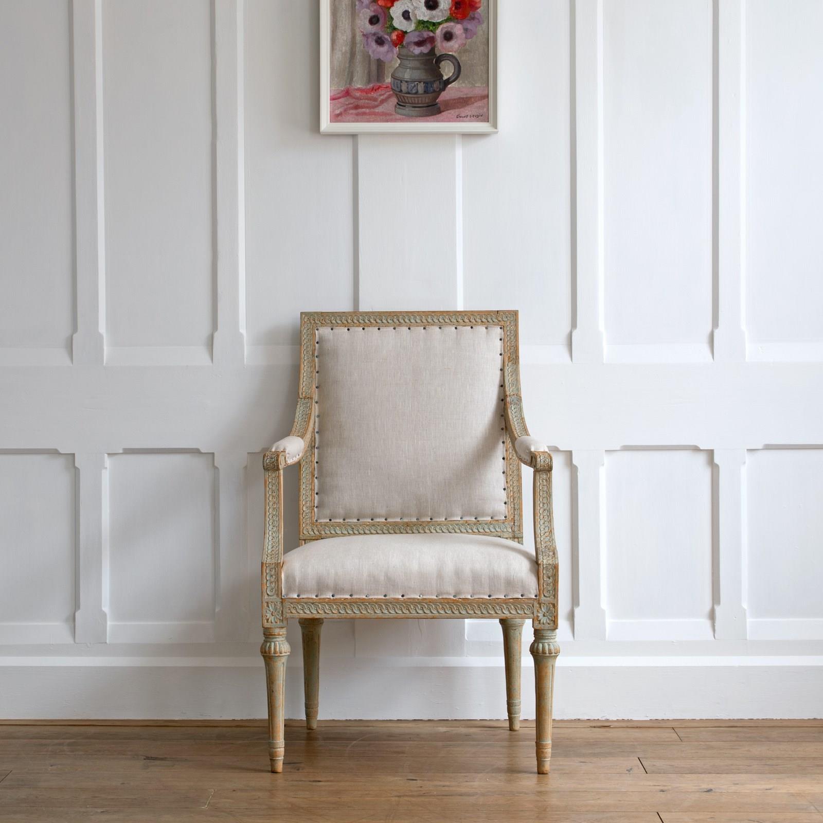 Sourced from the Grand Villa Sirishov on the Royal island of Djurgården in Stockholm. Sirishov was owned at the time of the armchairs making, by Sten Abraham Piper, the Lord Chamberlain of the Royal Household of King Gustav III (1746 - 1792). When Sten passed away, the castle was gifted to Countess Aurora Wetterstedt. On her passing the house and its contents were bequeathed to King Gustav IV Adolph (1778 - 1837) and the property remained in Royal ownership under King Karl XIV Johan (1763 - 1844), King Oscar I (1799 - 1859) and Queen Josefina (1807 - 1876).