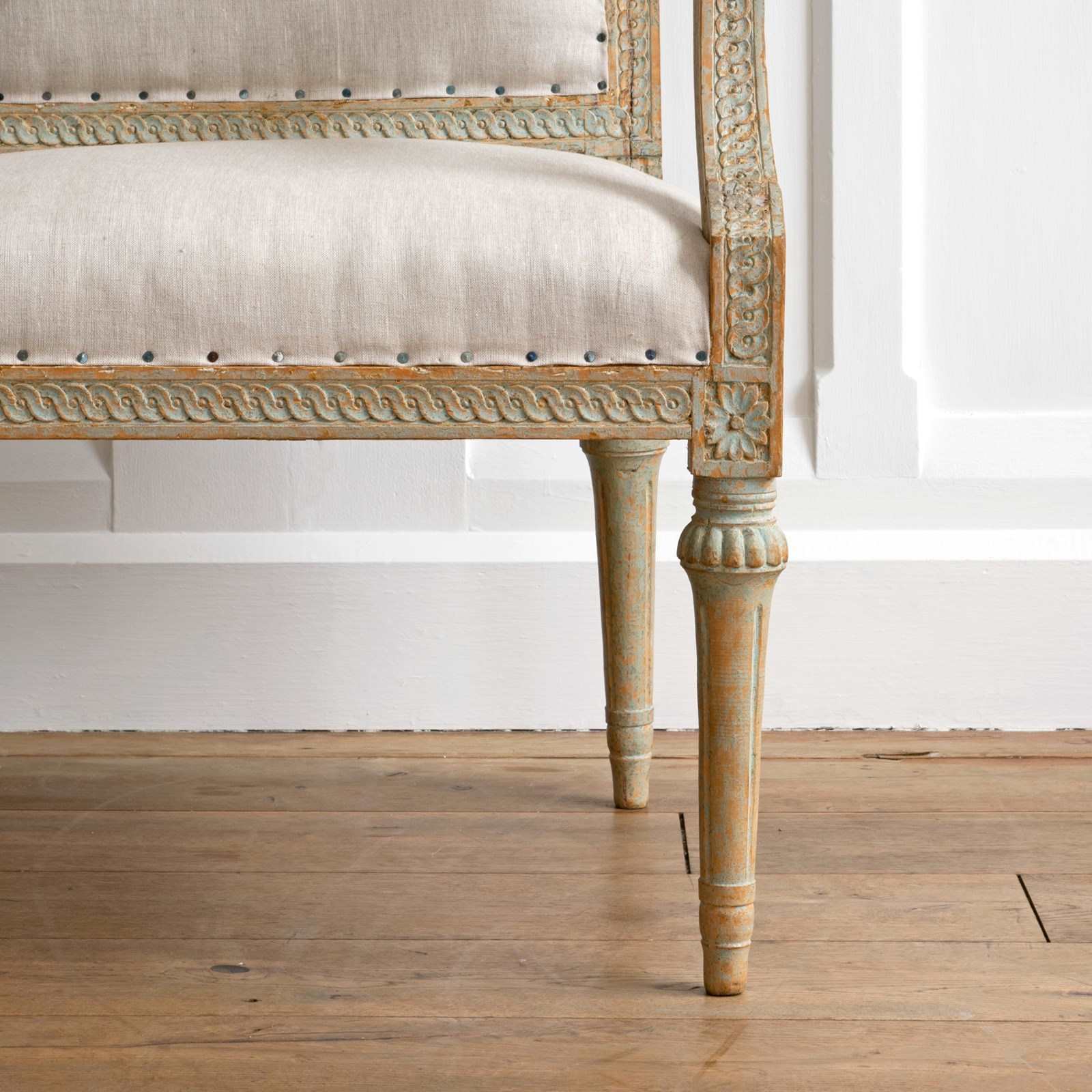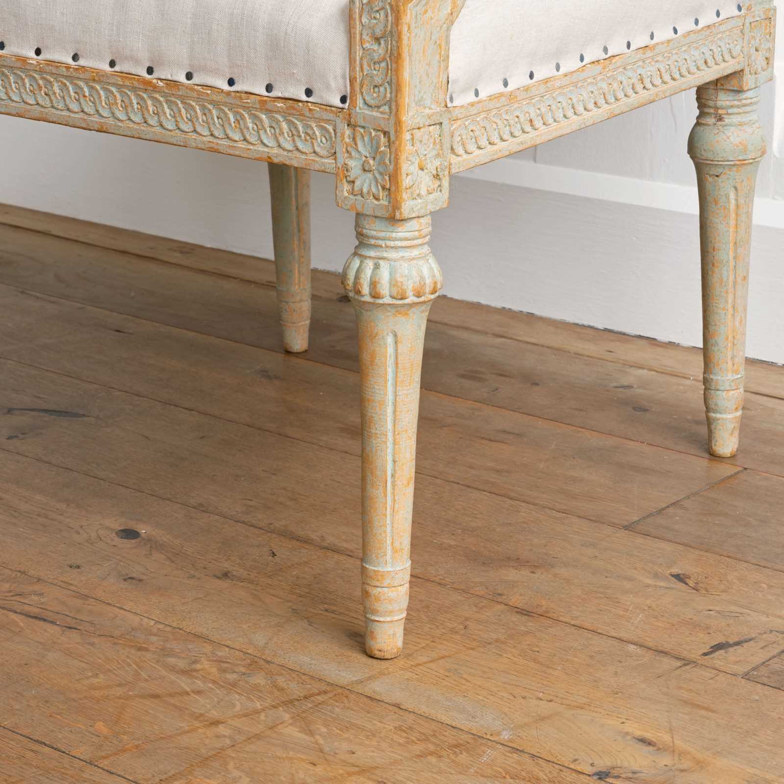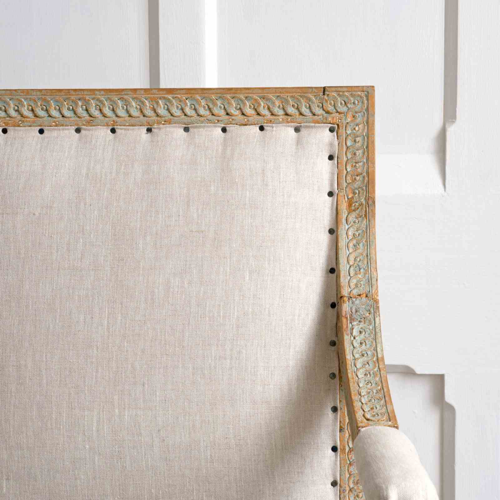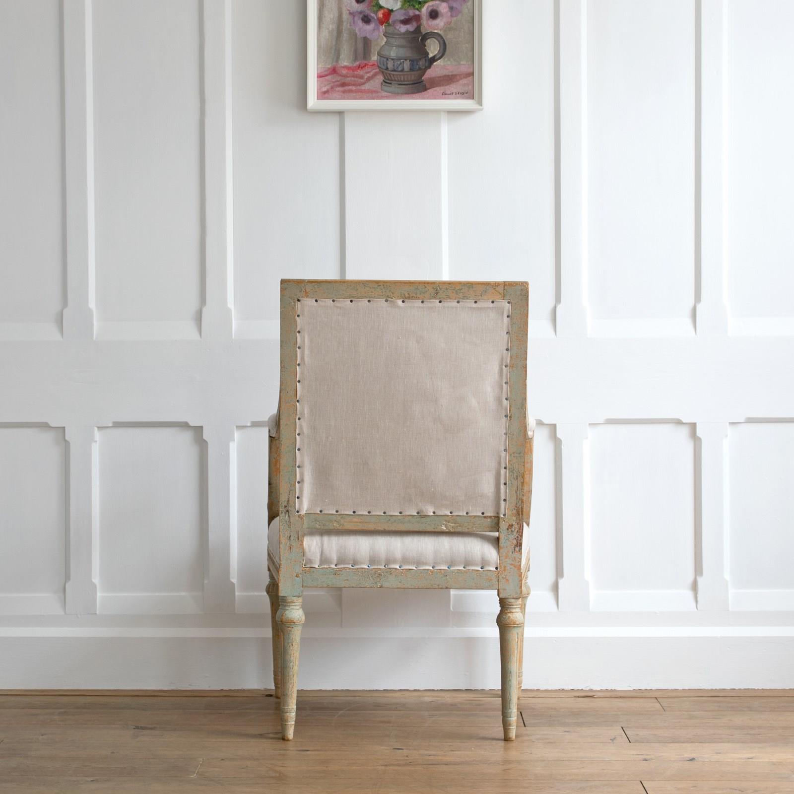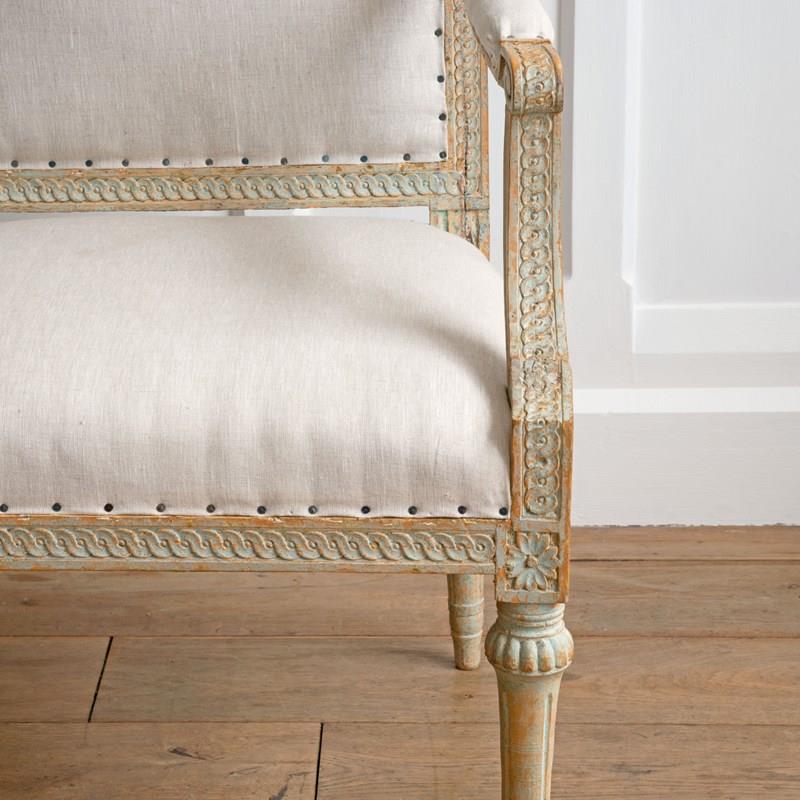 Sourced from the Grand Villa Sirishov on the Royal island of Djurgården in Stockholm. Sirishov was owned at the time of the armchairs making, by Sten Abraham Piper, the Lord Chamberlain of the Royal Household of King Gustav III (1746 - 1792). When Sten passed away, the castle was gifted to Countess Aurora Wetterstedt. On her passing the house and its contents were bequeathed to King Gustav IV Adolph (1778 - 1837) and the property remained in Royal ownership under King Karl XIV Johan (1763 - 1844), King Oscar I (1799 - 1859) and Queen Josefina (1807 - 1876).