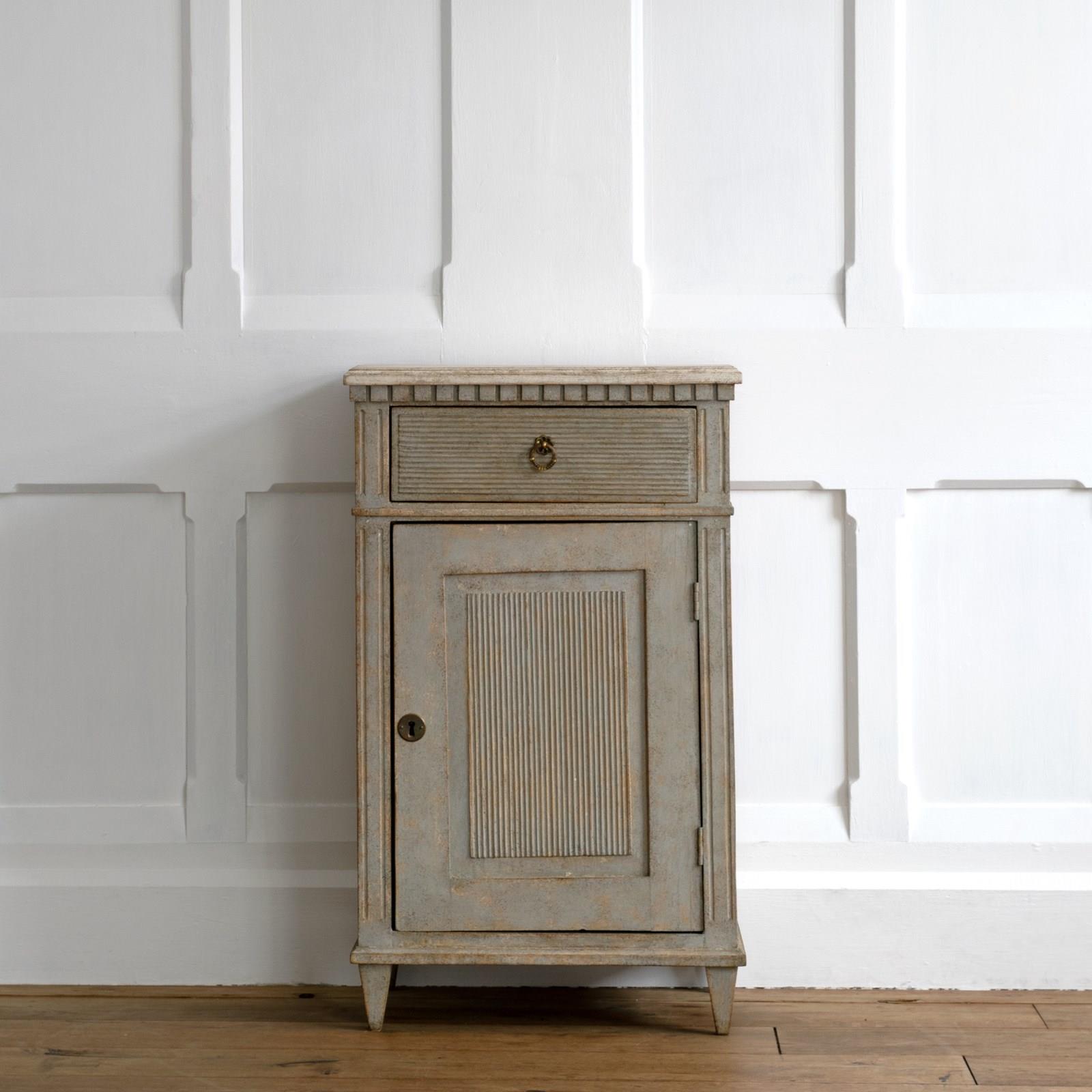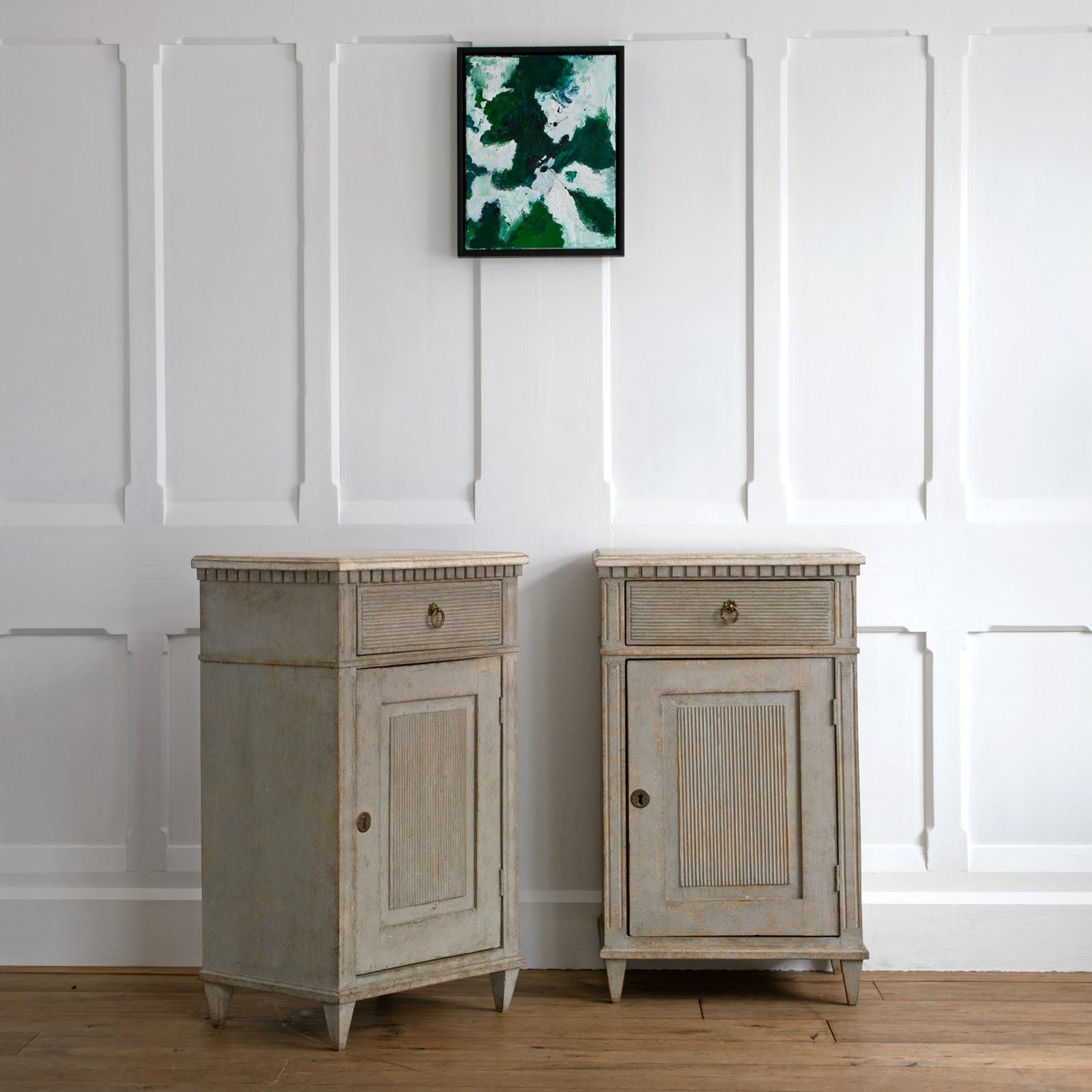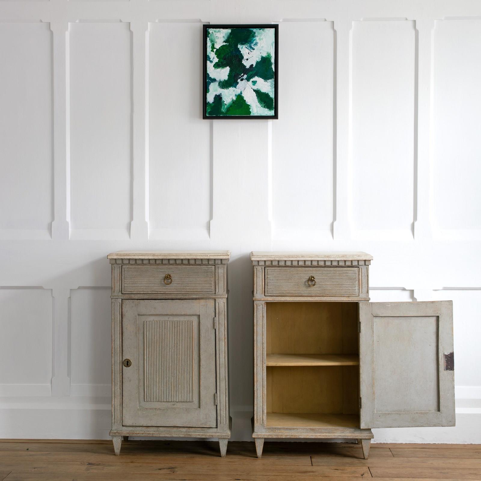 A wonderful pair of rare 19th century Gustavian style bedside cabinets with classic Swedish reeded details, dentil frieze border, shelved interior with locking doors, and raised on square tapered feet. Swedish circa 1880 to 1890.