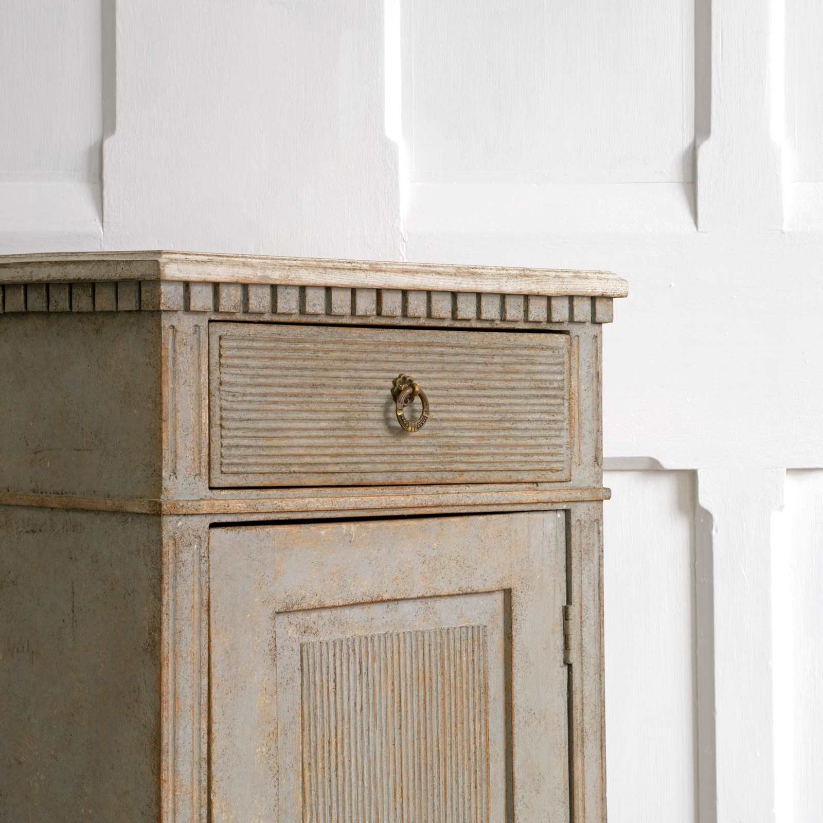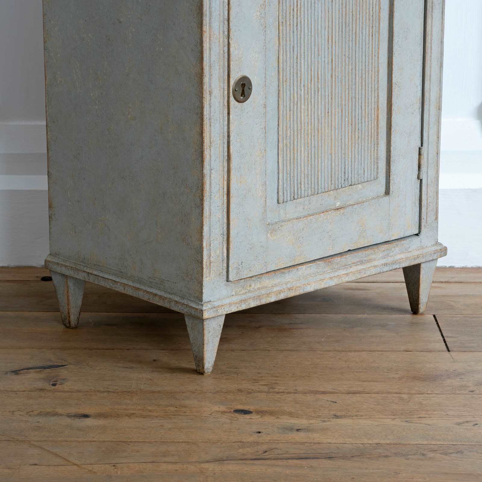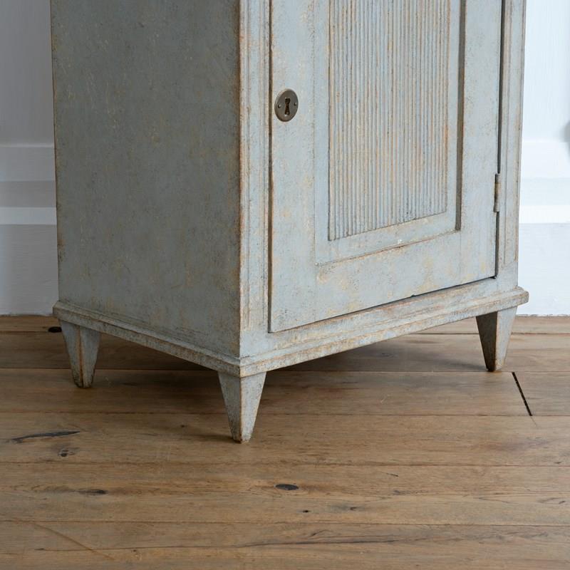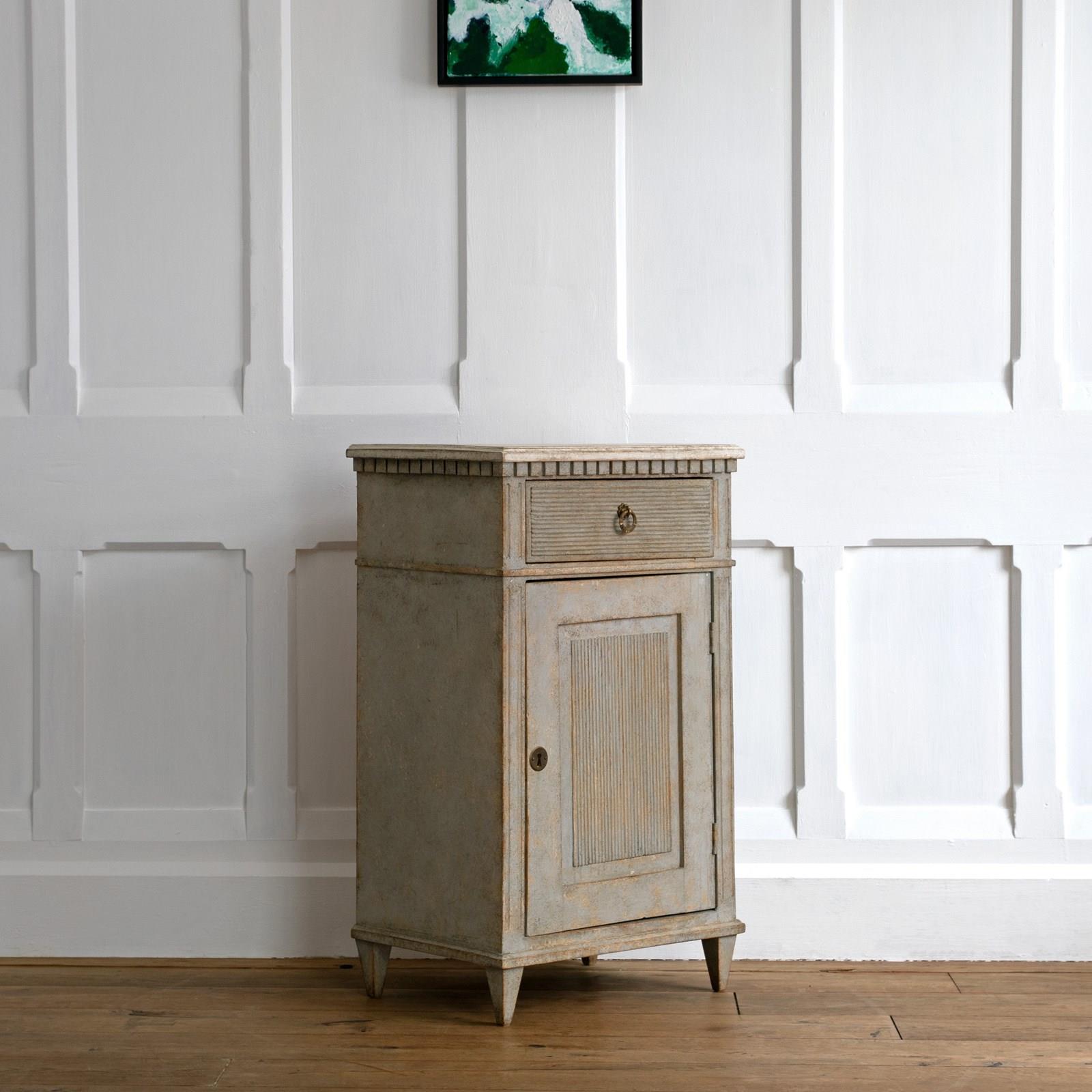 A wonderful pair of rare 19th century Gustavian style bedside cabinets with classic Swedish reeded details, dentil frieze border, shelved interior with locking doors, and raised on square tapered feet. Swedish circa 1880 to 1890.