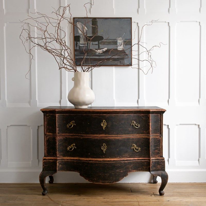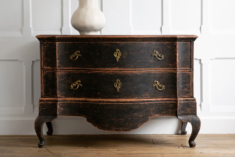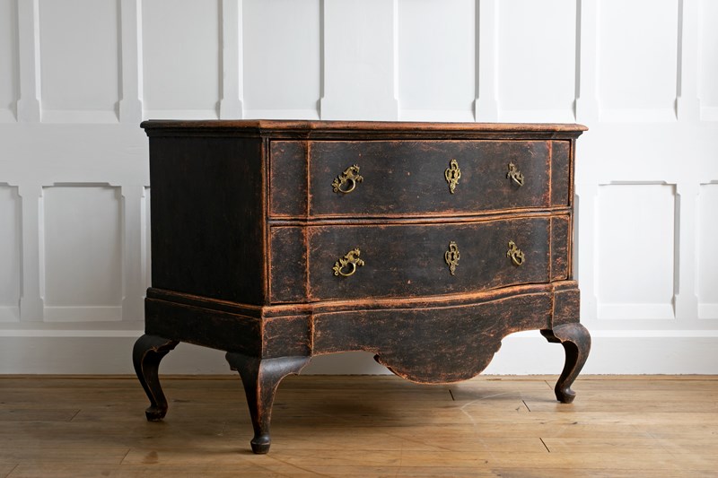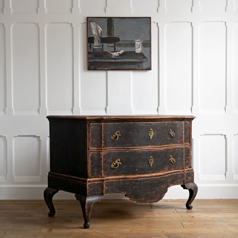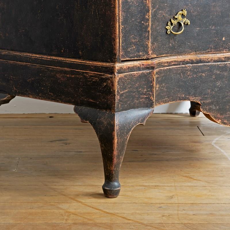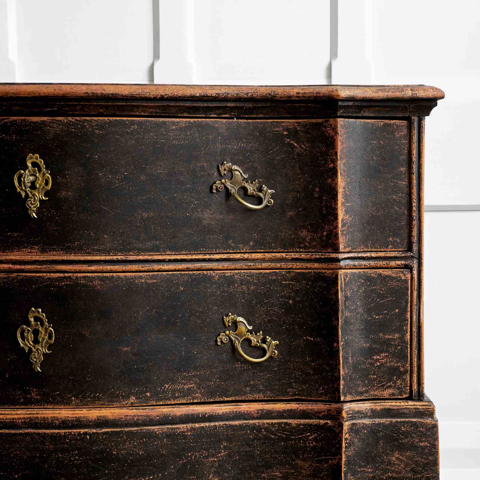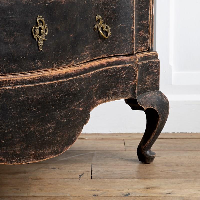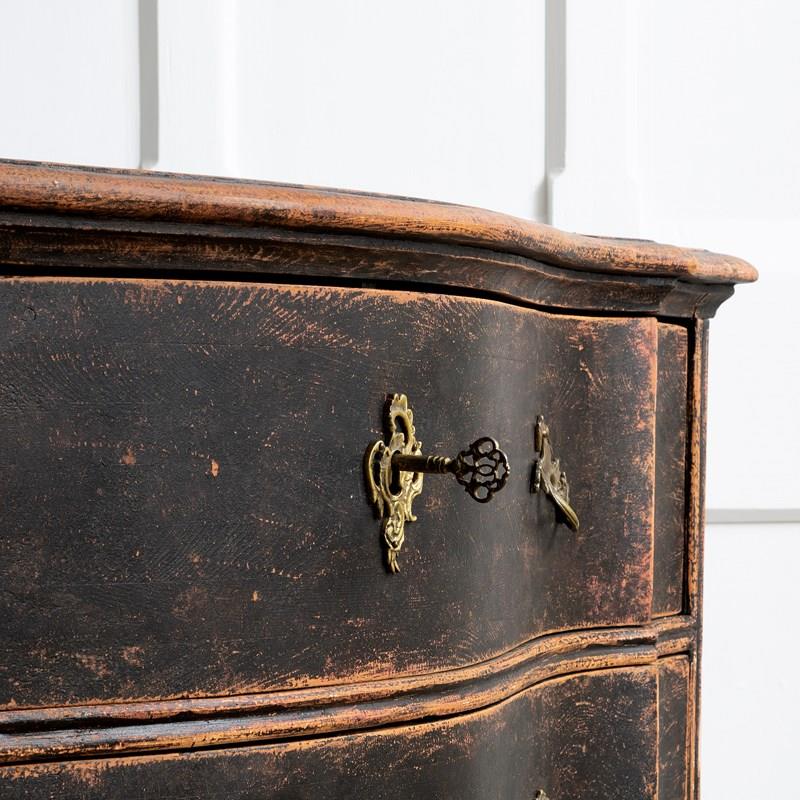 A magnificent 18th century Rococo period serpentine chest in oak and pine wood with all original locks, key, handles and escutcheons. Danish circa 1780.