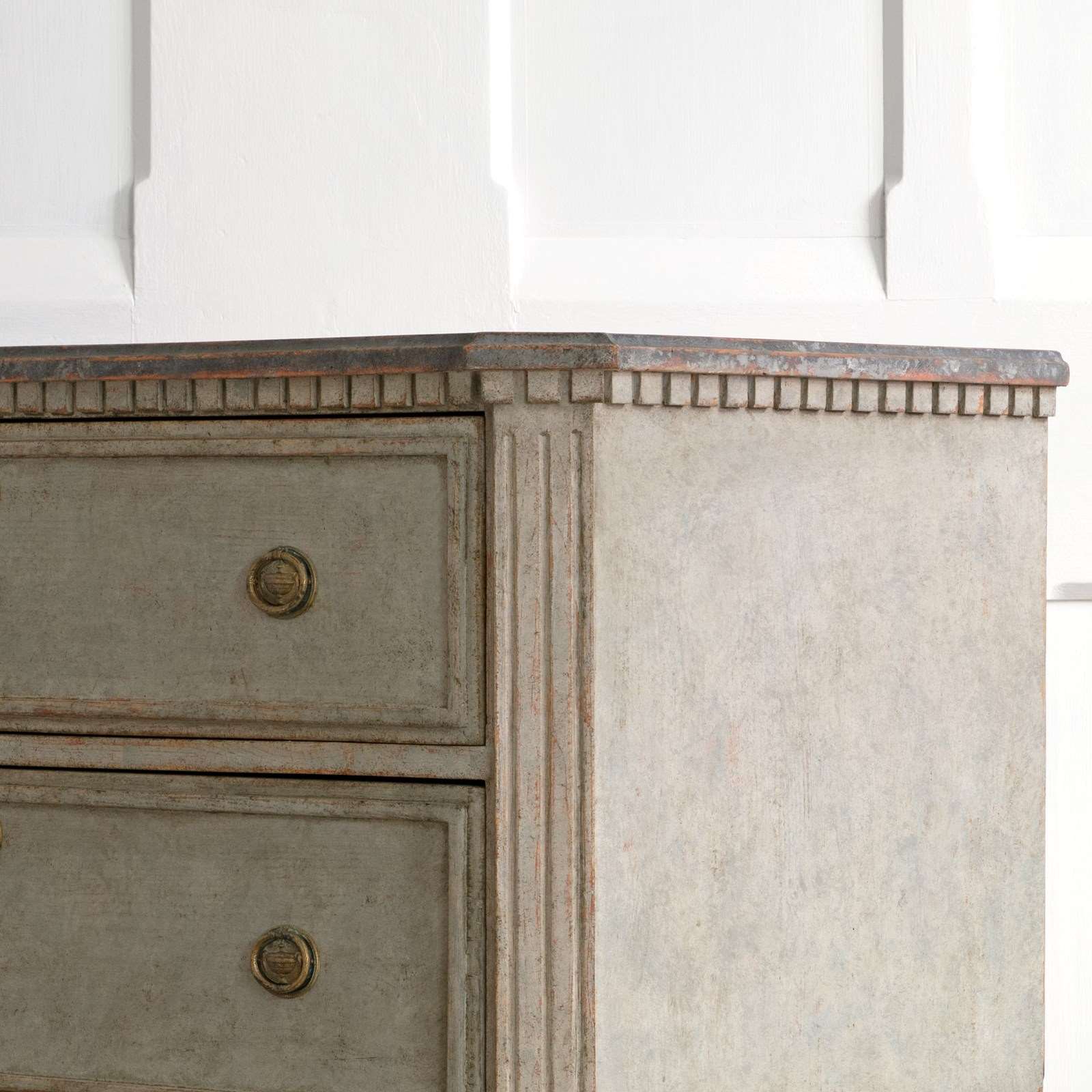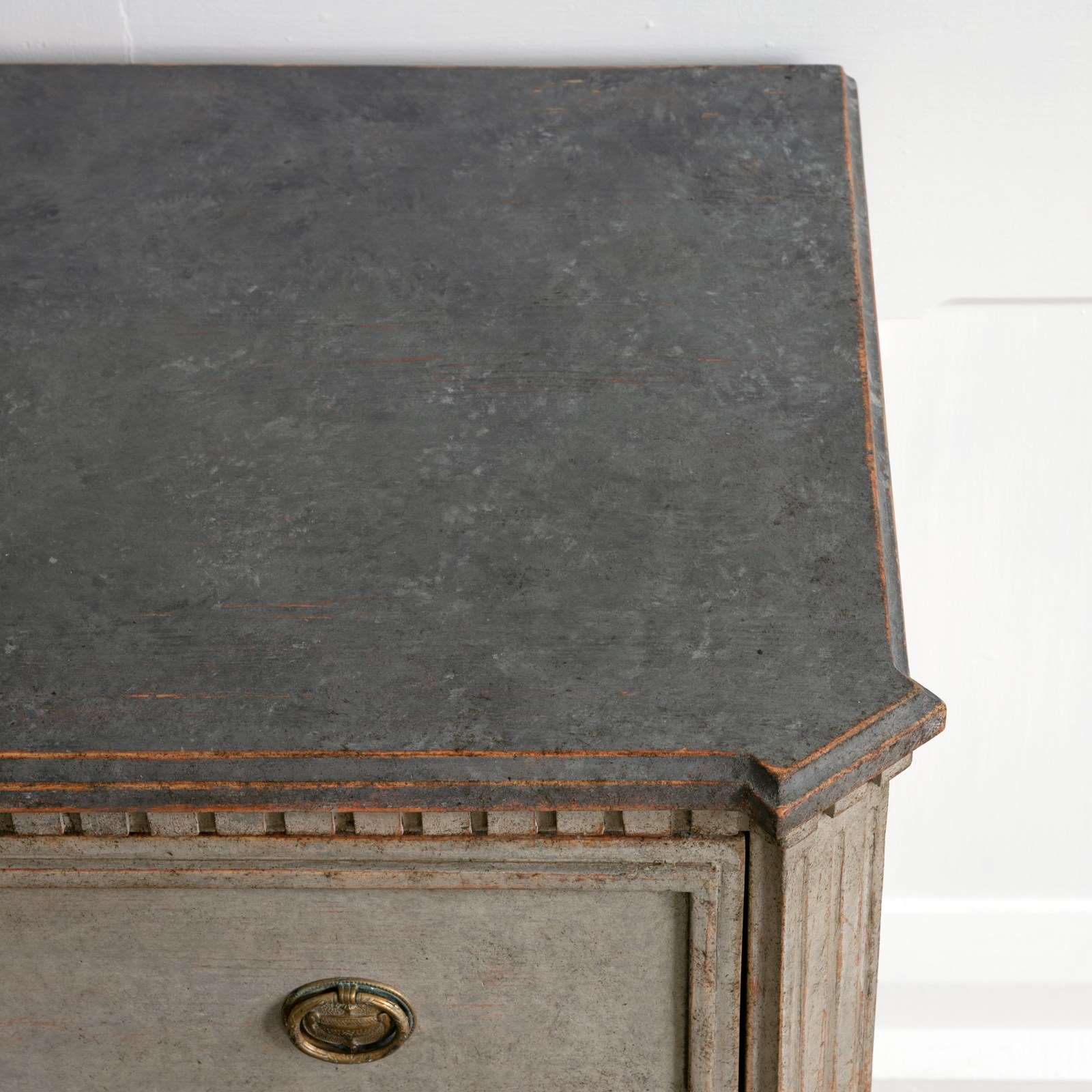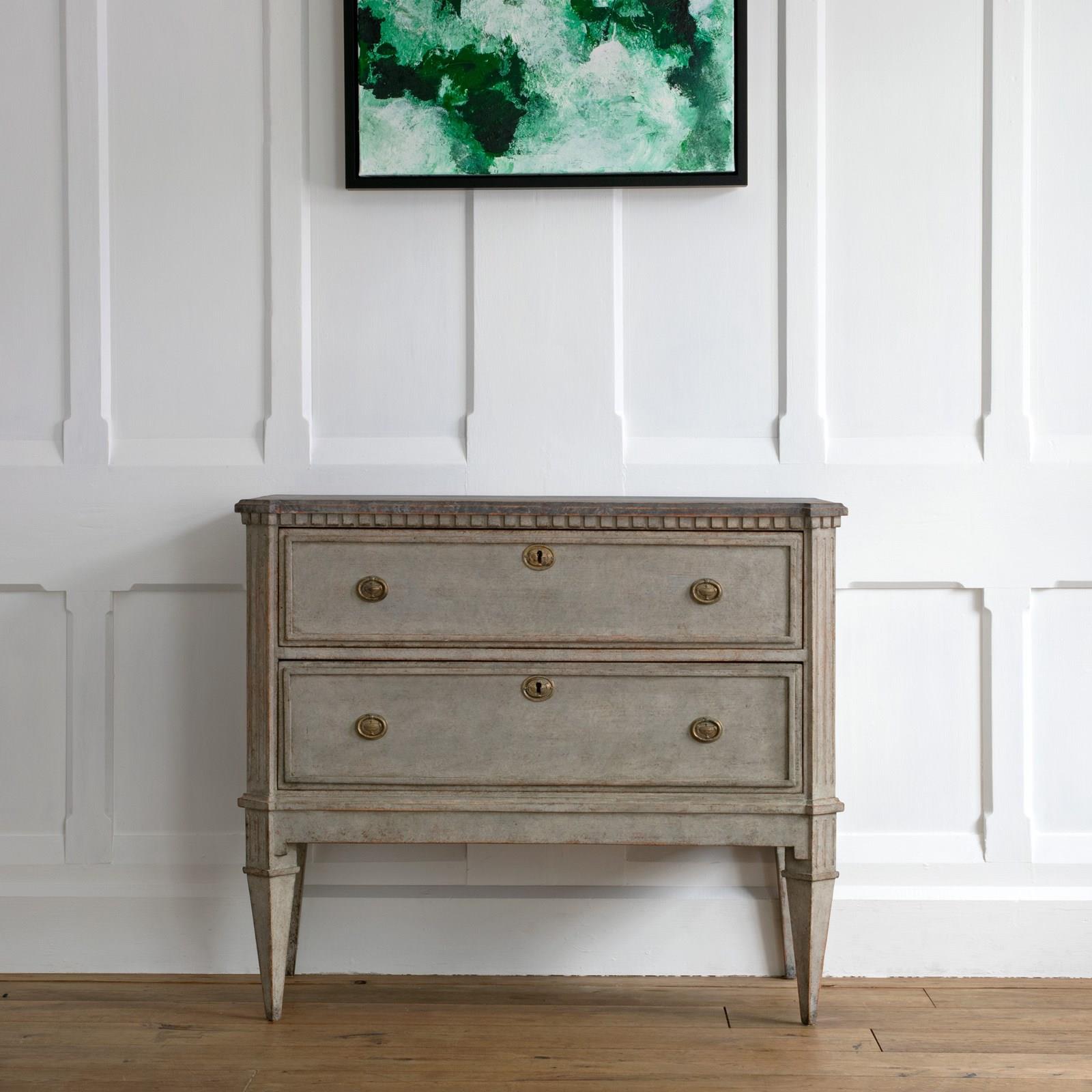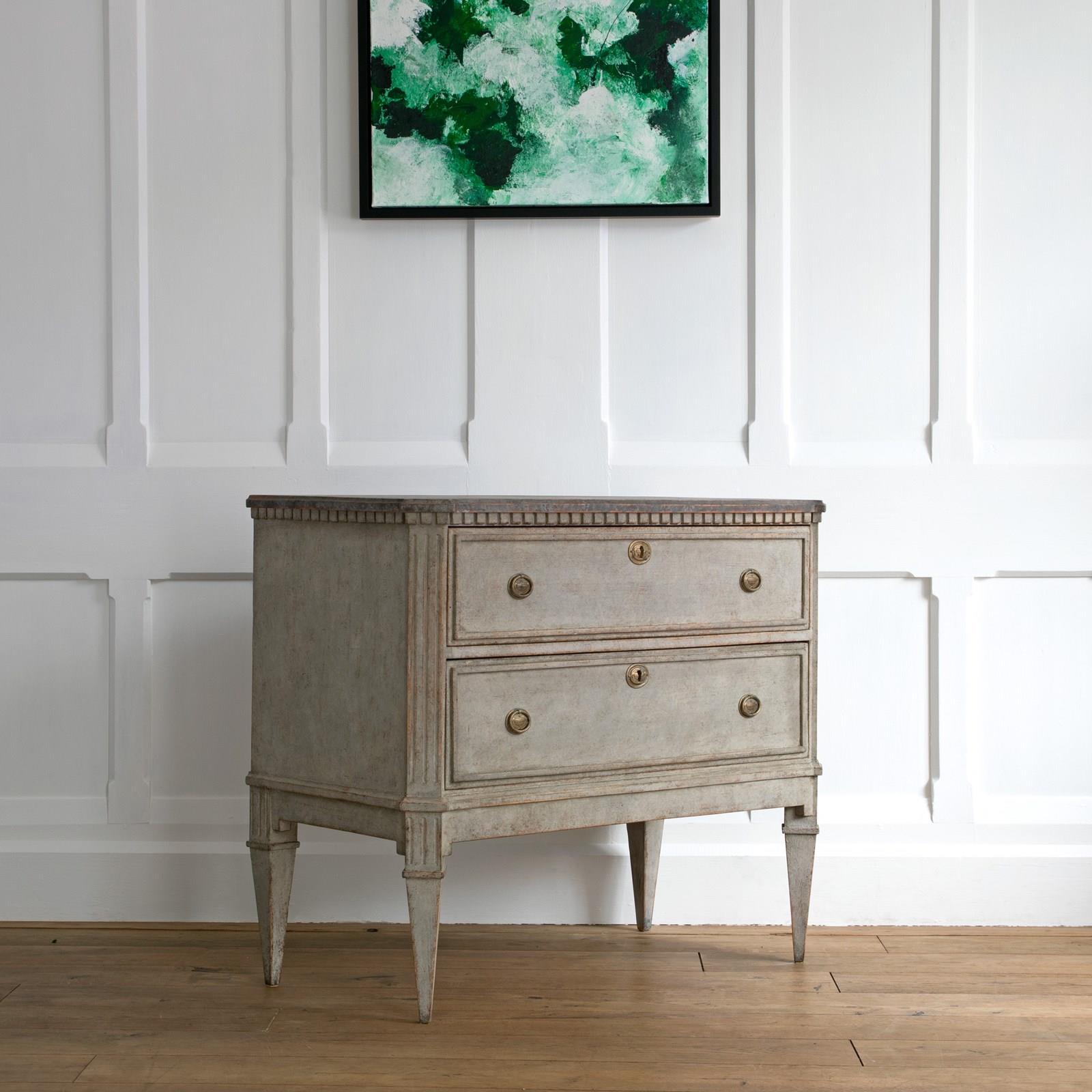 A handsome pair of restored 19th century Gustavian style chests with a beautiful multifaceted grey patina and classic Swedish faux painted stone tops. Featuring canted & triple fluted front corners, a dentil frieze border over two drawers with raised profile borders, and raised on elegant square tapered & fluted feet. Swedish circa 1860 to 1870.
