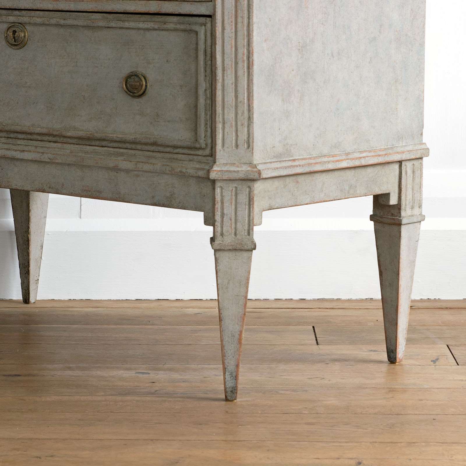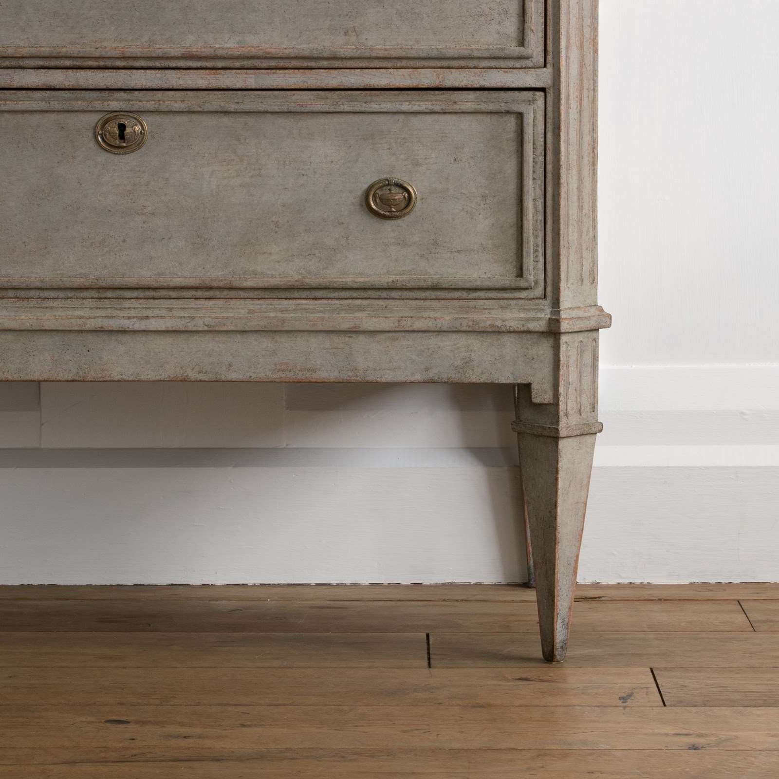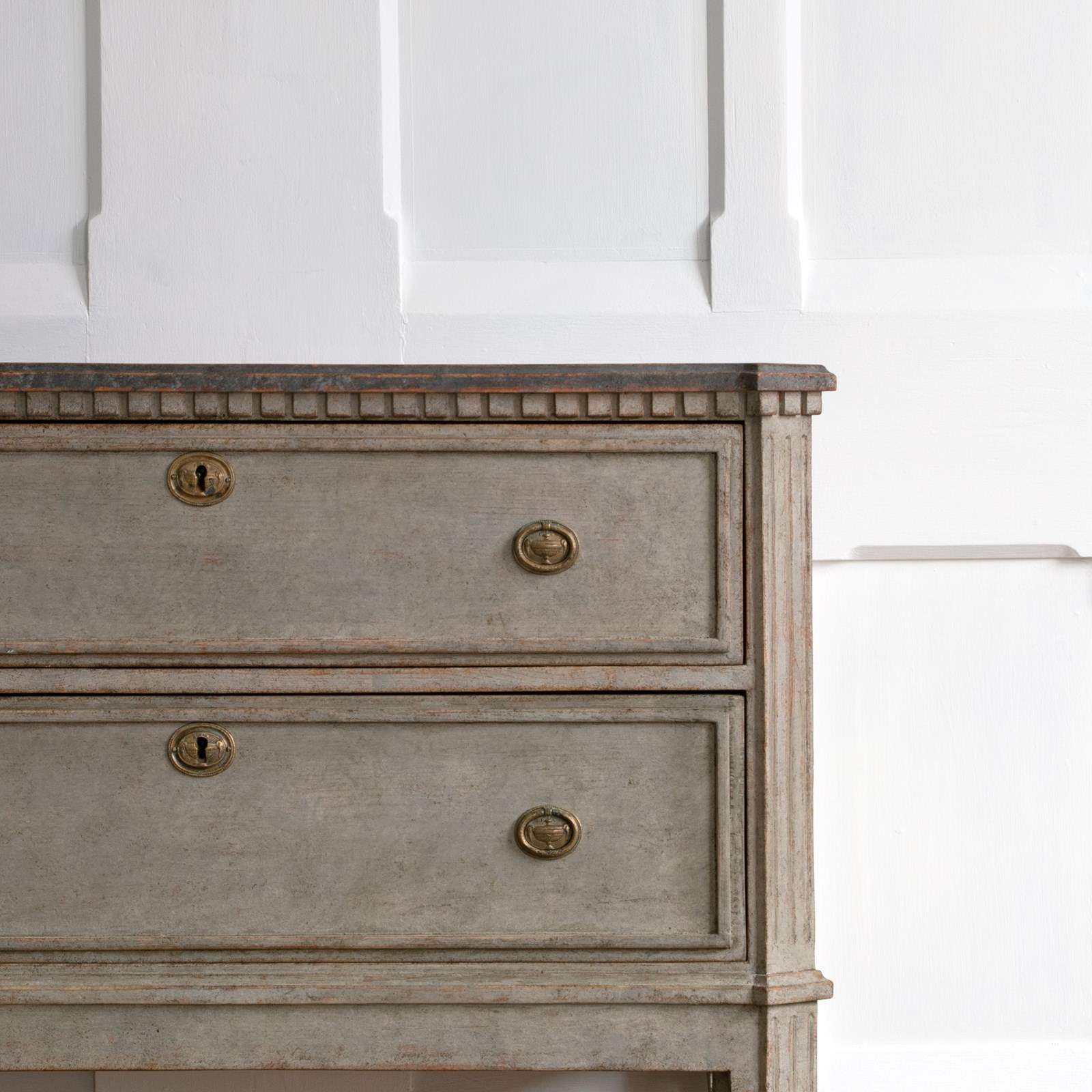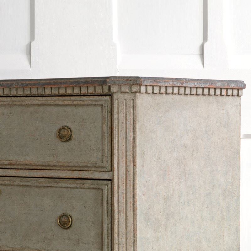 A handsome pair of restored 19th century Gustavian style chests with a beautiful multifaceted grey patina and classic Swedish faux painted stone tops. Featuring canted & triple fluted front corners, a dentil frieze border over two drawers with raised profile borders, and raised on elegant square tapered & fluted feet. Swedish circa 1860 to 1870.