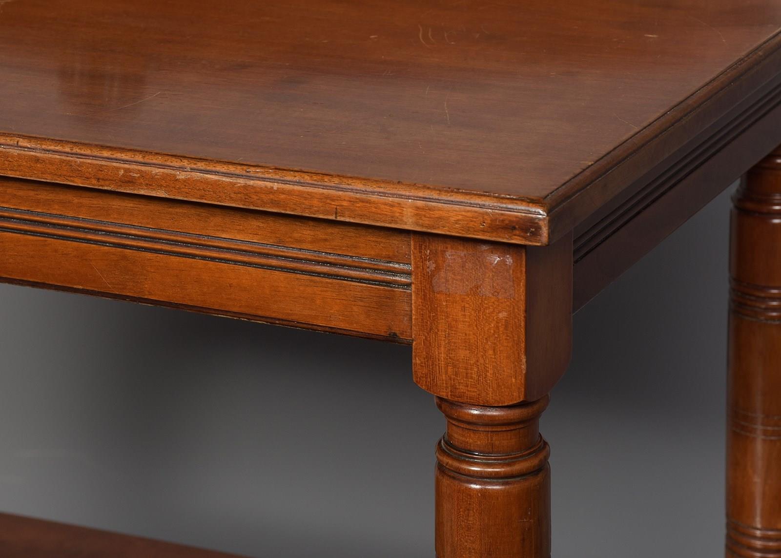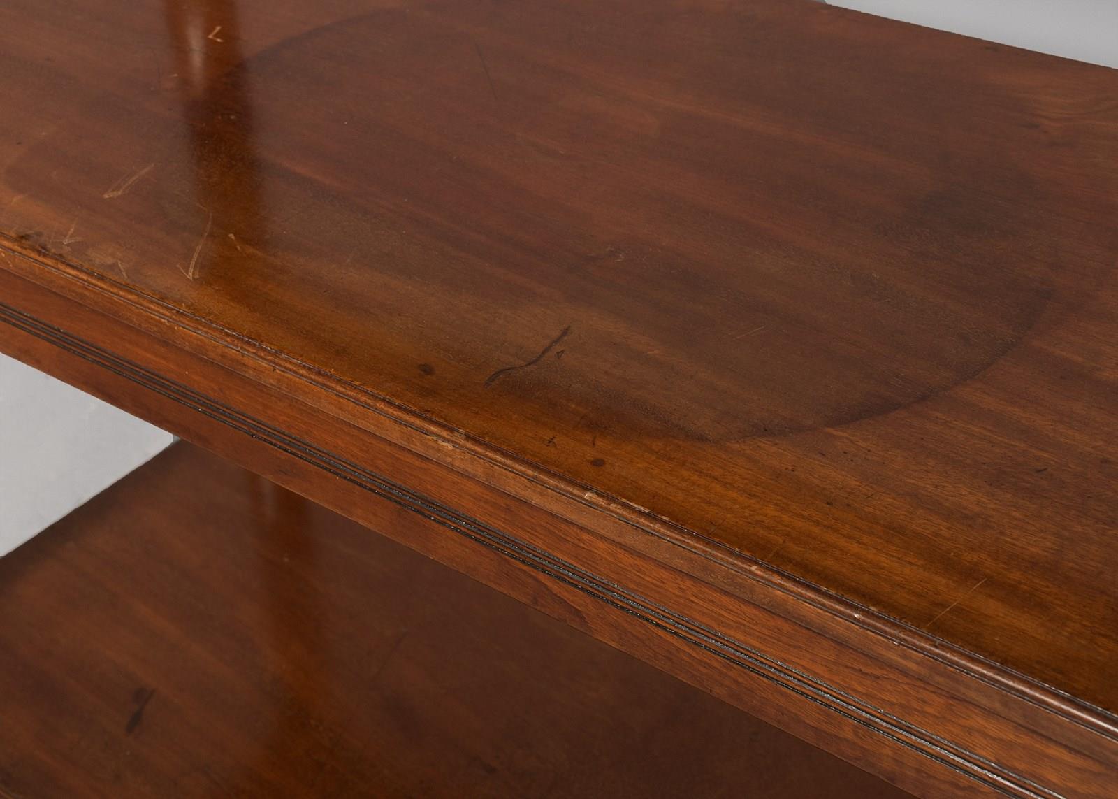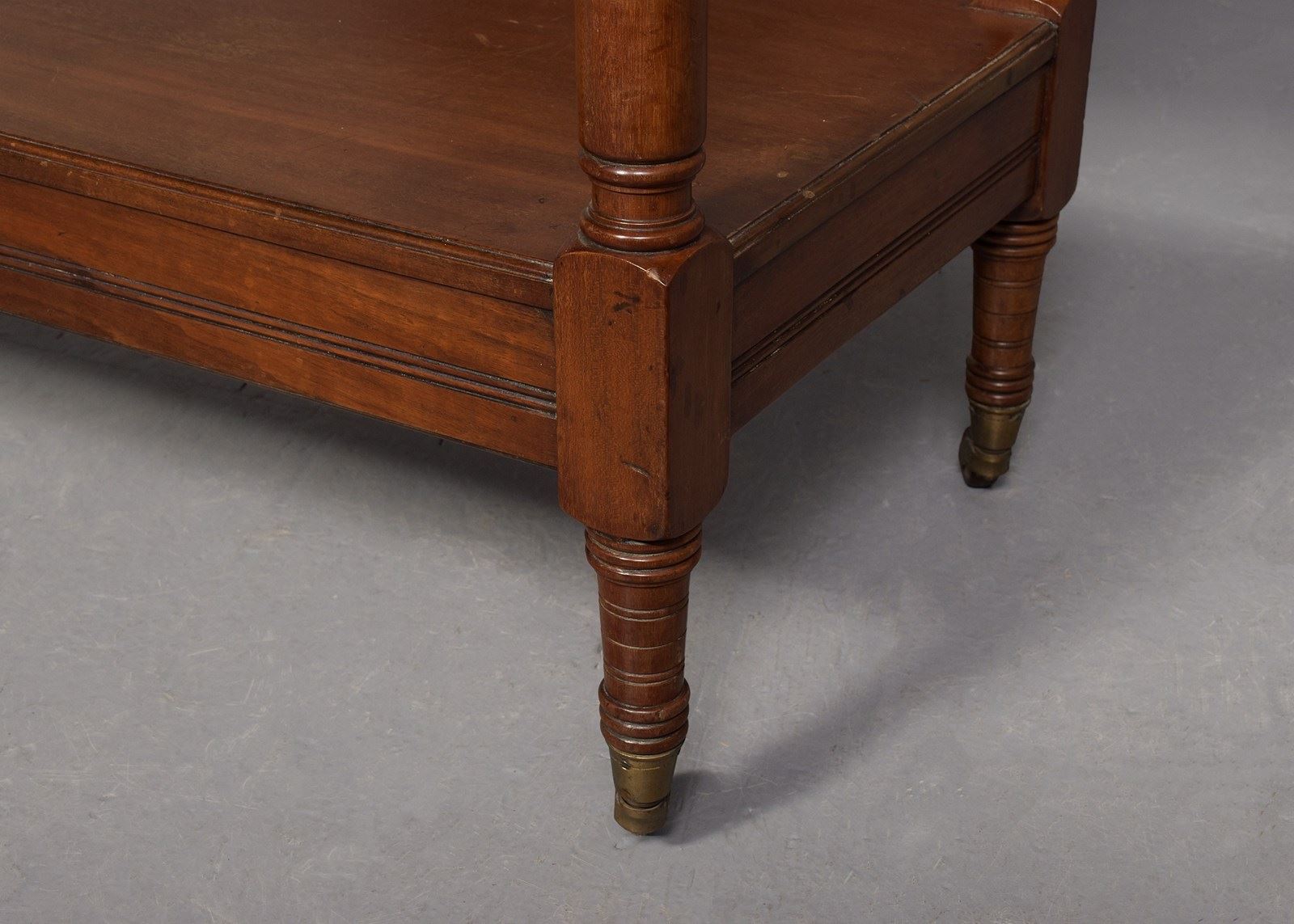 Circa 1880. Large, late Victorian three-tier walnut buffet/whatnot. Surmounted by a simple Arts and Crafts back above three tiers above simple fluted rails and supported on ring-turned supports above tapering turned feet with brass caps and brown porcelain castors. In perfect condition, lovely colour and patina.