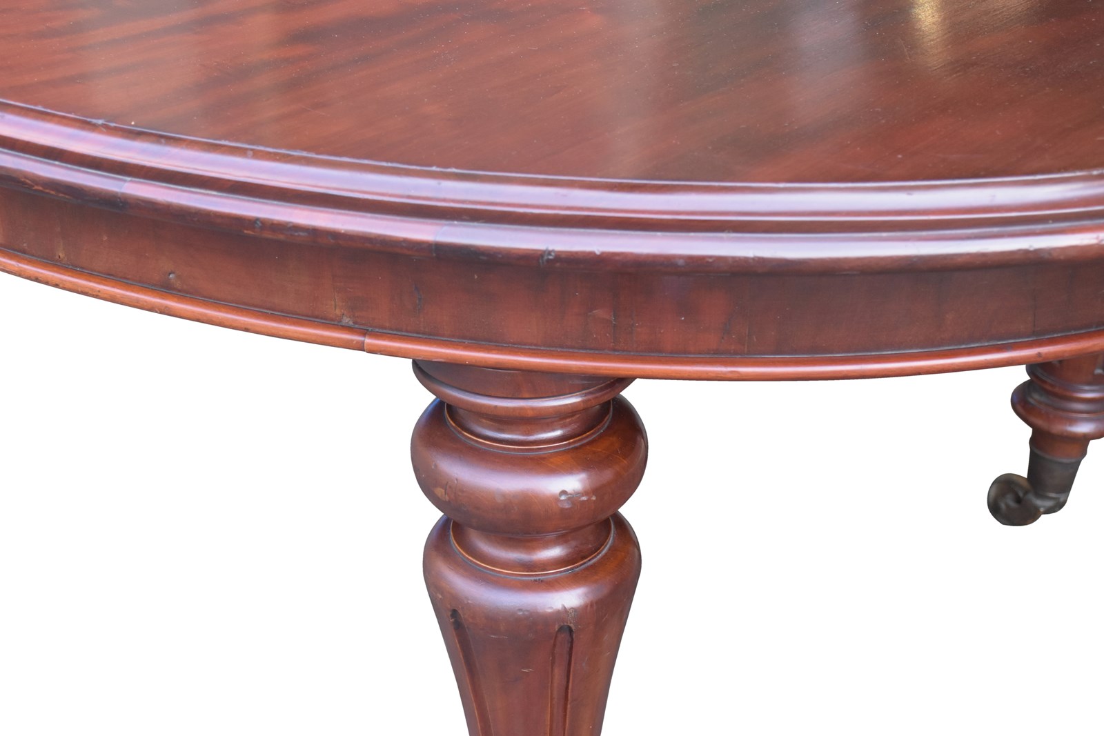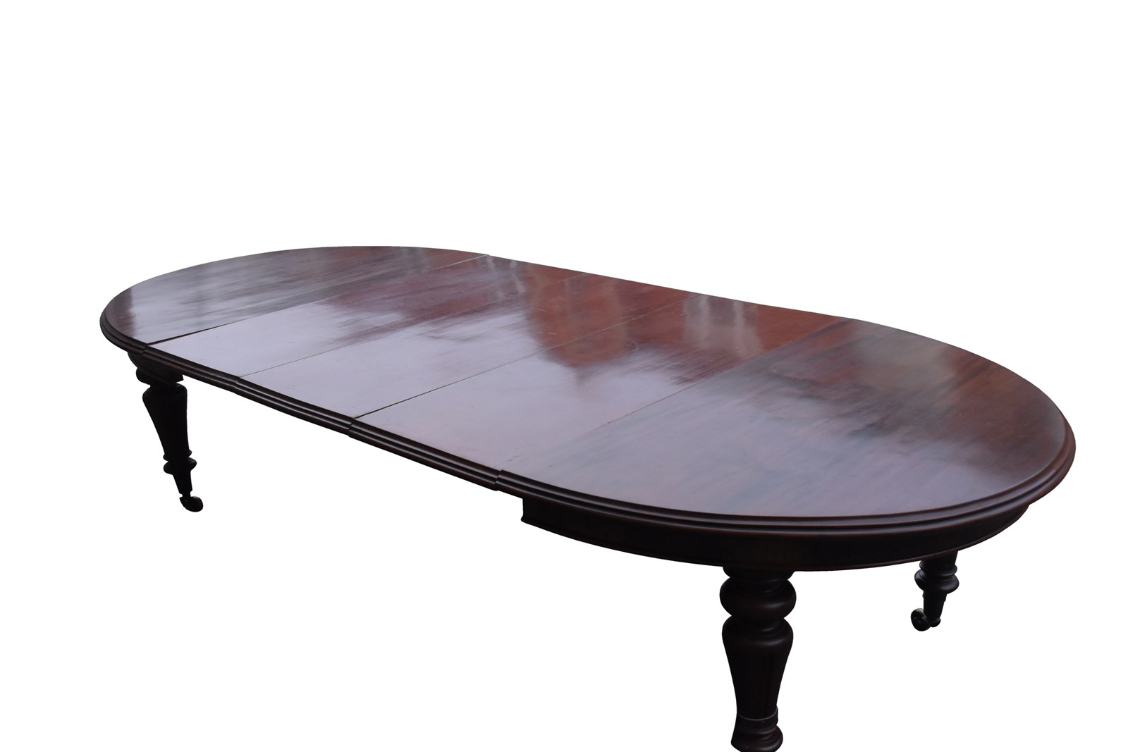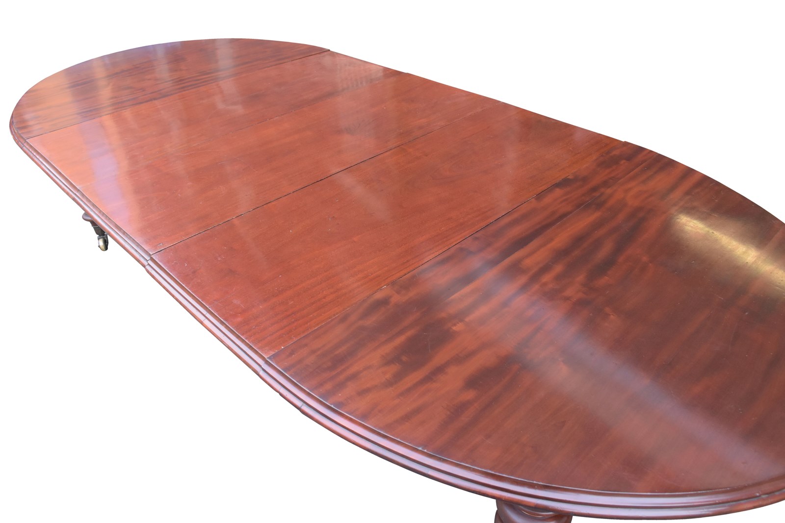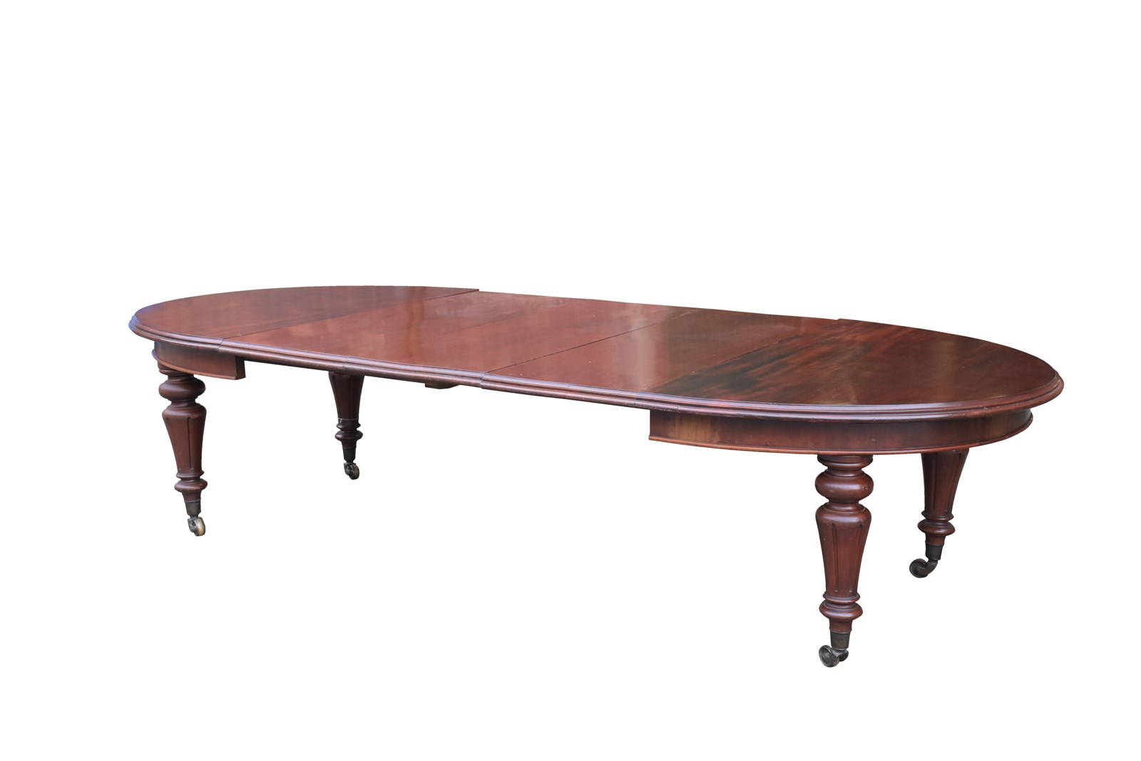 Circa 1840. Outstanding quality original William 1V extending mahogany table and three original leaves. The oval top and leaves in a beautifully figured Spanish mahogany with a rich deep colour, and great patina and with a moulded rim above a crossbanded and beaded frieze. Supported on tapering, fluted vasiform legs on original large brass caps and castors. Exceptional quality and in excellent condition