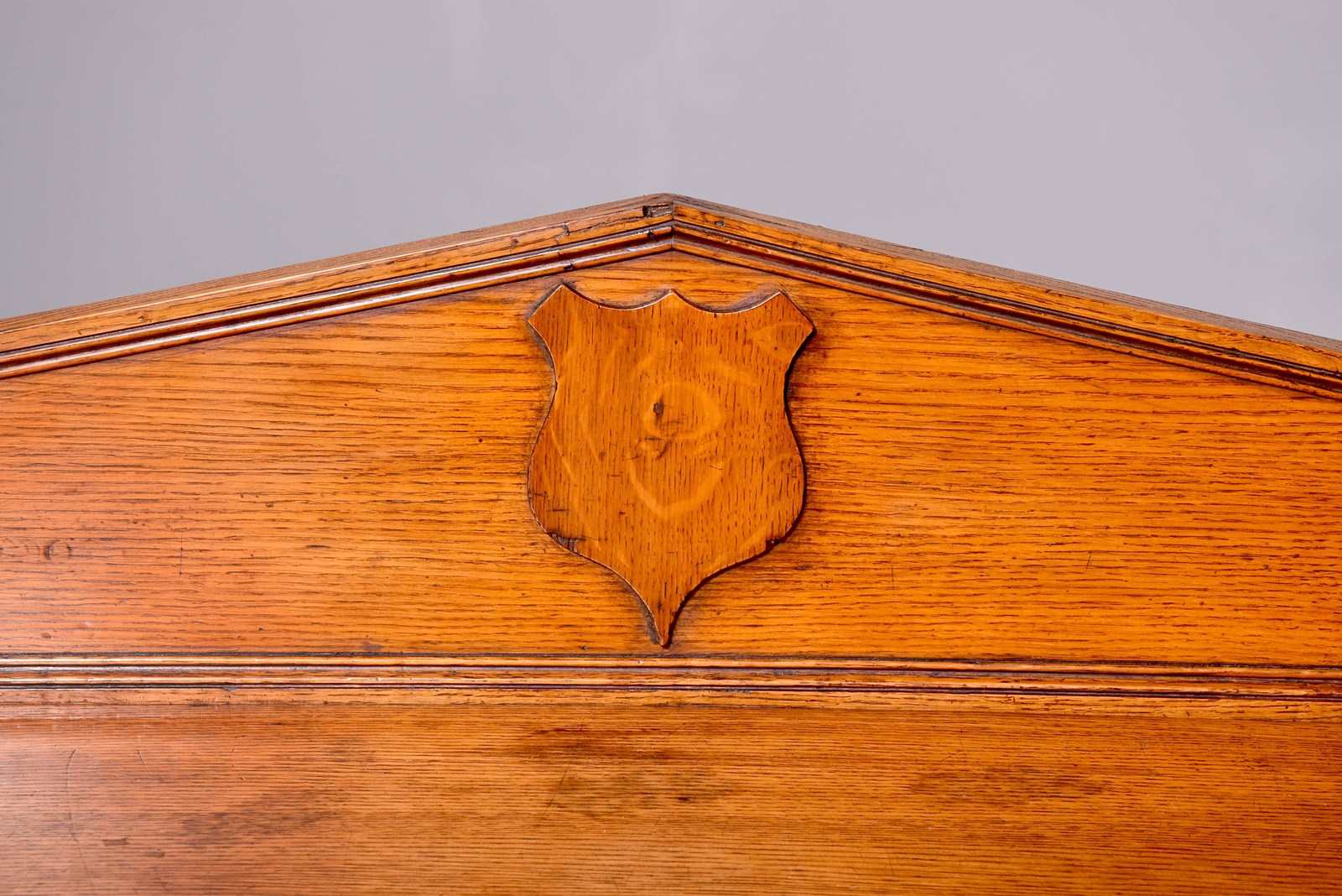 Circa 1835.A large oak William IV serving table, with solid top with a moulded fore-edge and an architectural back ledge with a carved heraldic shield in the center. The frieze with a similar heraldic shield with two elongated lozenge shapes each side, with turned back legs, the front with cabriole legs headed with heraldic shields, with foliate carving on the knees with large rondels to the sides, finishing on a curved toe with a large bulbous foot beneath.