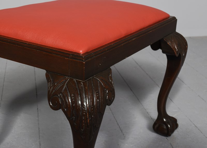 Circa 1890. Quality 19th century Georgian-style carved mahogany cabriole leg stool. The lift-out seat recently reupholstered in quality burgundy hide, within a simple seat rail and supported on bold cabriole legs with acanthus carved knees and ball and claw feet.