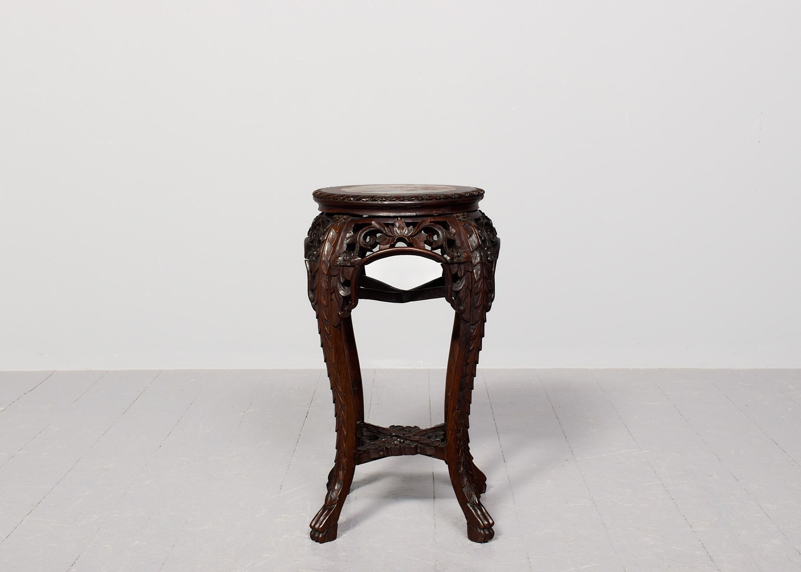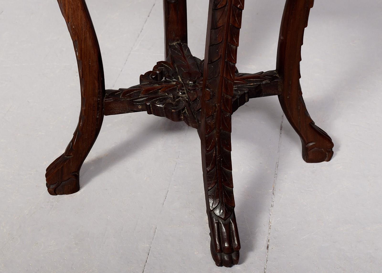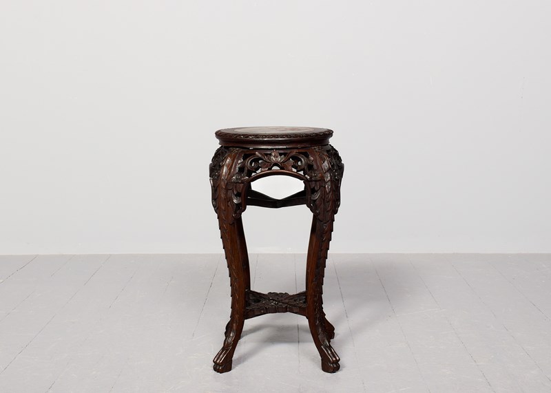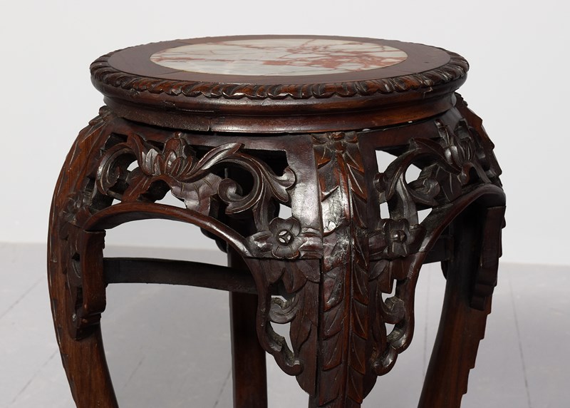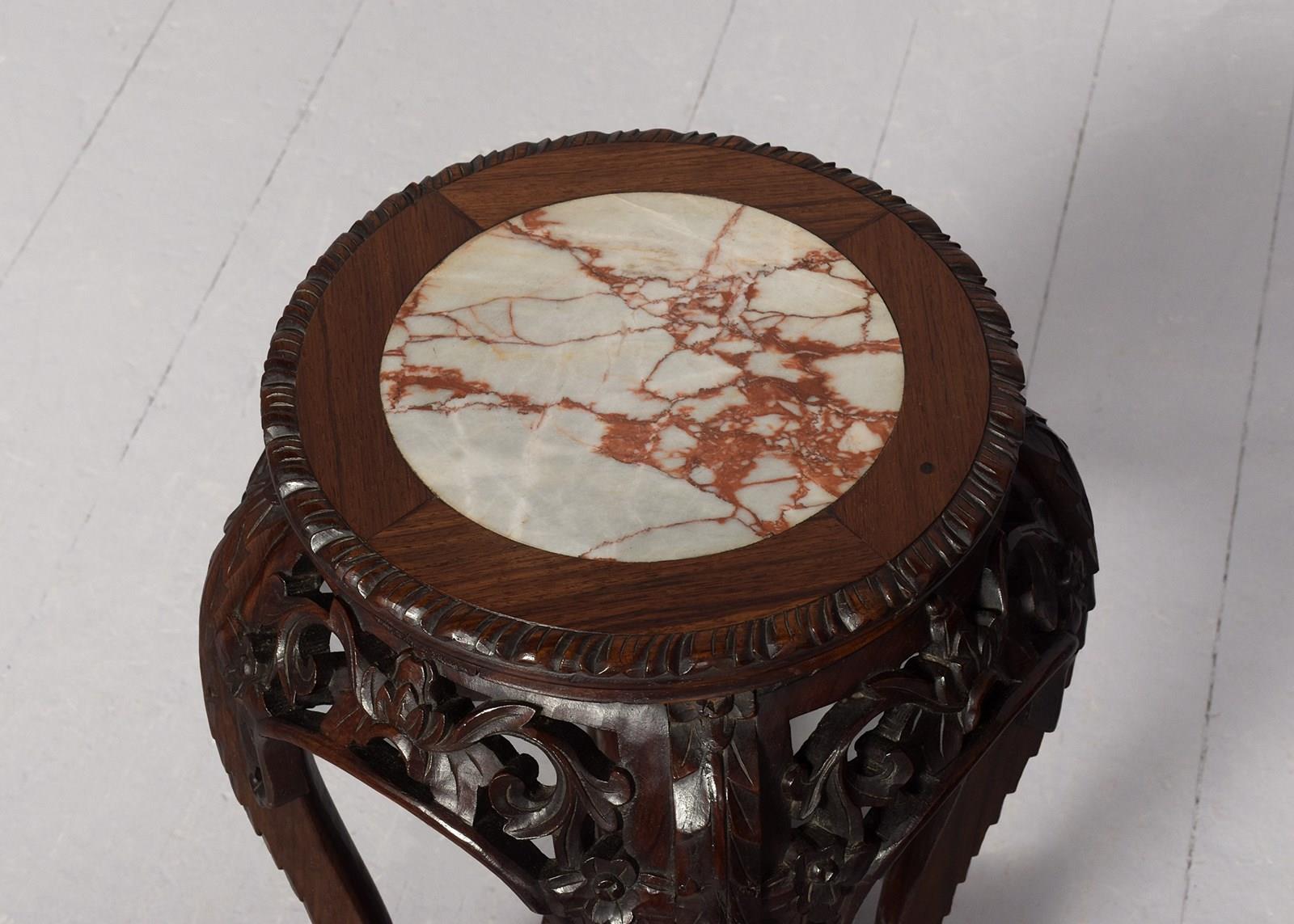 Circa 1890. Quality late 19th-century Qing dynasty Hongmu Marble Top Plantstand. The circular top with fluted edges and a grey and burgundy flecked marble inset over an open, foliate-carved frieze. Supported on foliate carved cabriole legs with a lower fretted stretcher. In excellent order.