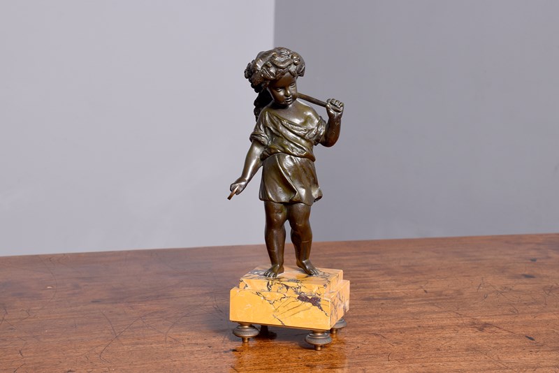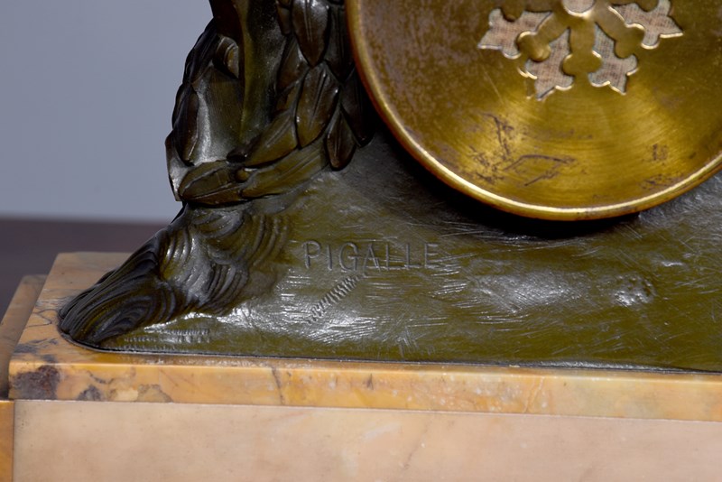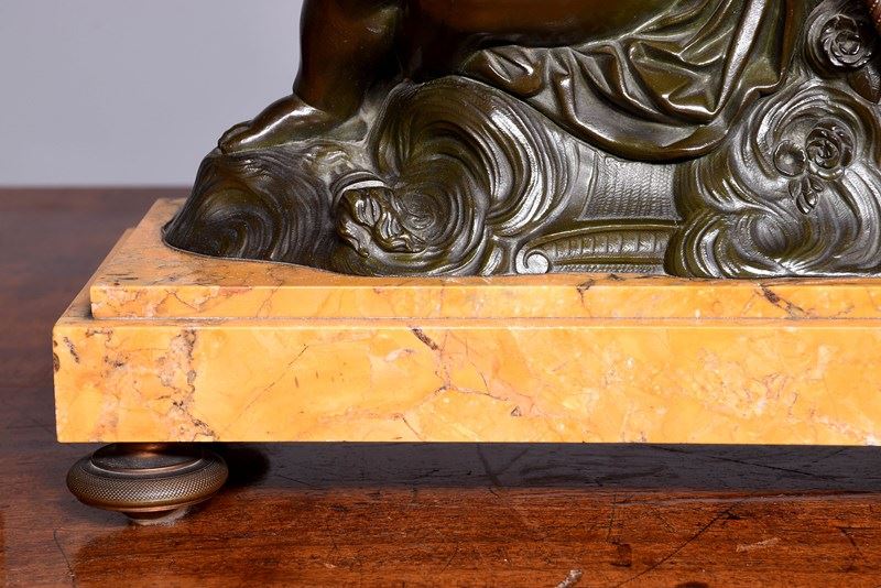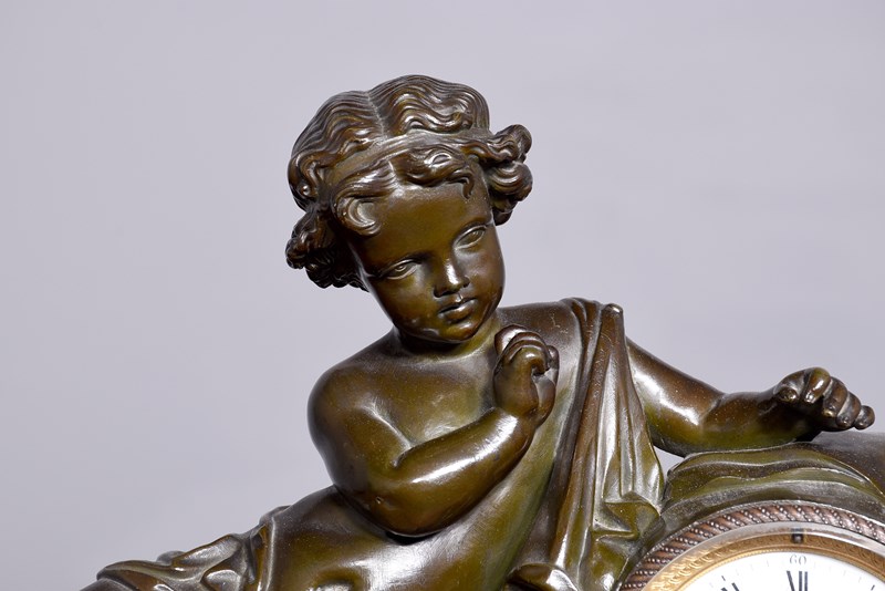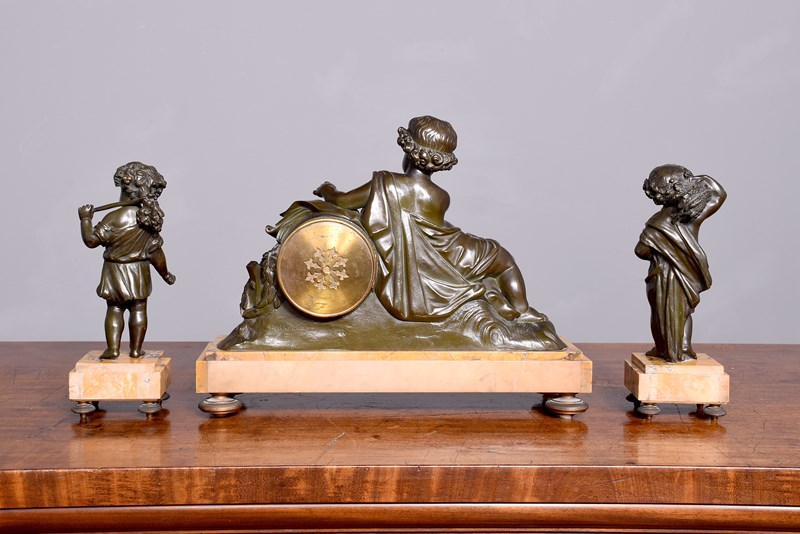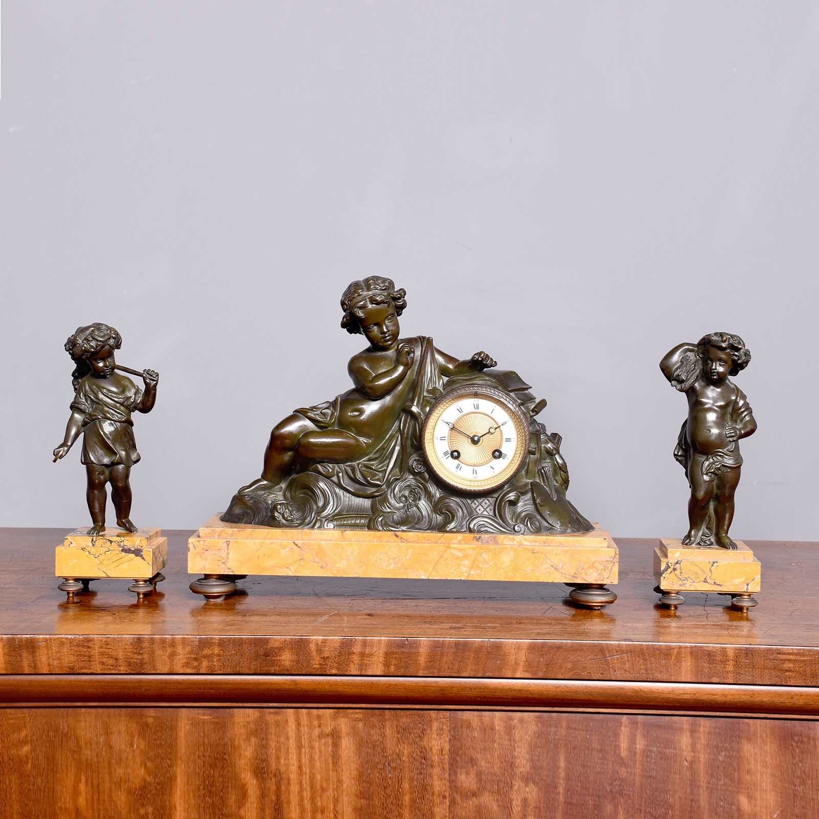 Circa 1880. A stylish French and marble clock garniture, with a stylish circular dial with Roman numerals, the spring driven twin tray movement striking on a bell and stamped ‘Samuel Marti’ contained in a bronze case modelled with reclining putti, engraved to the rear ‘Pigalle’, raised on a variegated marble base with adjustable feet together with a pair of putti, resting on similar marble bases.