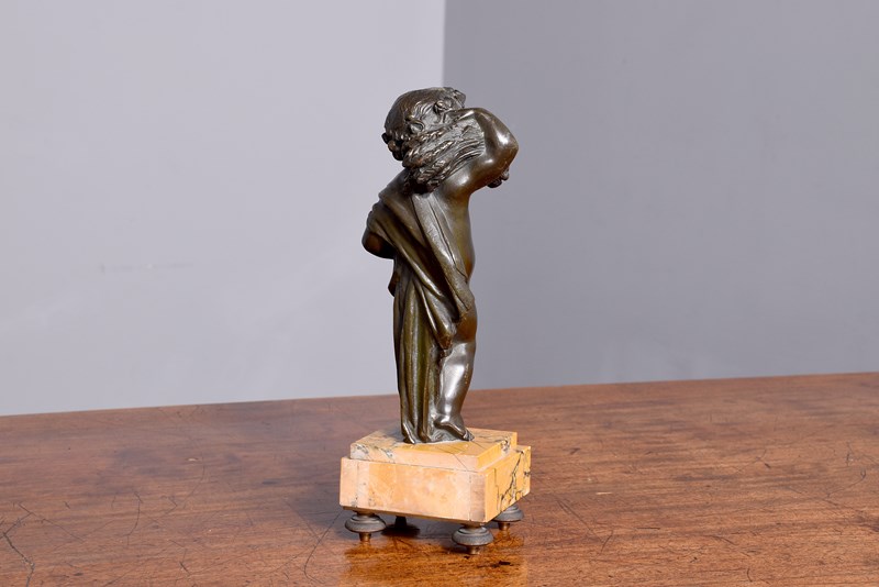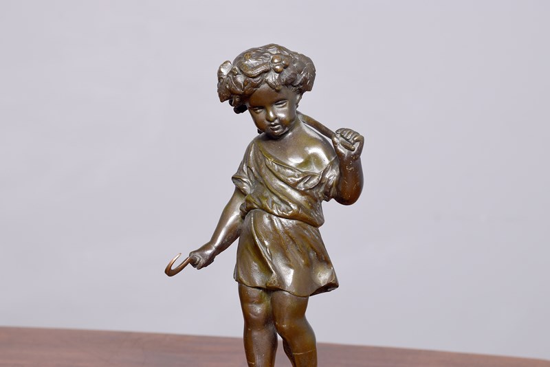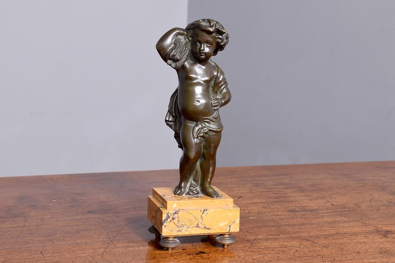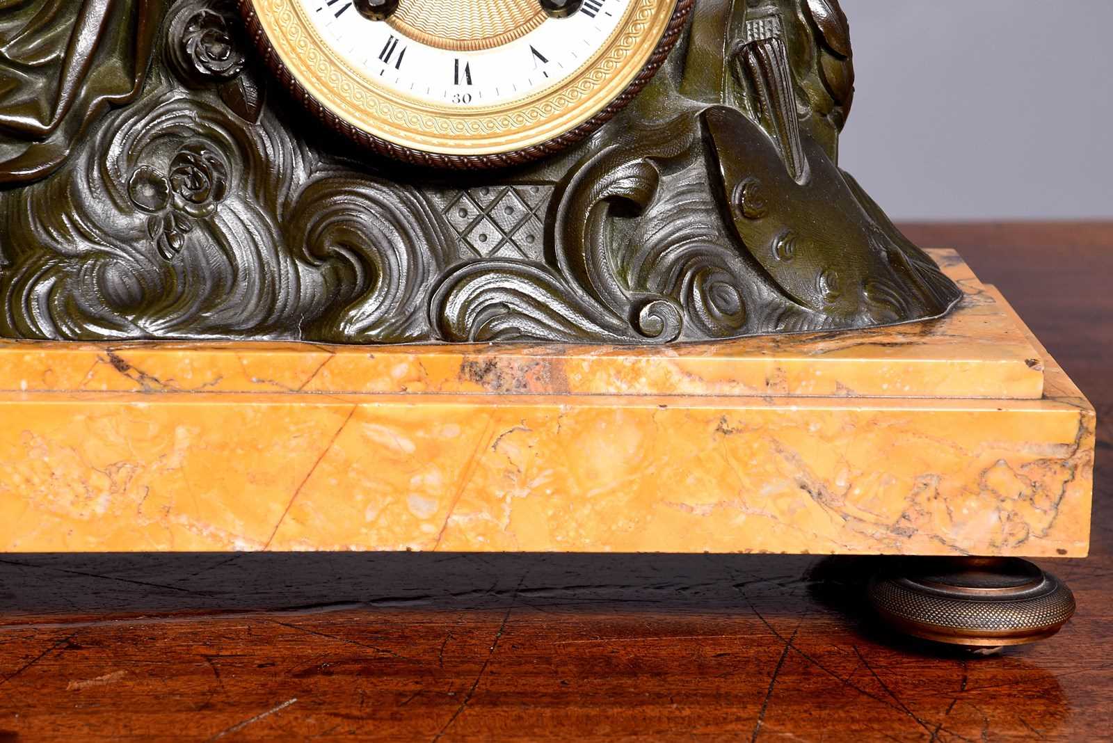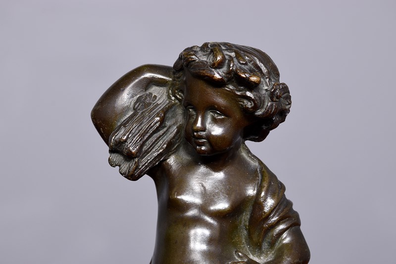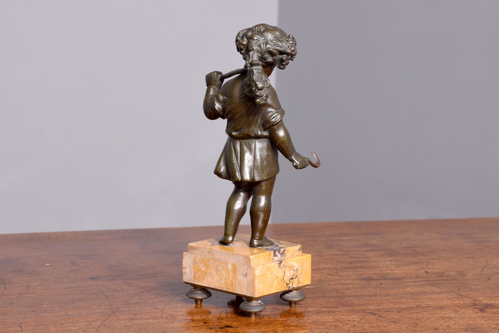 Circa 1880. A stylish French and marble clock garniture, with a stylish circular dial with Roman numerals, the spring driven twin tray movement striking on a bell and stamped ‘Samuel Marti’ contained in a bronze case modelled with reclining putti, engraved to the rear ‘Pigalle’, raised on a variegated marble base with adjustable feet together with a pair of putti, resting on similar marble bases.