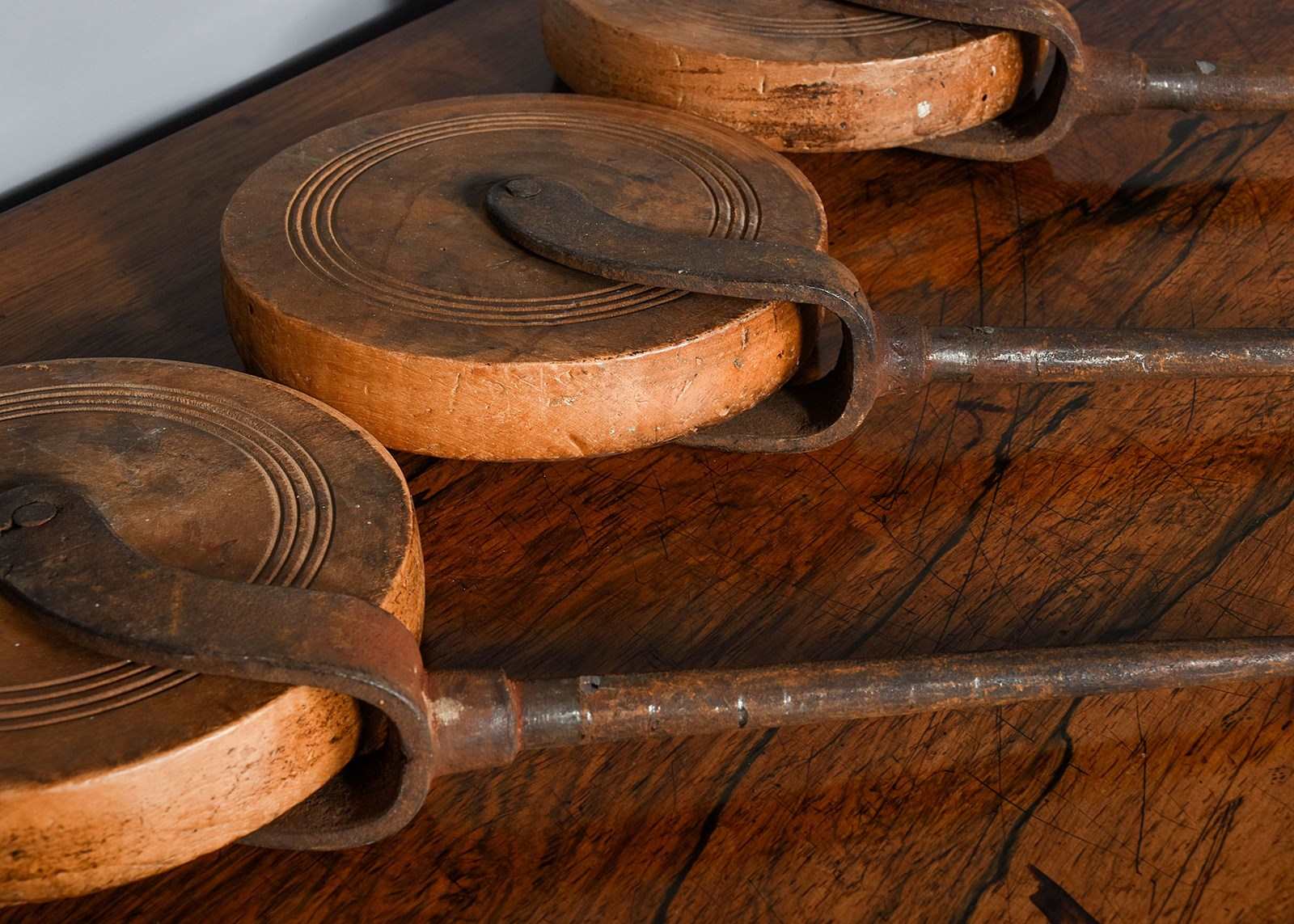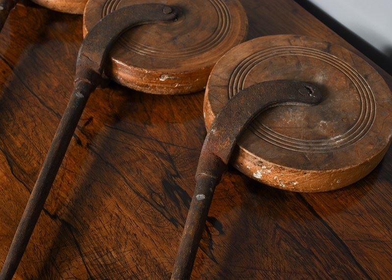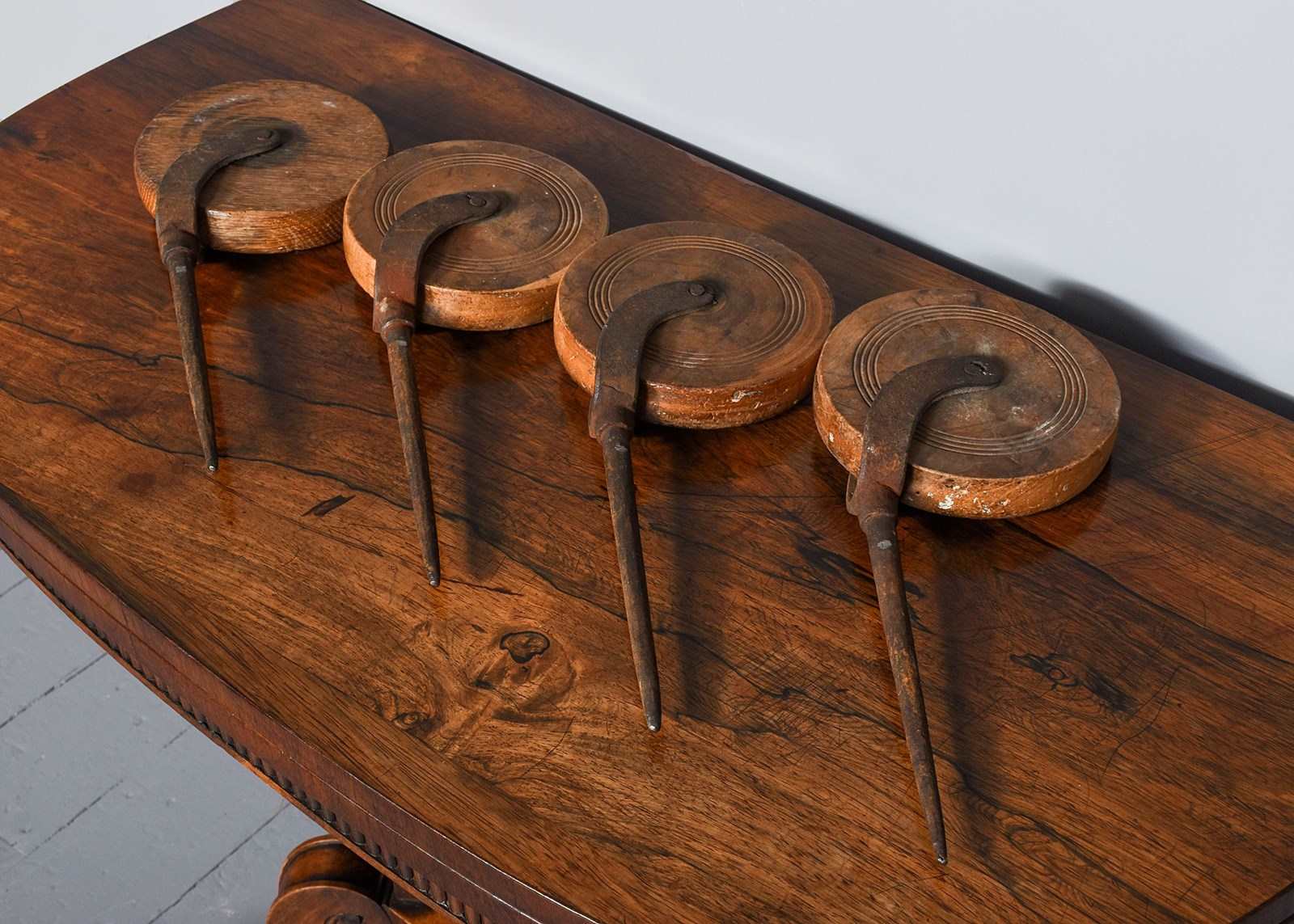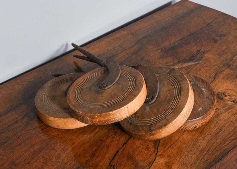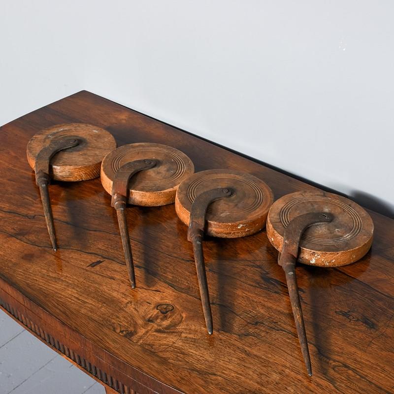 Circa 1820. A set of four wood and steel wheels, made in fruitwood and oak are on blacksmith-made braced supports with an extended spike. Could be incorporated into a coffee table or side table.