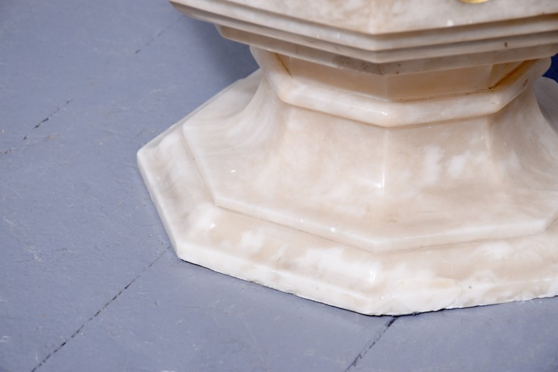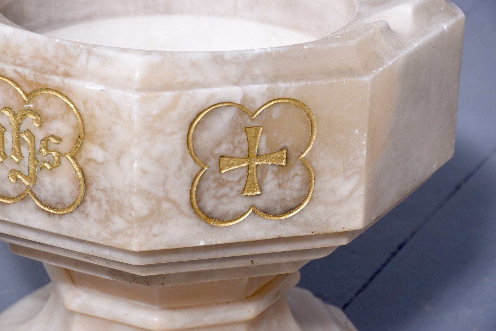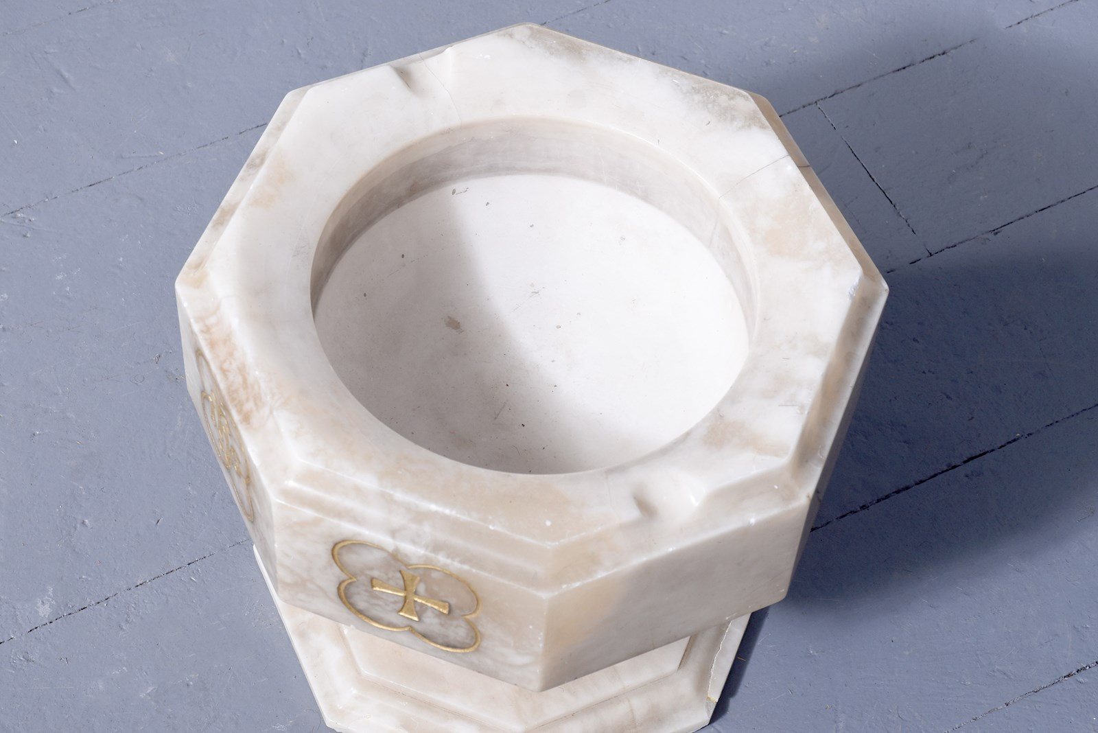 Circa 1920. A stylish carved alabaster font, the octagonal shaped body with a raised sloping fore-edge hollowed to the centre, three of the faces are carved and gilded, supported on a faceted stem, resting on a flat base with moulded edge. Could be used for keys or fruit.