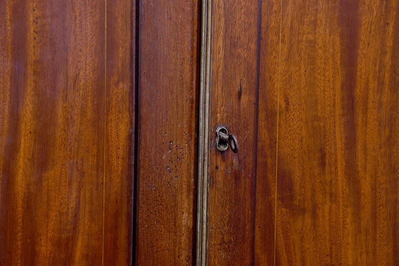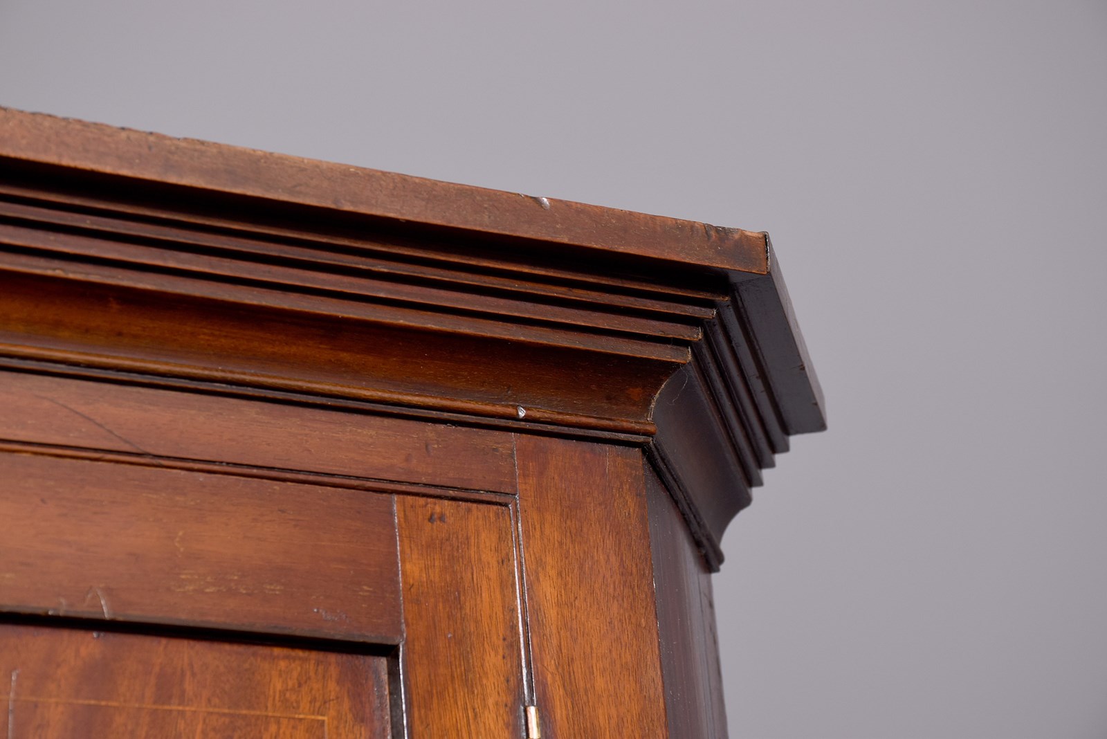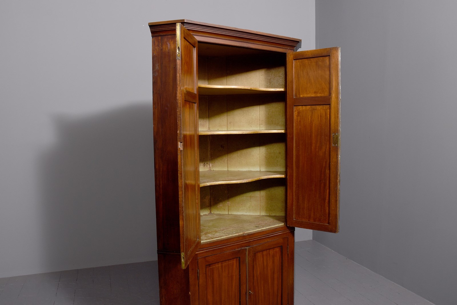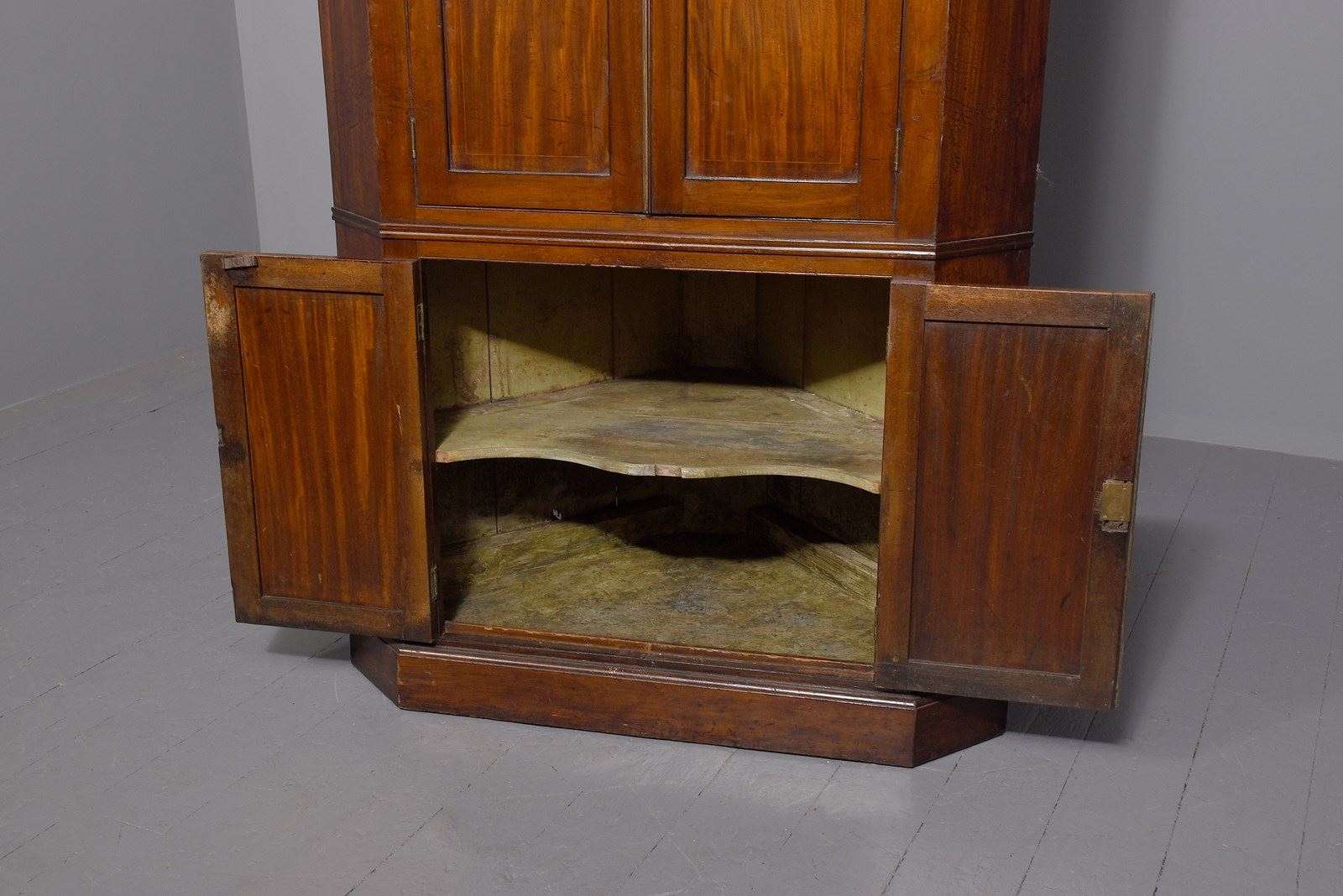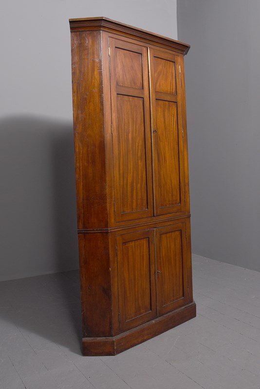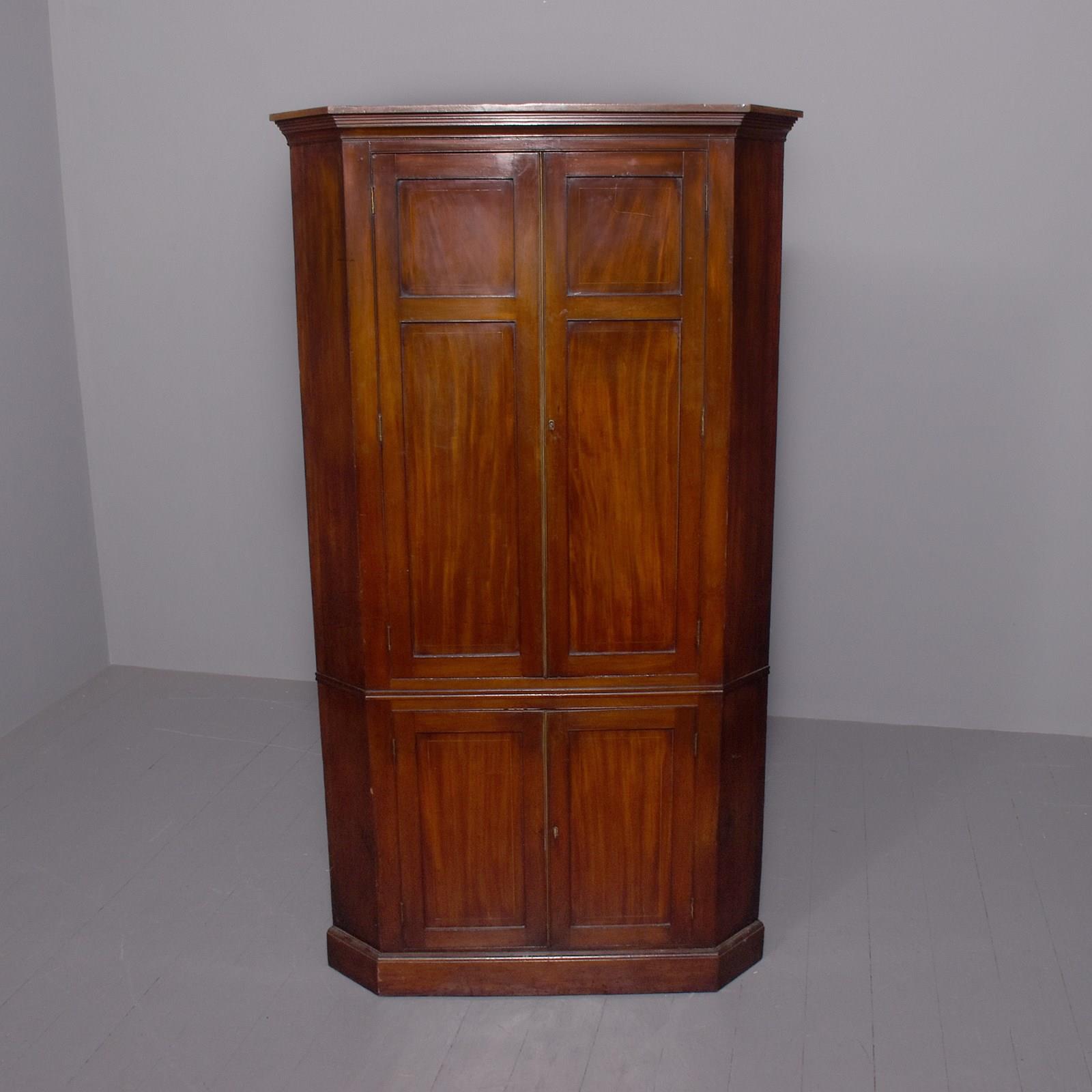 Circa 1800. A late George III double mahogany and inlaid corner cupboard, the top with a stylish moulding with a ribbed section beneath, the front with a pair of double panel doors each with boxwood inlay, and brass ribbed beading with original lock and key, inside with three fixed, shaped and painted shelves, the base section has a pair of shorter doors with single panels with a shaped shelf inside, with chamfered sides with a beading separating the top from the base, all resting on an enclosed mahogany plinth which follows the form of the top.