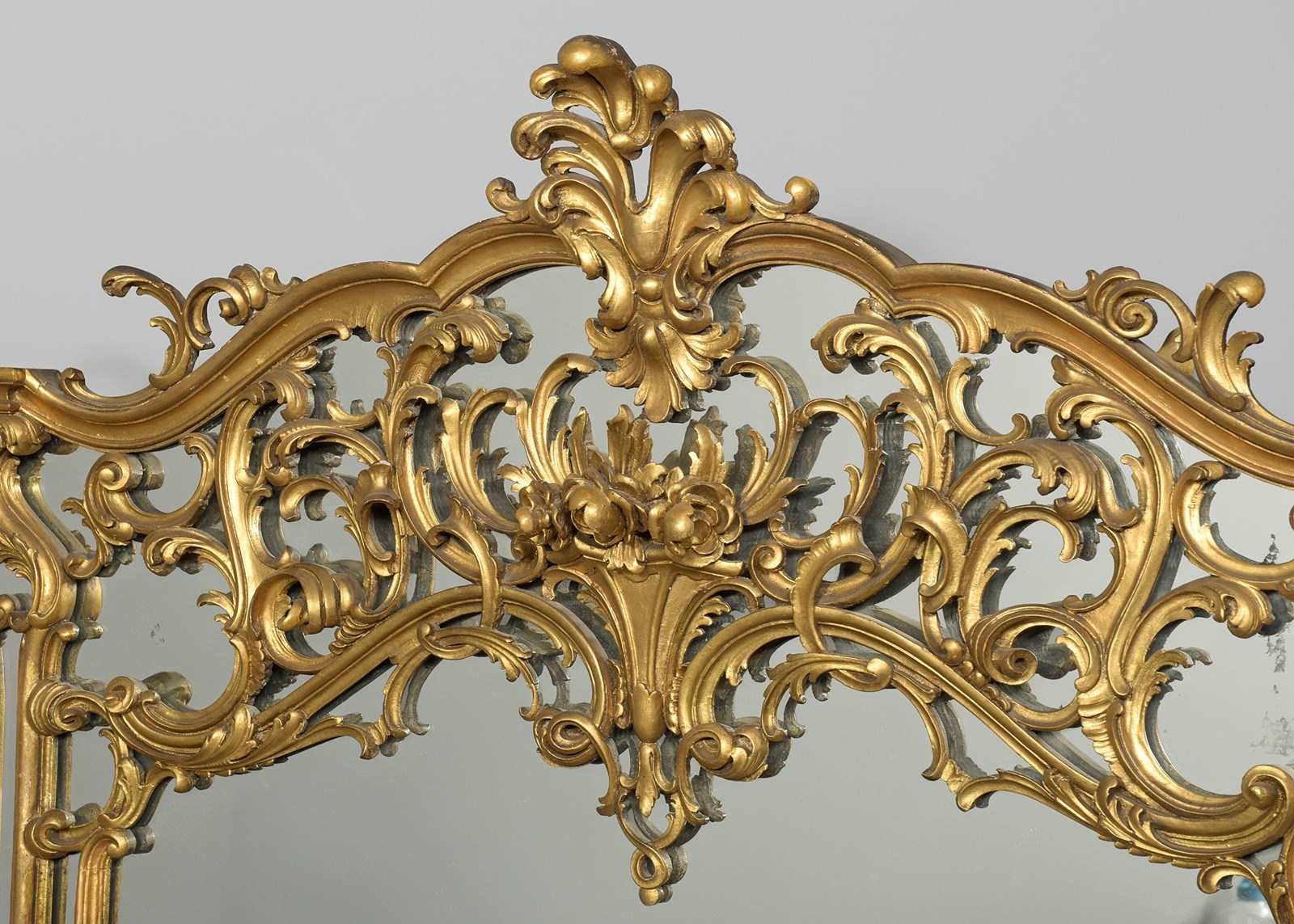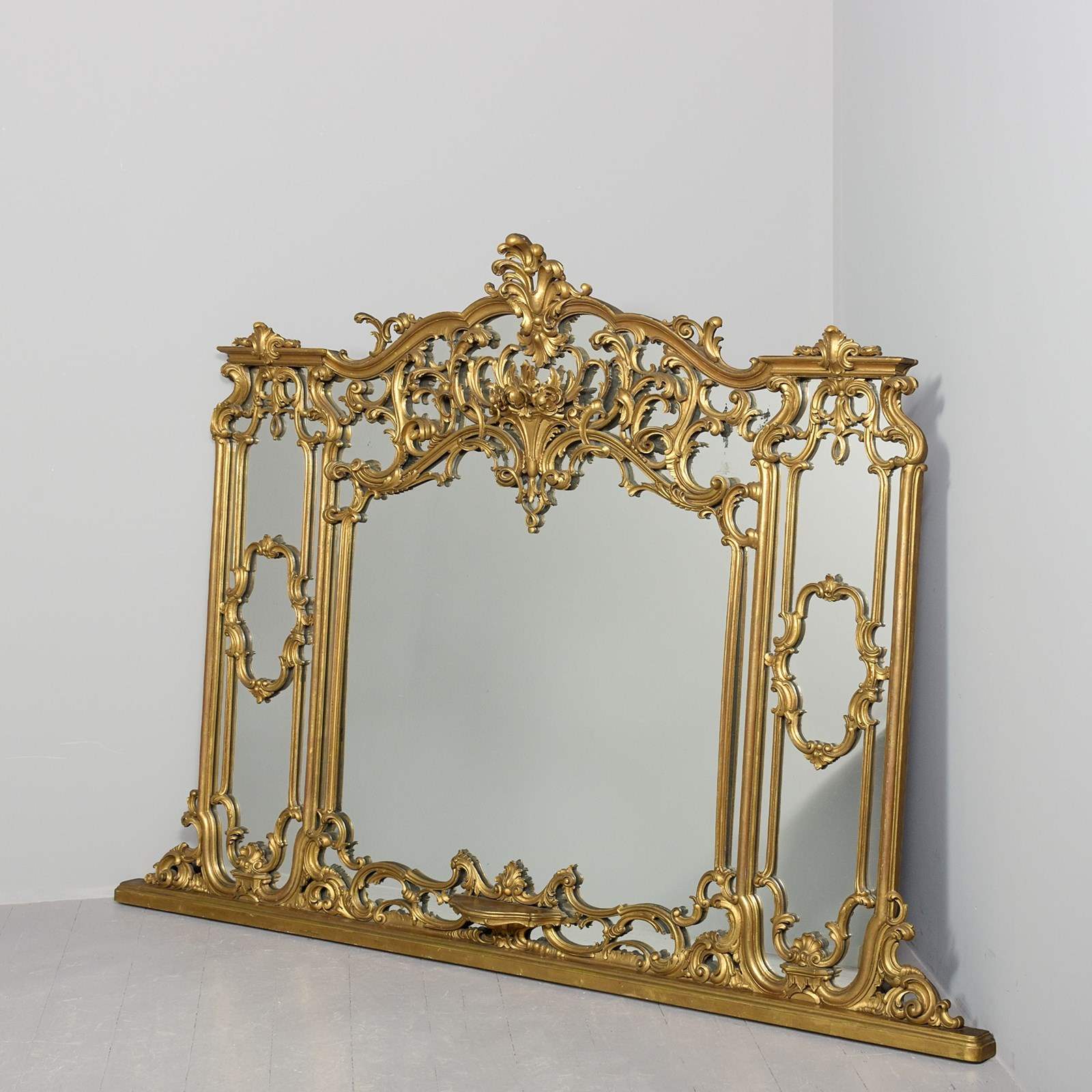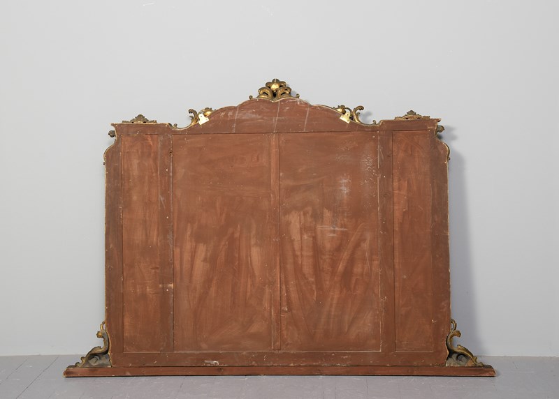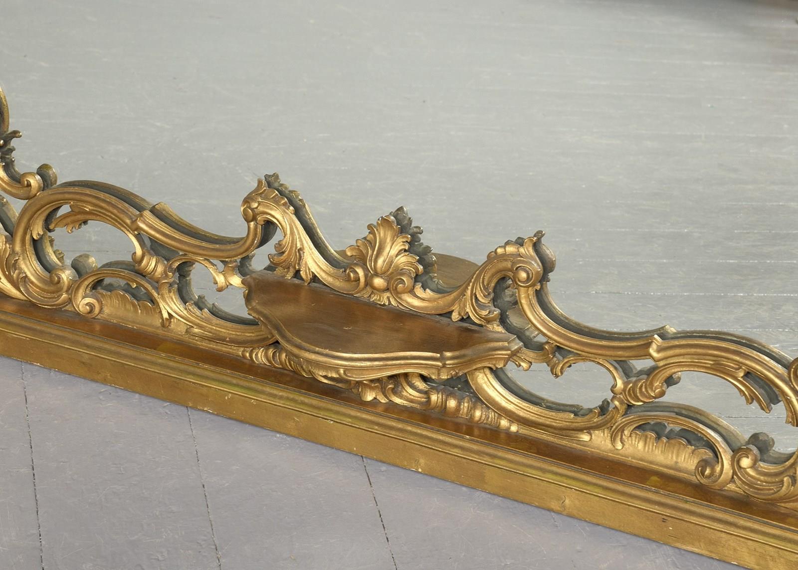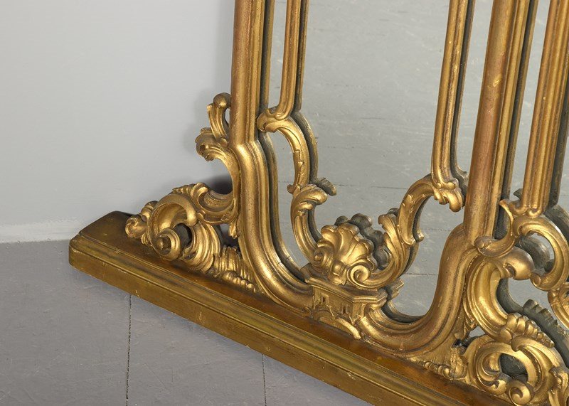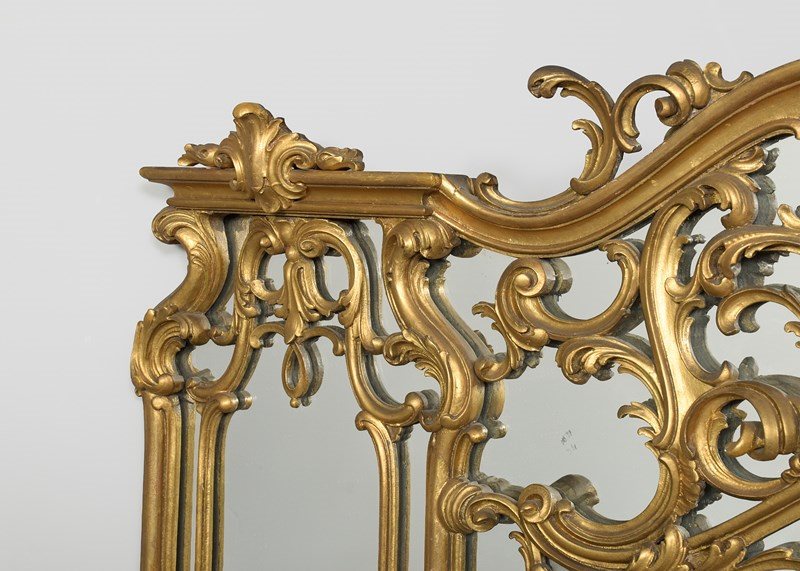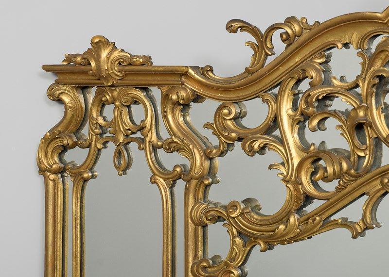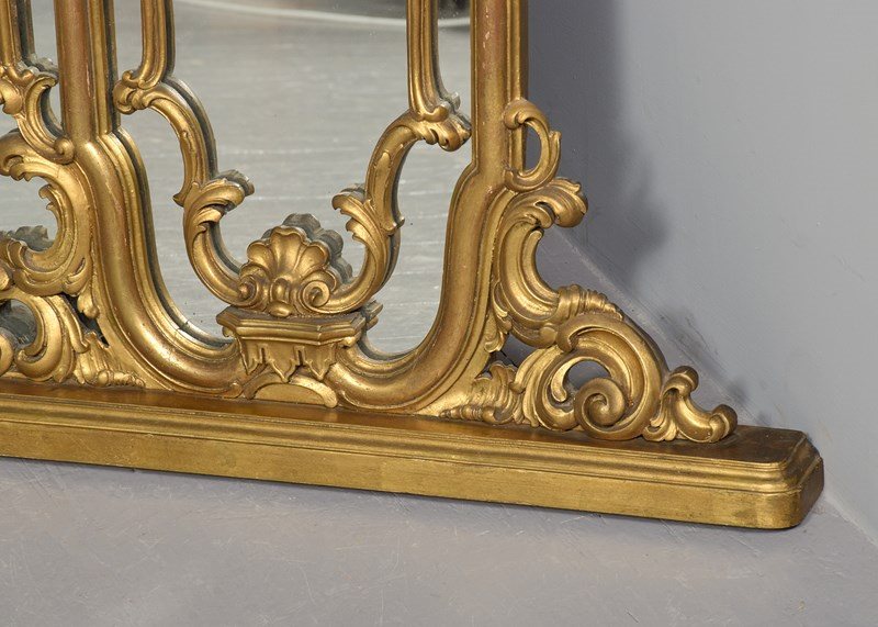 Circa 1880. A gilt overmantel mirror, consisting of one large plate shaped to follow the form of the frame, with open carved sections on top of the glass rather than having individual plates of glass. At the top is a carved pediment above a wonderful section of high Rococo with overlapping foliate carving. In the centre is a carved basket of flowers. At the base, there is another exuberant carved section and in the centre, a small shelf.