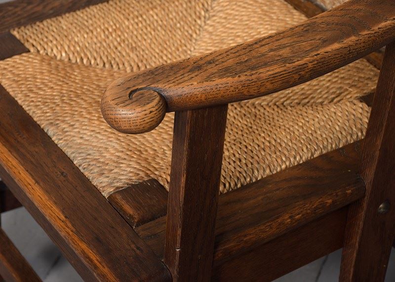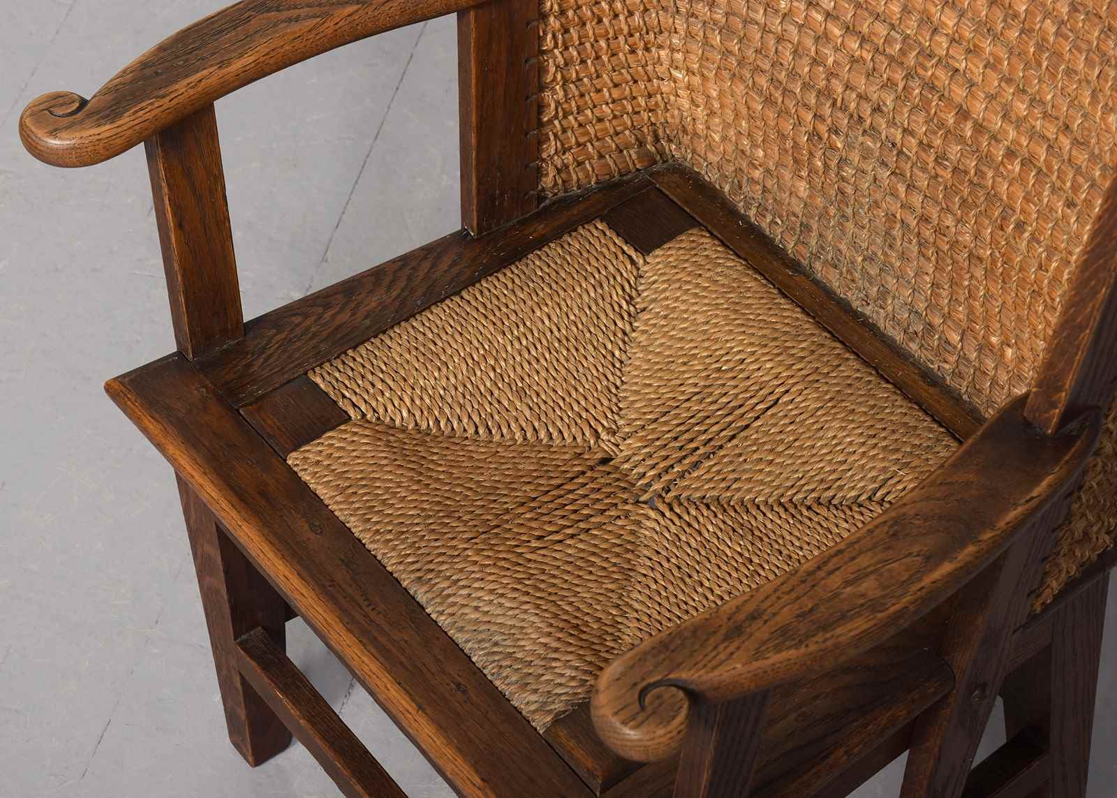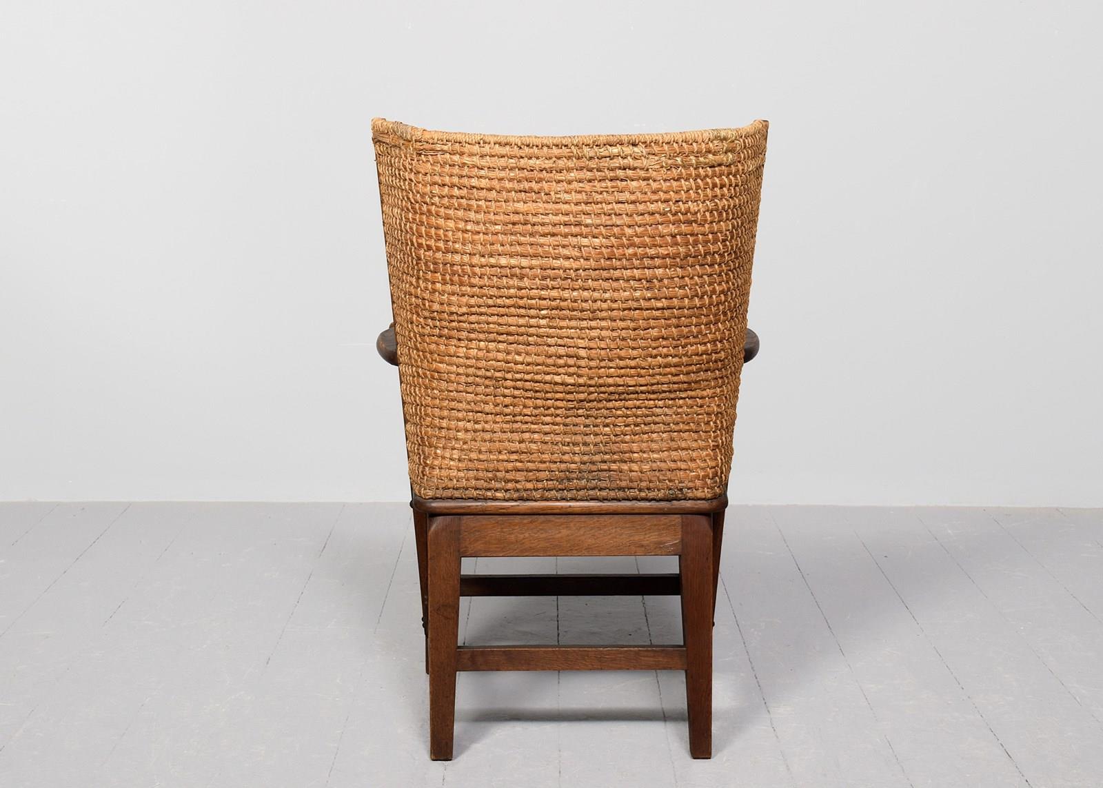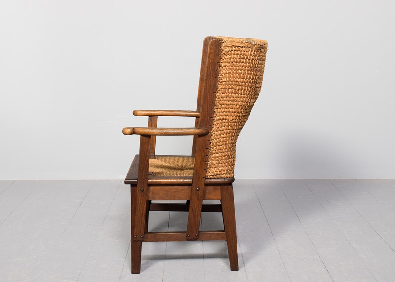 Circa 1990. A good quality oak framed straw back Orkney chair, by David Kirness. The handmade chair, with marram grass tied top rail, and woven marram grass drop-in seat, shaped arms with scrolled ends, held in place by 2 uprights, one forms the back and the other for support. Standing on 4 square legs, which taper slightly, united by stretchers on all sides.
