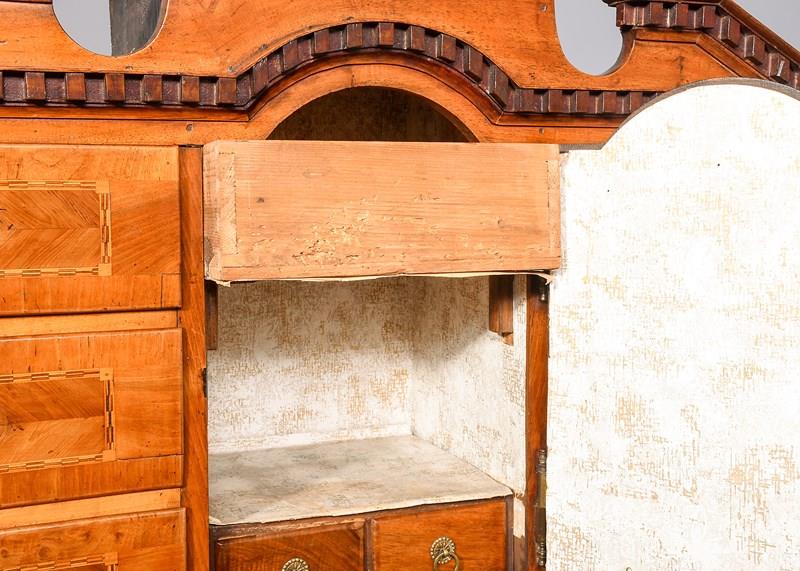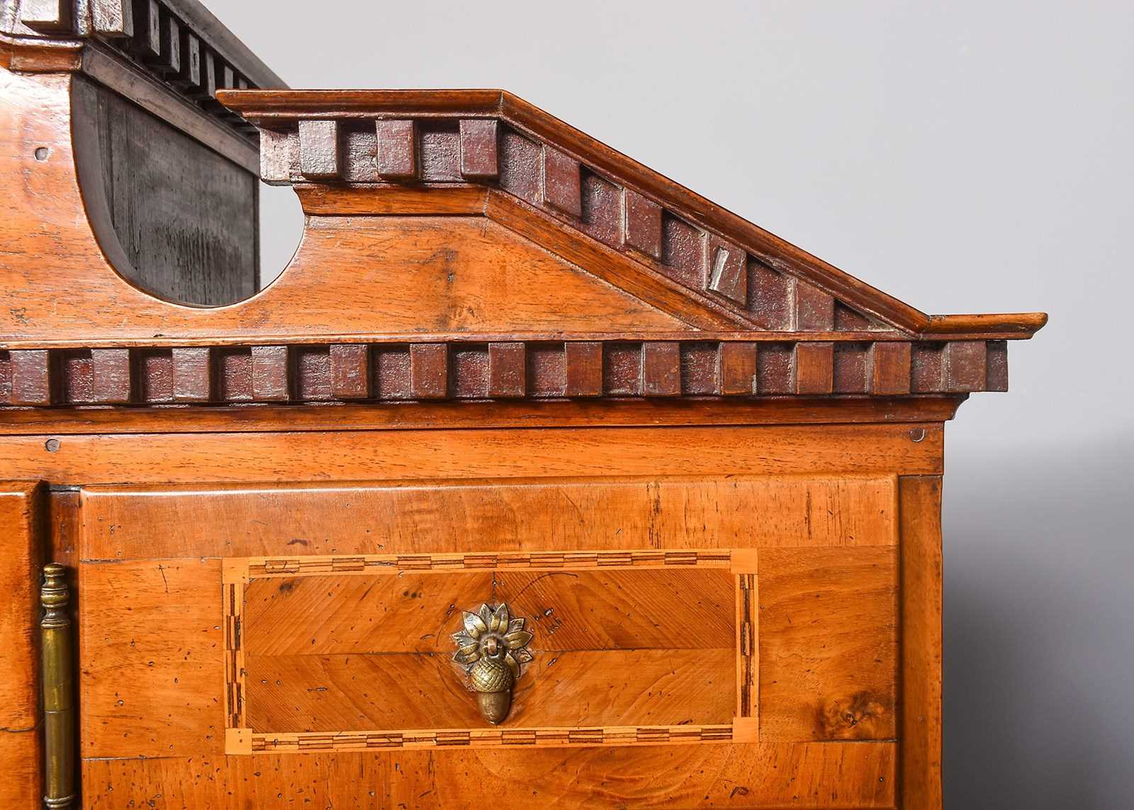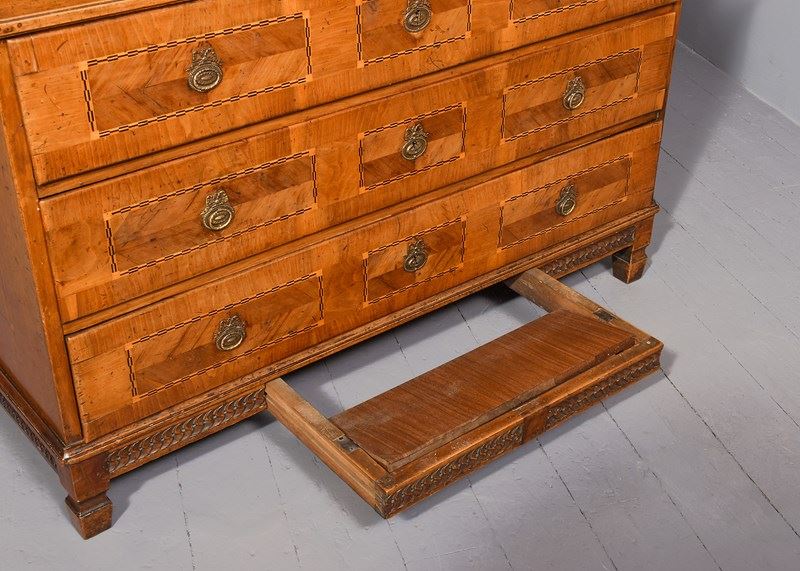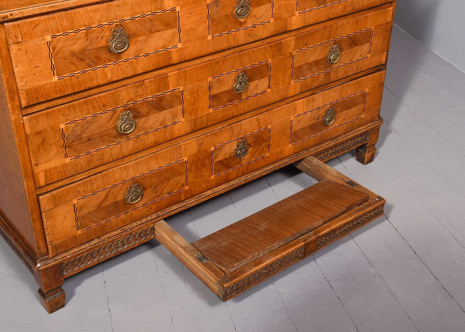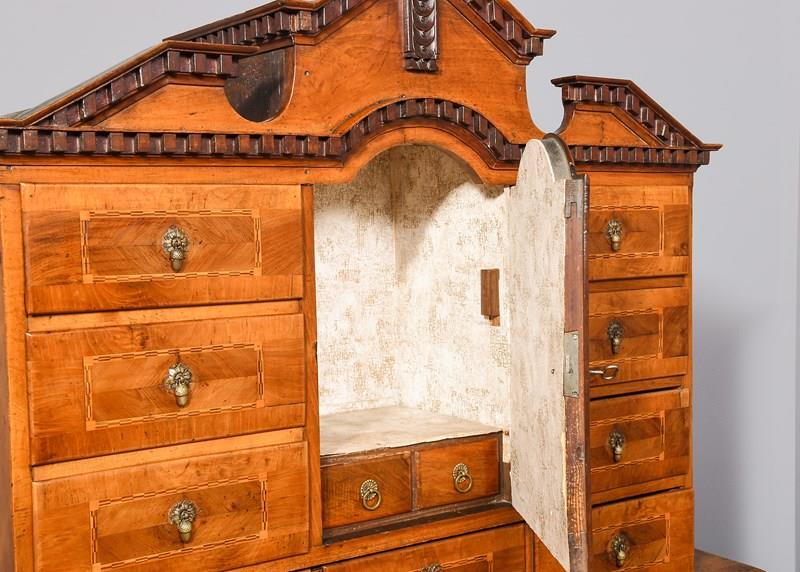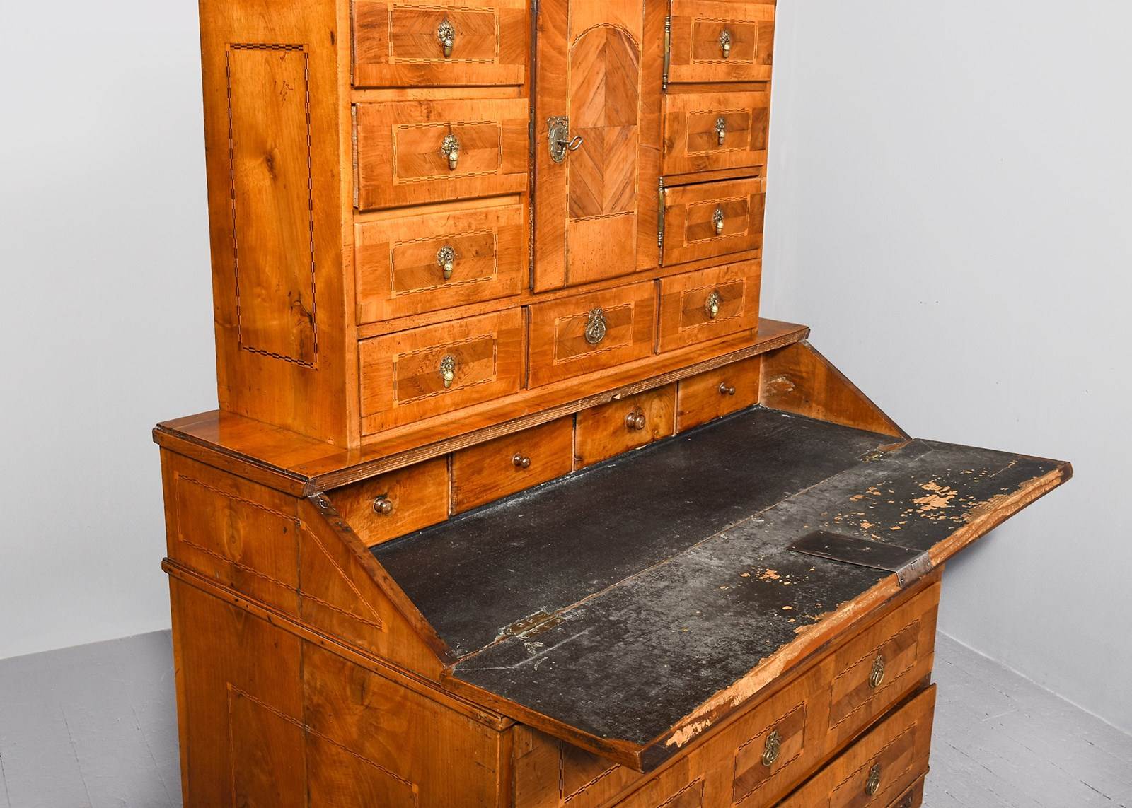 Circa 1780. A stylish walnut and yew-wood Austrian bureau bookcase, the top section with classic broken architectural pediment with dentilled detail on the front and sides with an interesting motif in the center, the front with a large arch door flanked by three drawers in walnut and yew with various bandings and with three drawers beneath, all with brass flower petal back plates and cast brass drops in the form of acorns. The central door with an elegant pierced escutcheon opens to reveal two drawers and a secret compartment, all the drawers with similar inlay, the flap with three panels and lifting handles on the flap, opens to reveal a simple and fitted interior with a bank of four drawers with turned knob handles, the base section with three full length drawers with inlaid panels similar to the flap, beneath the bottom drawer there is a carved moulding with an interesting pull-out section in the center to be used as a foot rest, all resting on four square tapering feet. The bookcase comes in two sections and has great colour and patination.
