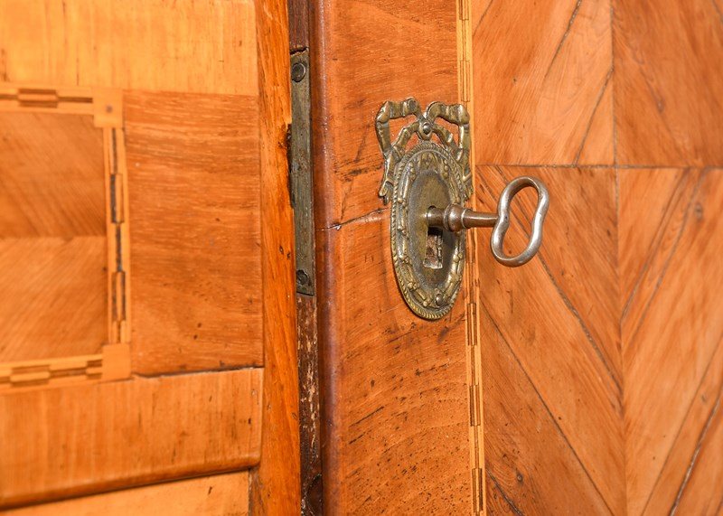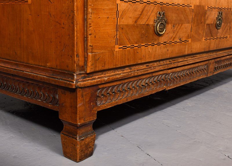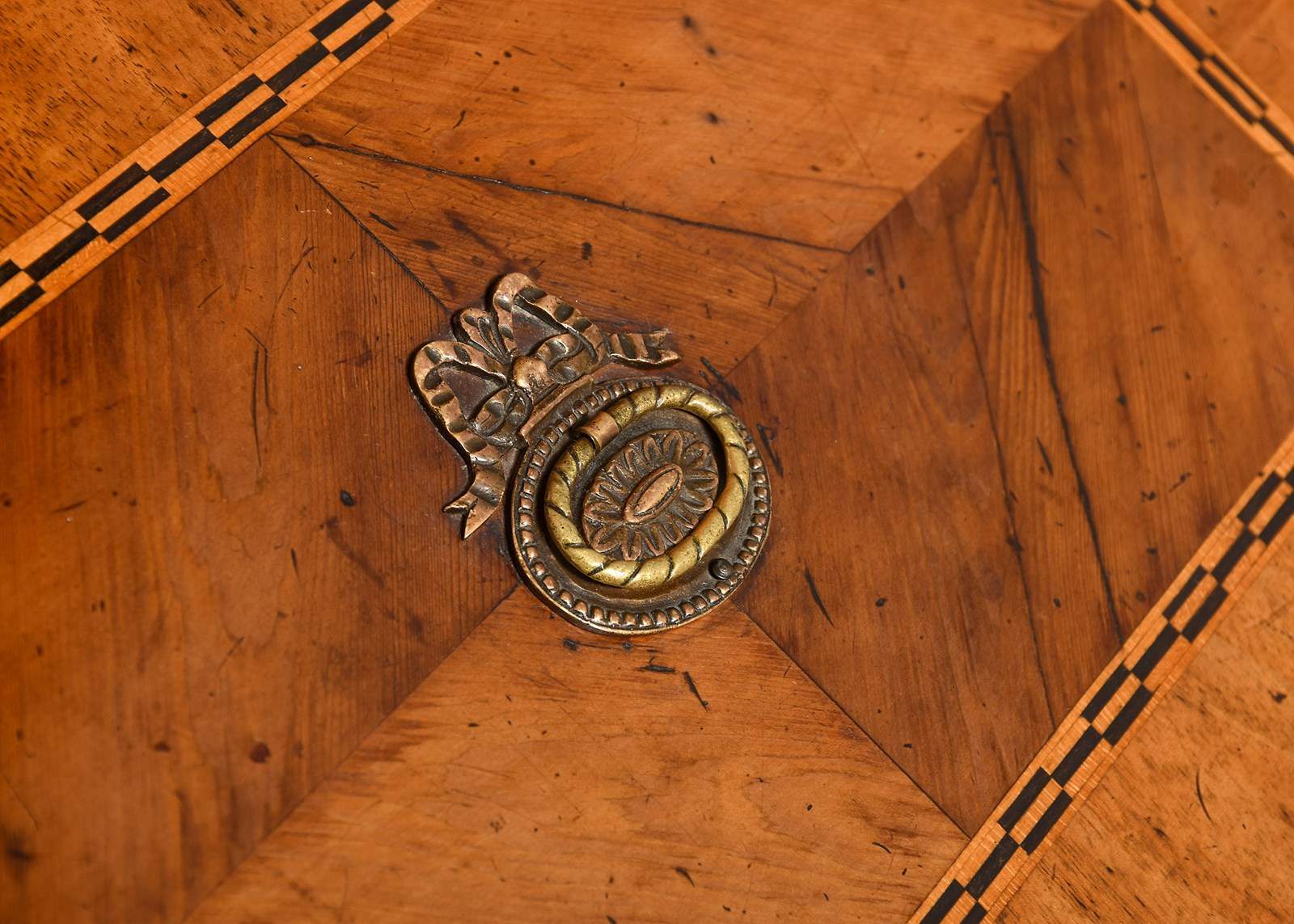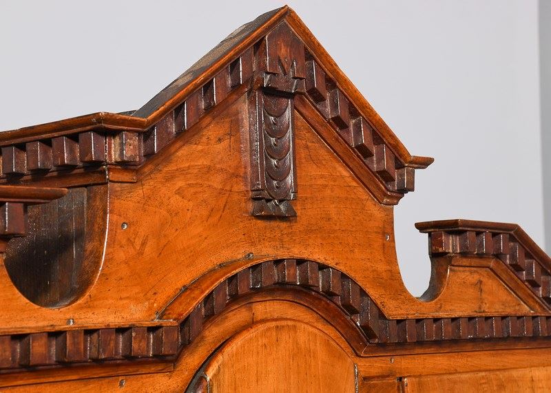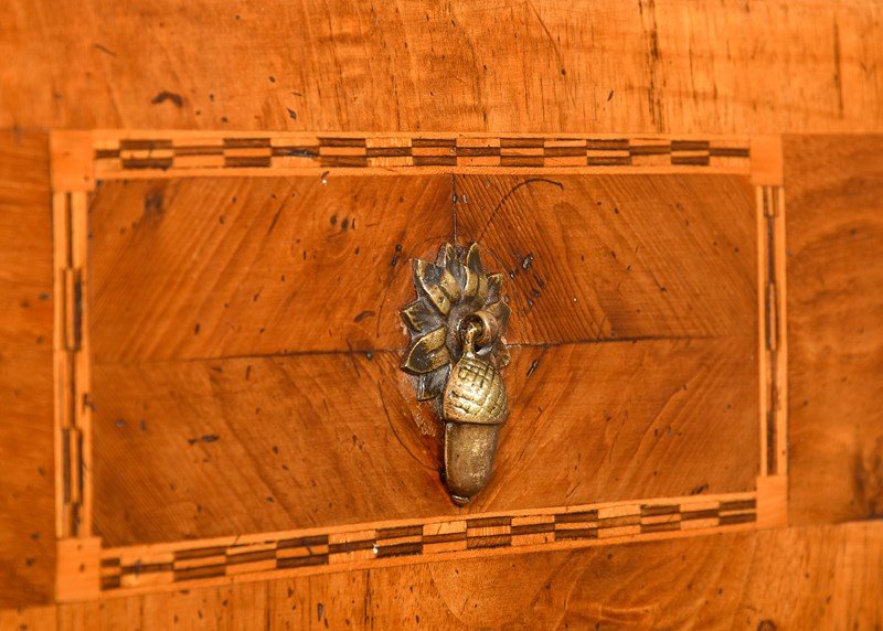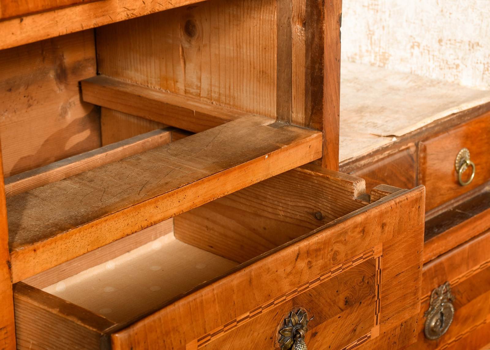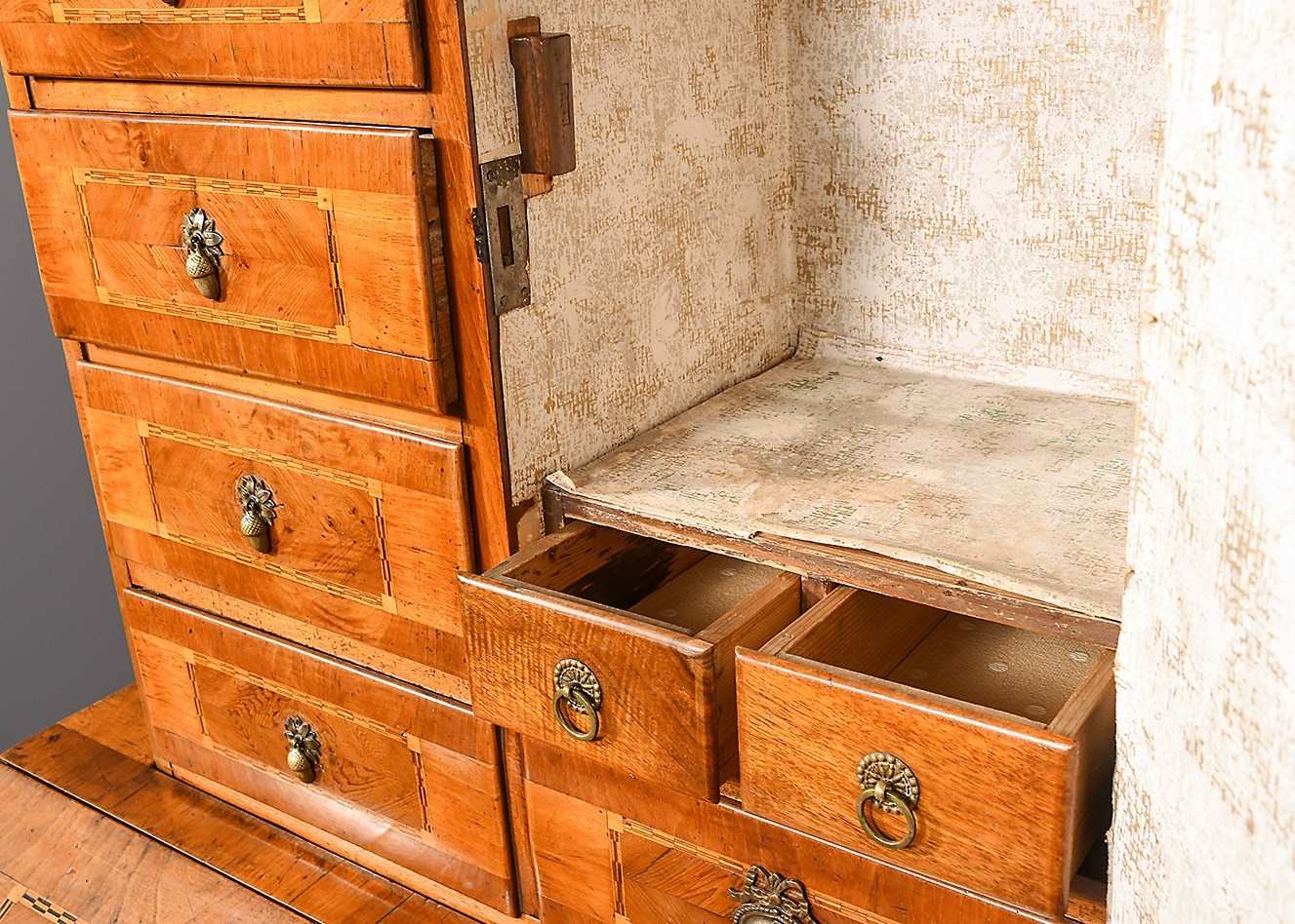 Circa 1780. A stylish walnut and yew-wood Austrian bureau bookcase, the top section with classic broken architectural pediment with dentilled detail on the front and sides with an interesting motif in the center, the front with a large arch door flanked by three drawers in walnut and yew with various bandings and with three drawers beneath, all with brass flower petal back plates and cast brass drops in the form of acorns. The central door with an elegant pierced escutcheon opens to reveal two drawers and a secret compartment, all the drawers with similar inlay, the flap with three panels and lifting handles on the flap, opens to reveal a simple and fitted interior with a bank of four drawers with turned knob handles, the base section with three full length drawers with inlaid panels similar to the flap, beneath the bottom drawer there is a carved moulding with an interesting pull-out section in the center to be used as a foot rest, all resting on four square tapering feet. The bookcase comes in two sections and has great colour and patination.