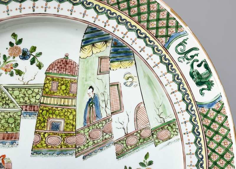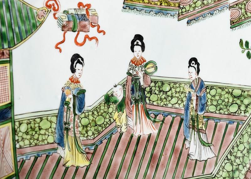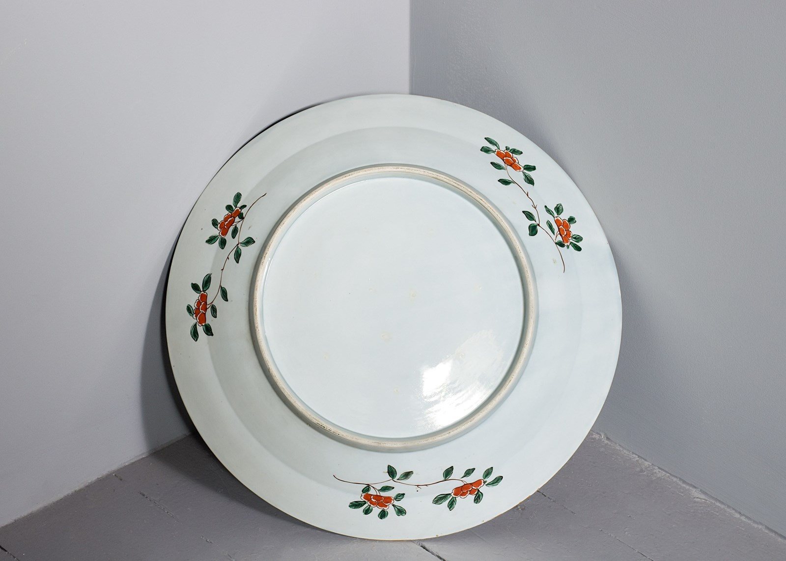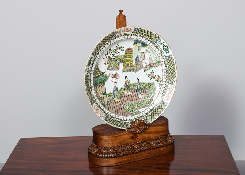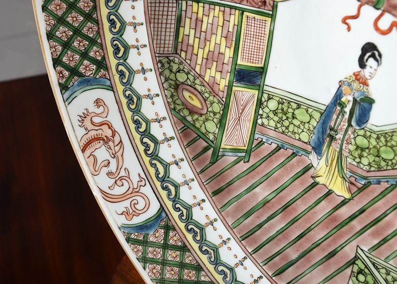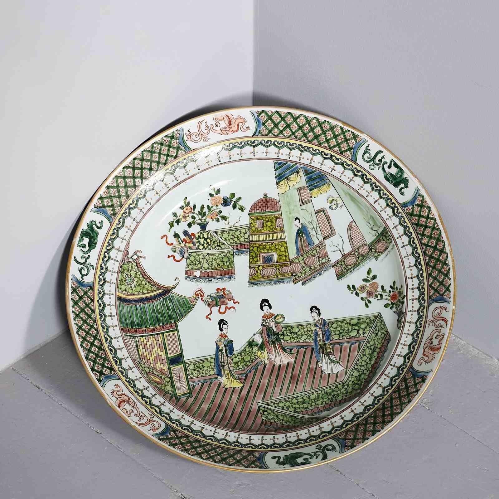 Circa 1890.A large Chinese Famille Verte porcelain charger or large plate from the Qing Dynasty. The decoration features hand-painted scenes of figures in traditional clothing and a landscape with buildings executed in the Famille Verte (green family) palette of oval glaze enamels, the border including a detailed diaper pattern interspersed with cartouche contained in decorative motifs. (These were mainly produced for export during the 18th and 19th centuries)